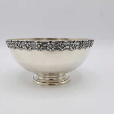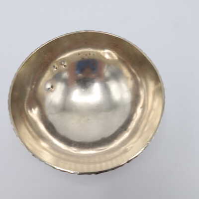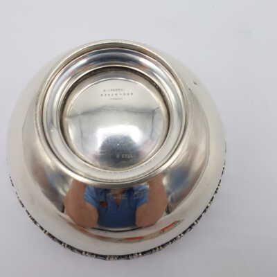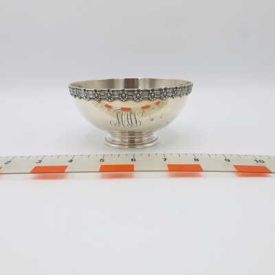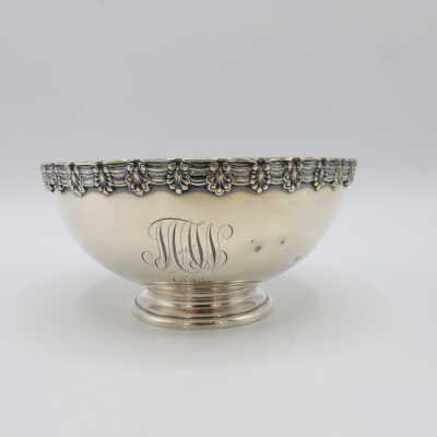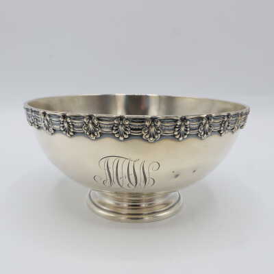This small footed bowl has a decorated rim and is engraved with the initials MAW for Mary Appleton Wood. On the bottom it is inscribed Tiffany and Co sterling. 8374T3927. 3 gill. A gill is a unit of liquid measurement.Context