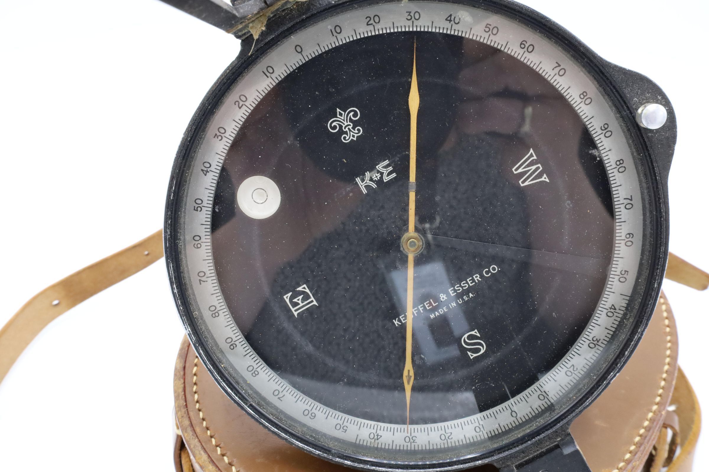 Large scale, black painted metal compass with a large face. Cardinal directions are marked with capital 'E,' 'W,' and 'S' with the north station filled by a stylized flourish. The face is marked with Keuffel & Esser Co. Made in the U.S.A. The compass needle is brass-tone, and there is a spirit level on the front of the compass.Collection