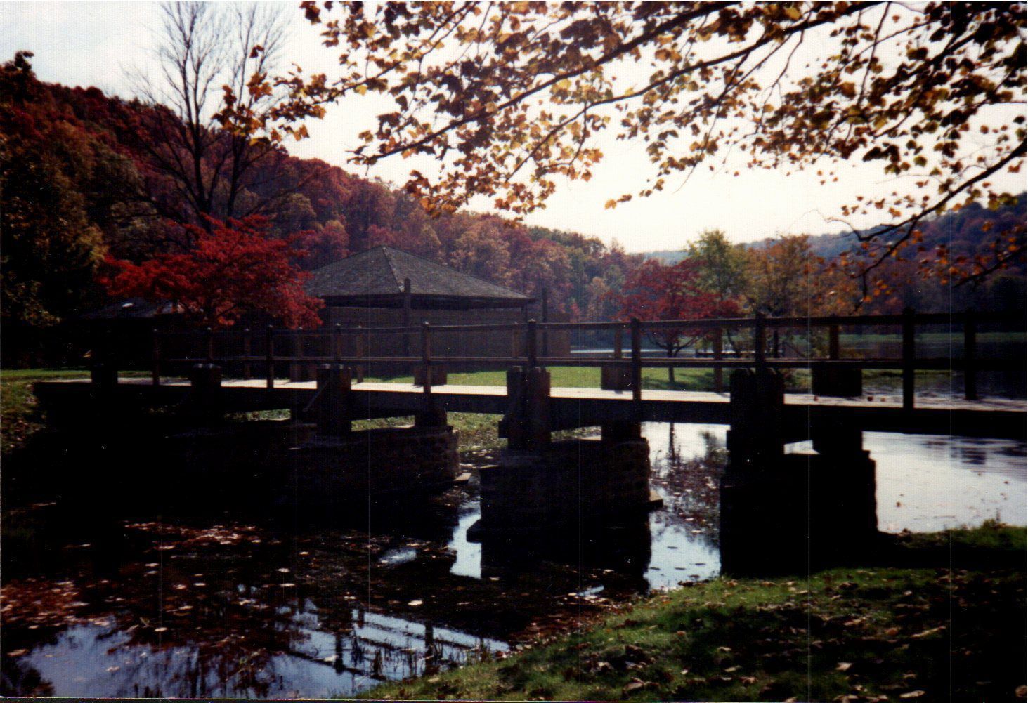 A bridge in Pike Lake State Park leads parkgoers to the swimming beach. The park experienced peak autumn color when this photograph was taken in October of 1988.Cataloged By