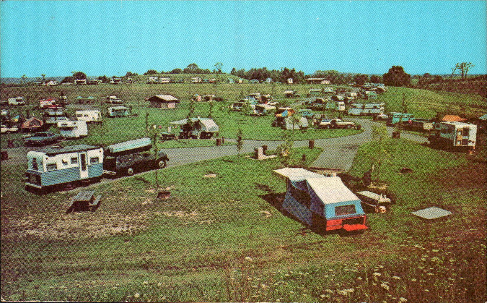 The campground at Dillon State Park is full of campers ready to enjoy their holiday. The bare landscape and saplings located at each campsite suggest this image was taken shortly after the park's opening in the 1960s.Cataloged By