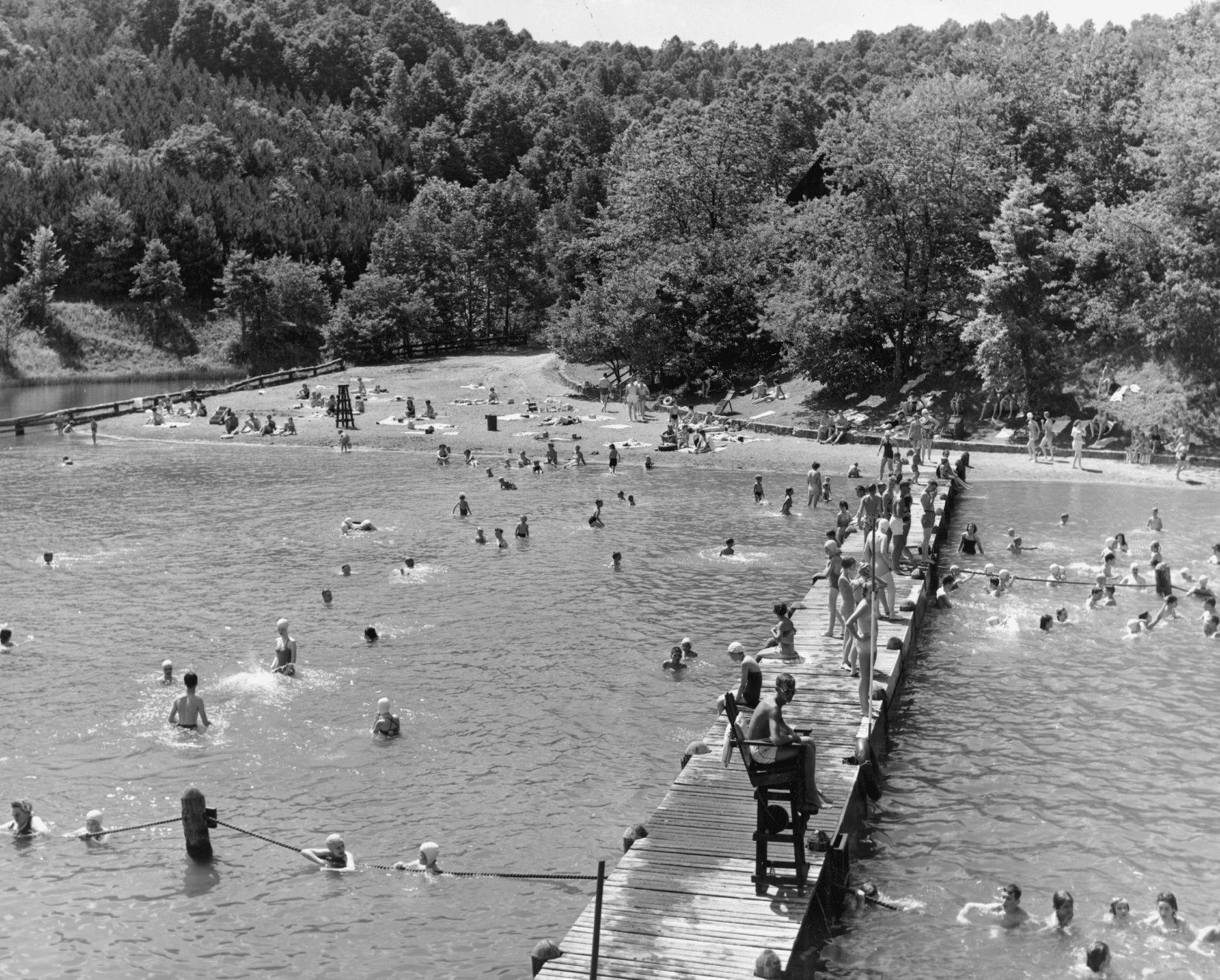 Parkgoers crowd the beach and swimming area at Lake Hope.