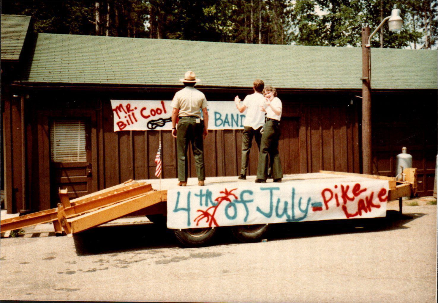The park staff at Pike Lake State Park prepare a float for their Fourth of July Celebration. One park ranger turns toward the camera and strikes a pose.