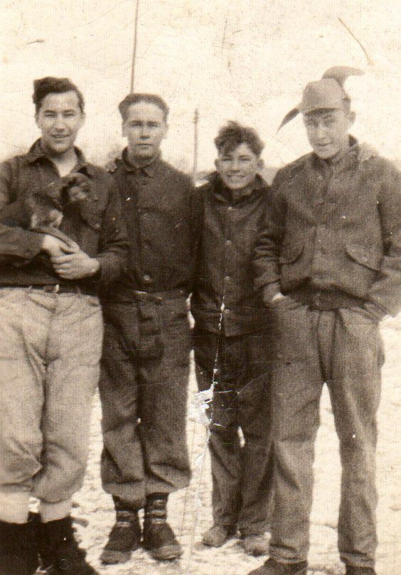 Four Civilian Conservation Corps (CCC) Enrollees from Company 503 pose for a picture on a cold winter day. One of the enrollees holds his pet dog.
