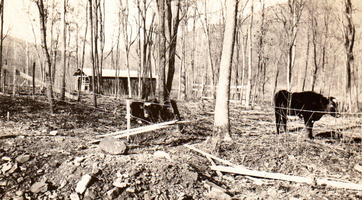 Two cows sit behind a barbed wire fence in a wooded pasture. Their barn is in the picture's background. This image likely depicts a subsistence farm that was on land that became Camp Pike-the headquarters of Civilian Conservation Corps (CCC) Company 503.