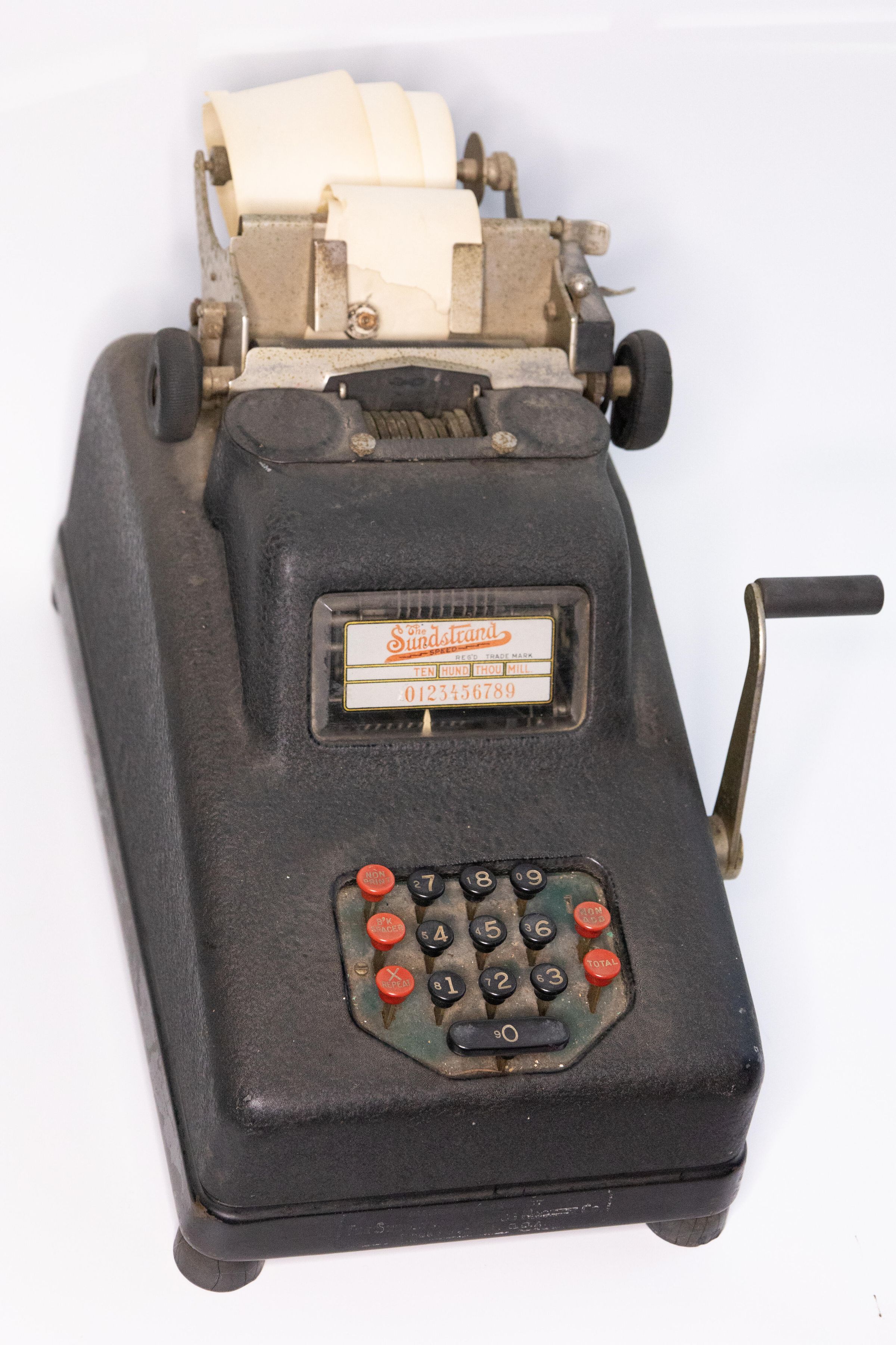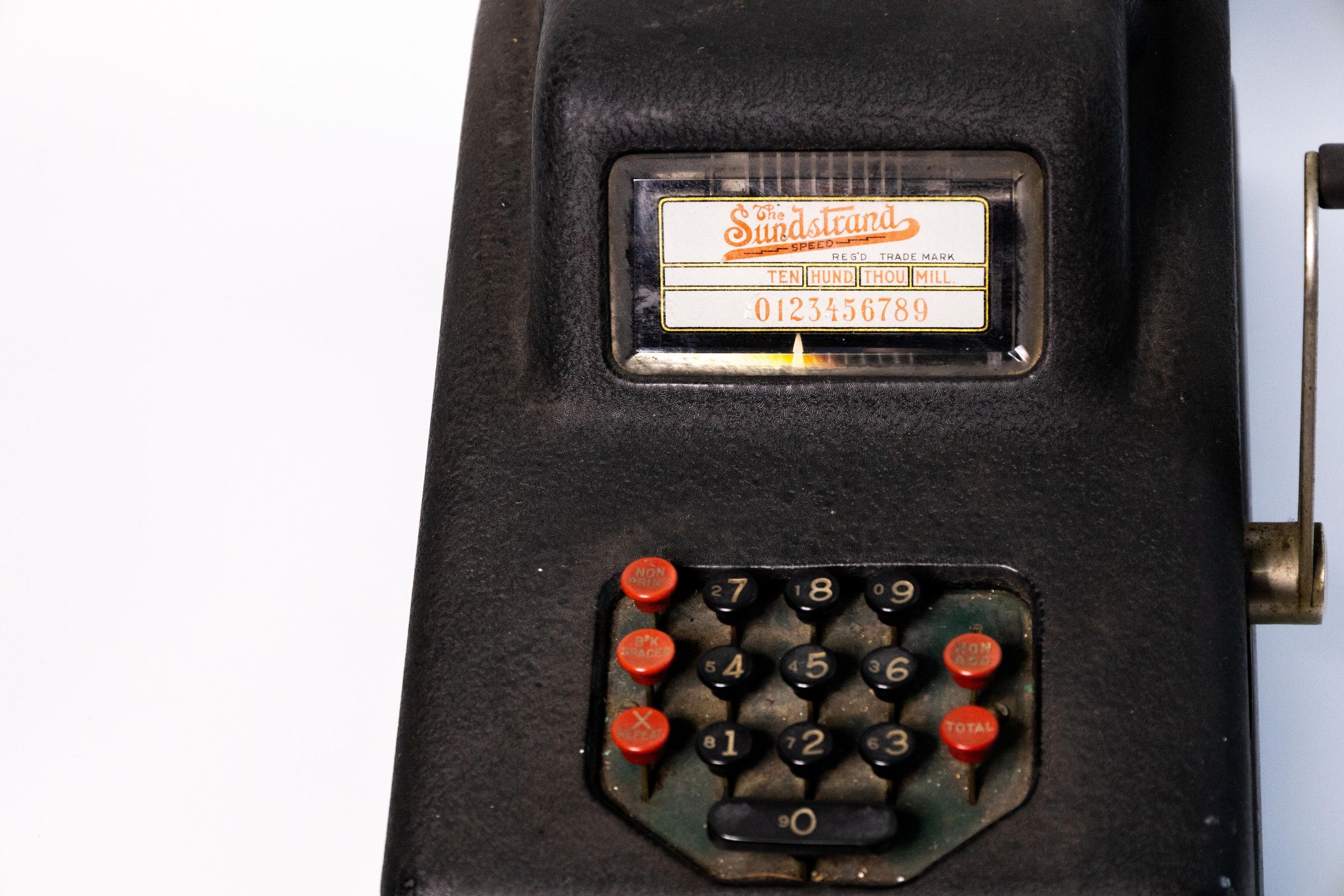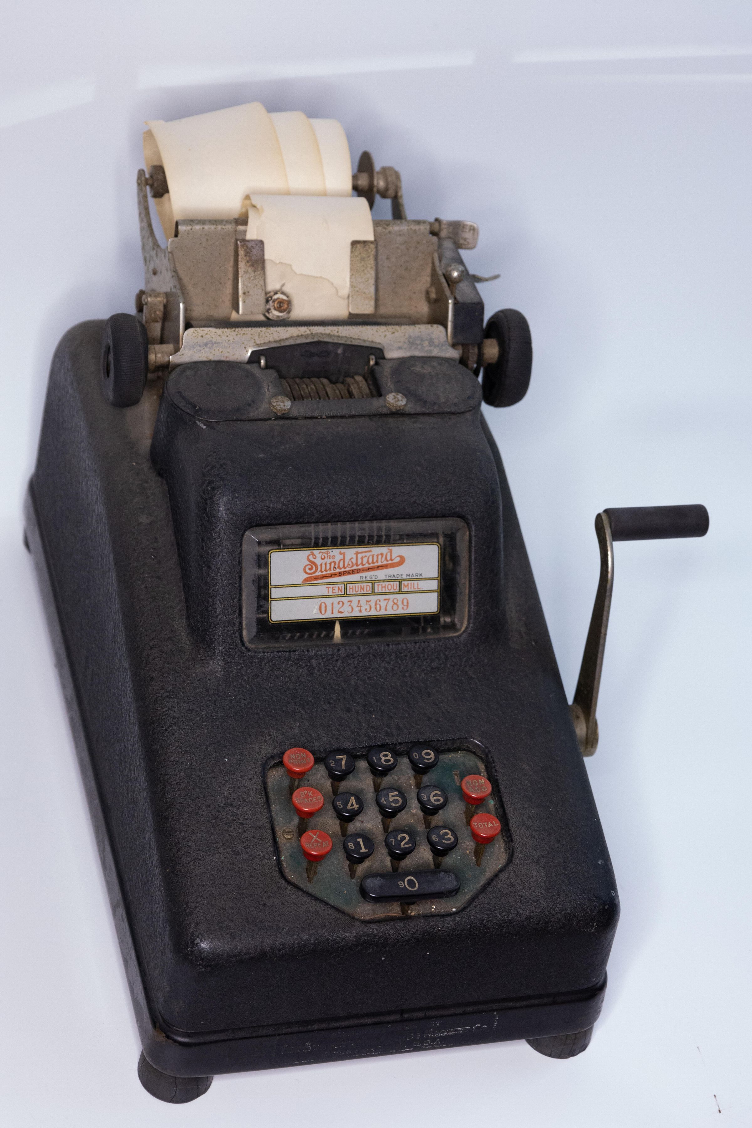 Adding machines are a specific type of mechanical calculator most often used in bookkeeping. These 10-key machines allowed for simple and subtraction. Some could multiply or divide. But their main purpose was to keep track of long series of numbers, which would be reproduced on the roll of paper--or tape--at the top of the machine. This adding machine includes five red control buttons which read: non-print, backspace, repeat, non-add, and total.