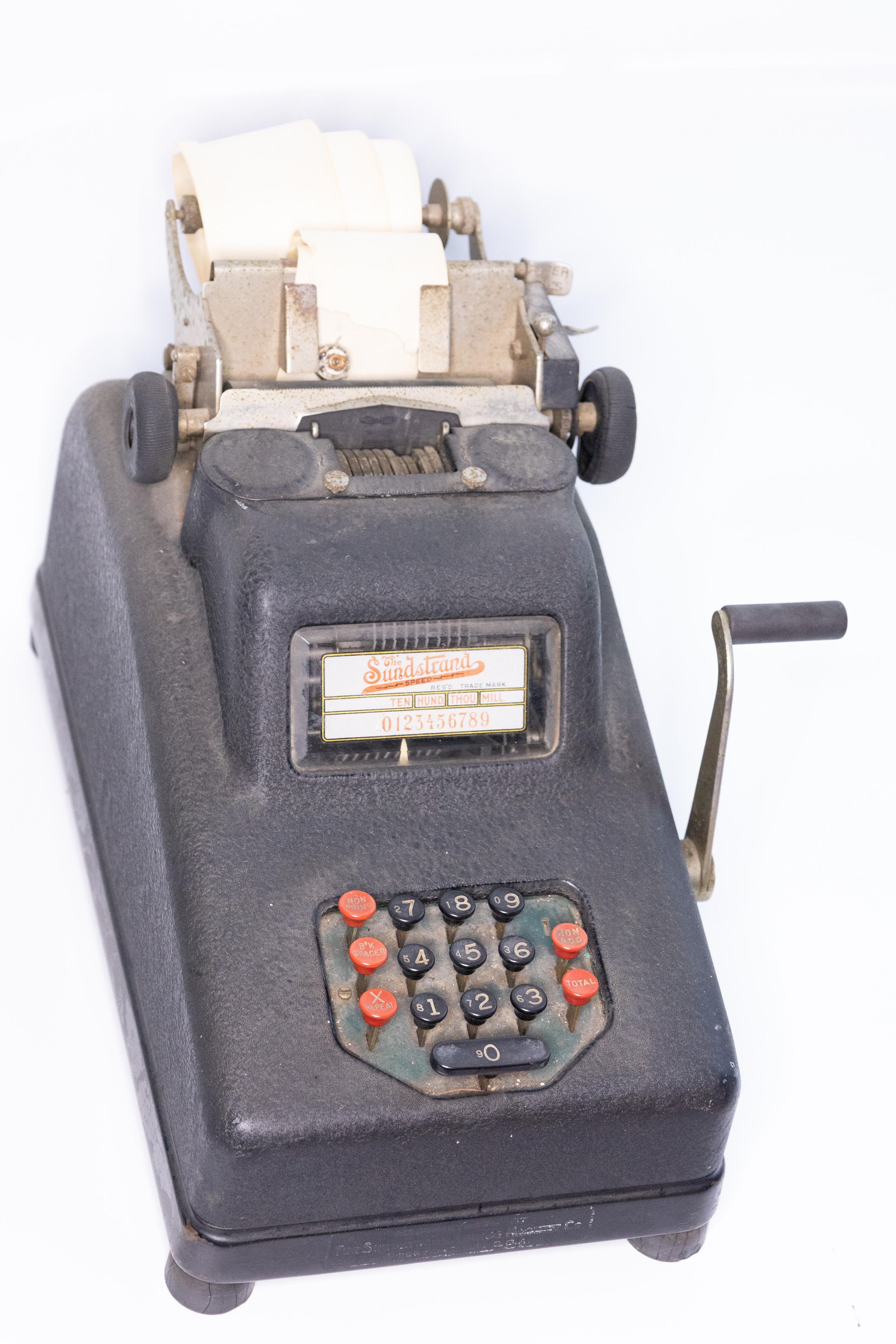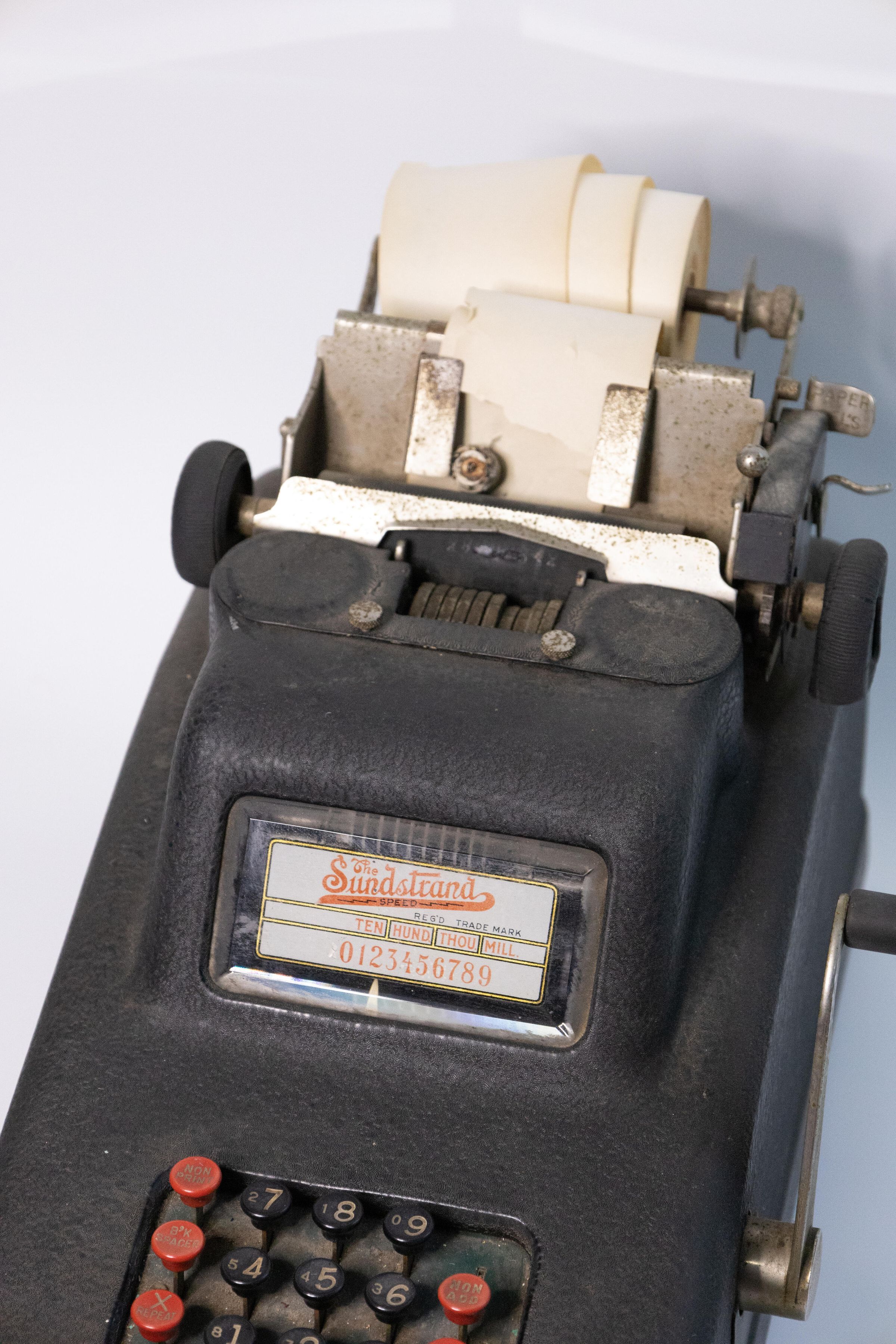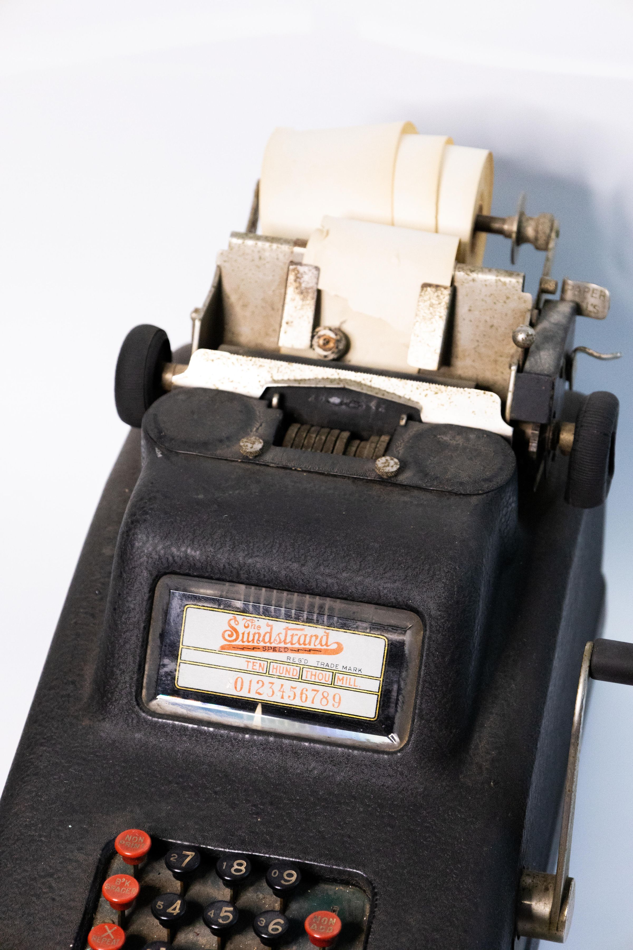 Adding machines are a specific type of mechanical calculator most often used in bookkeeping. These 10-key machines allowed for simple and subtraction. Some could multiply or divide. But their main purpose was to keep track of long series of numbers, which would be reproduced on the roll of paper--or tape--at the top of the machine. This adding machine includes five red control buttons which read: non-print, backspace, repeat, non-add, and total.