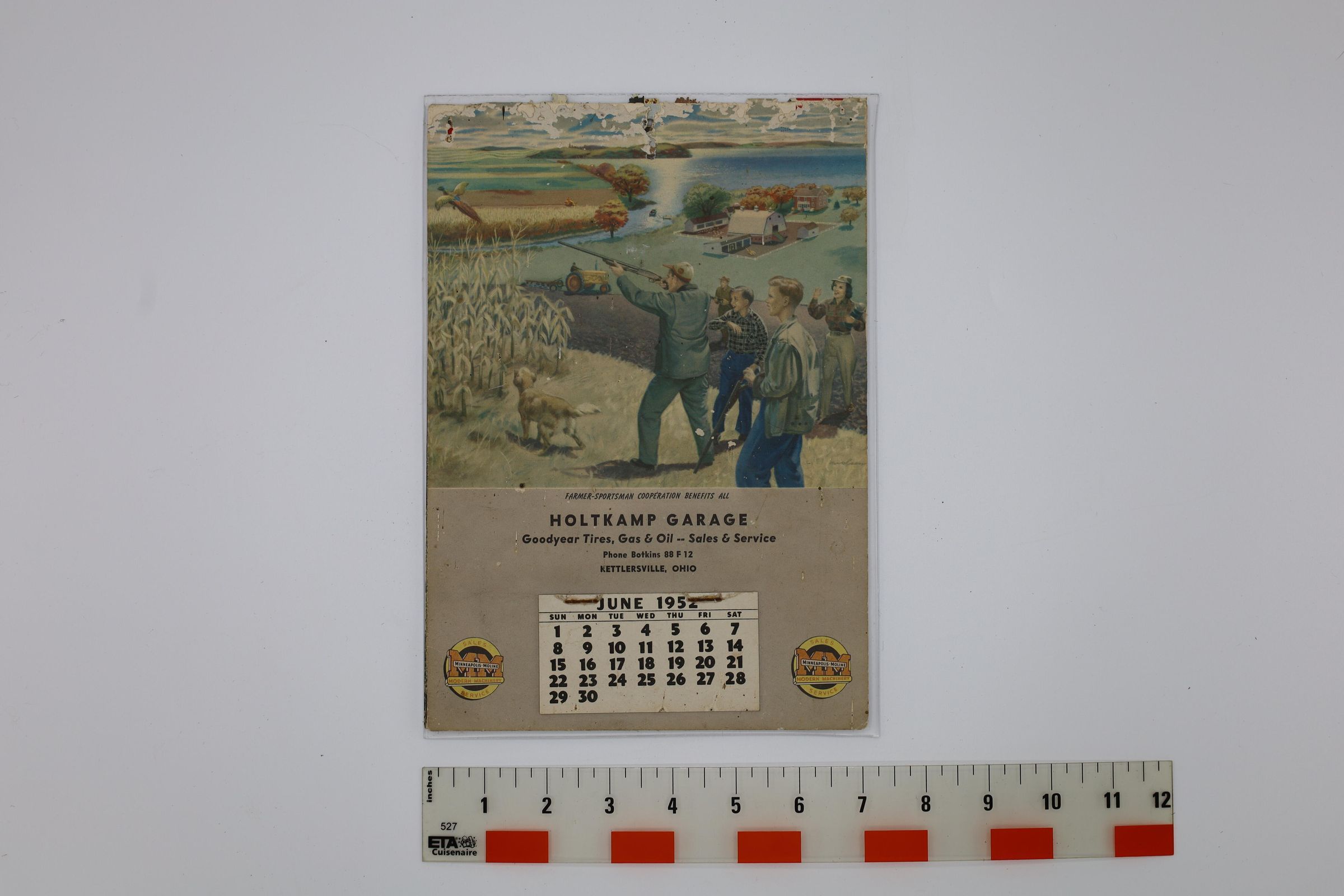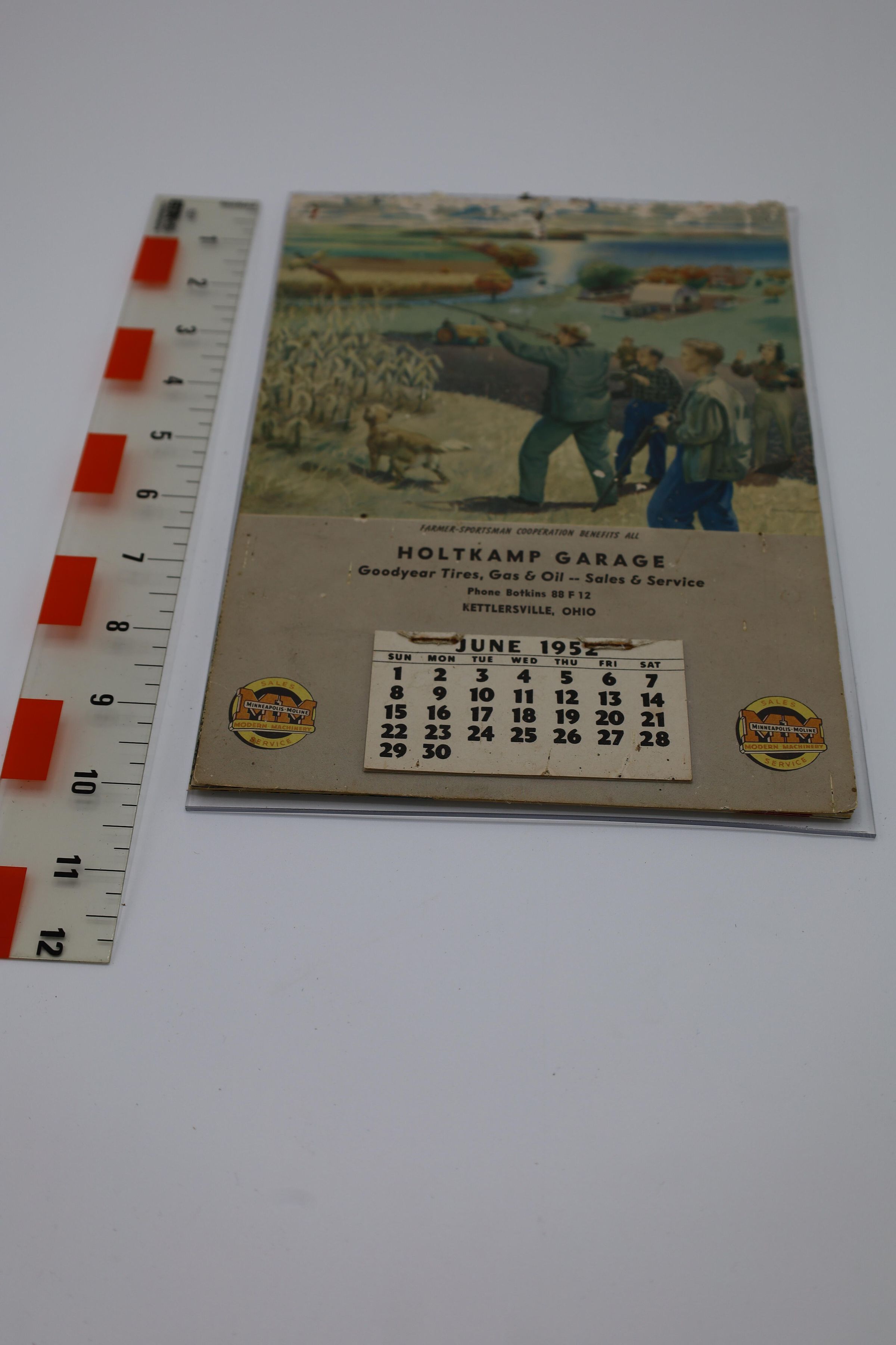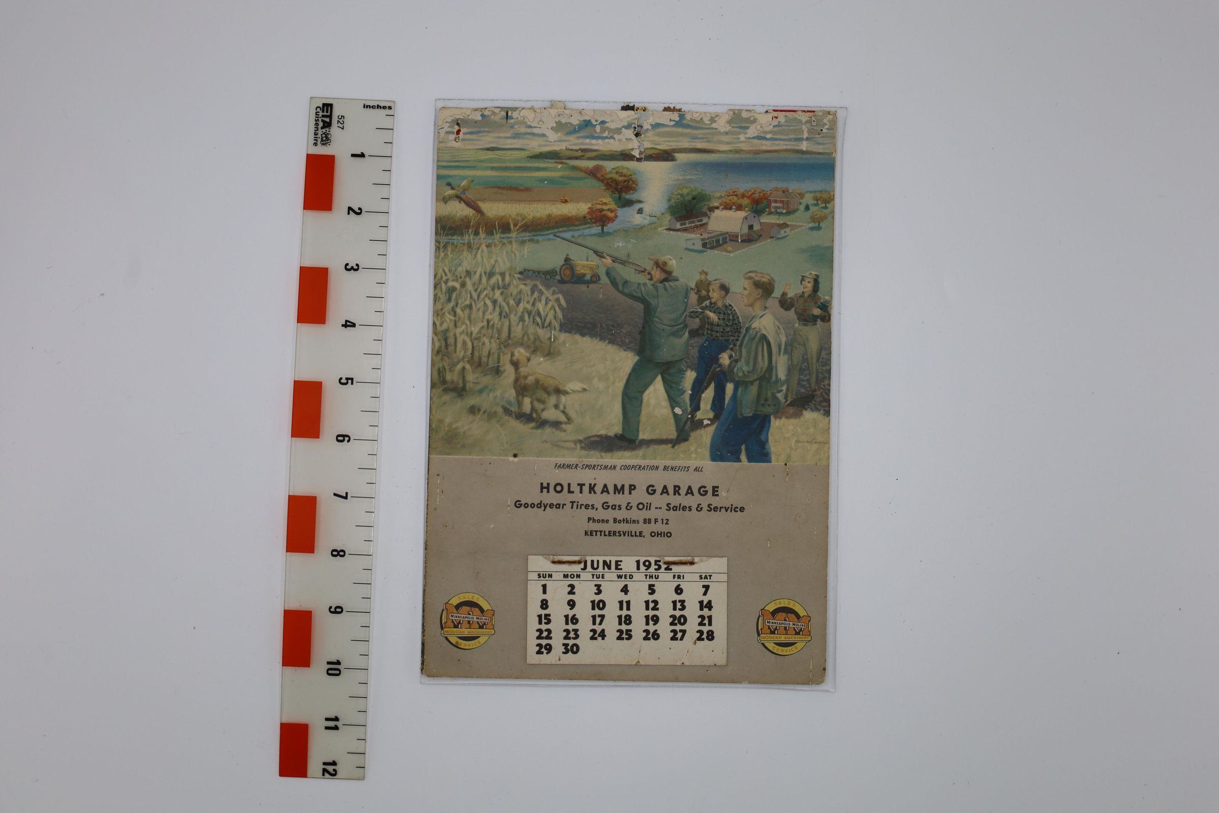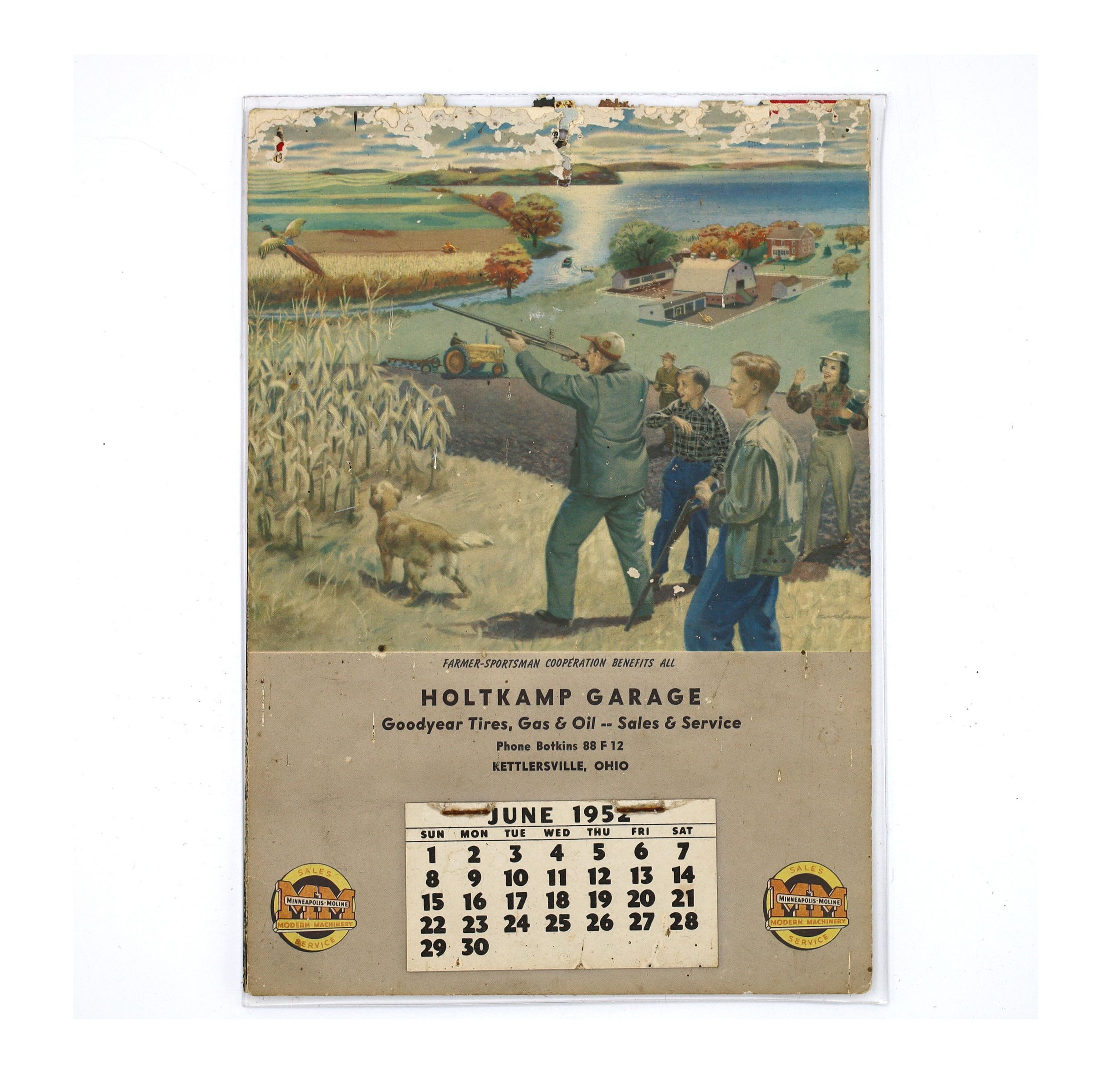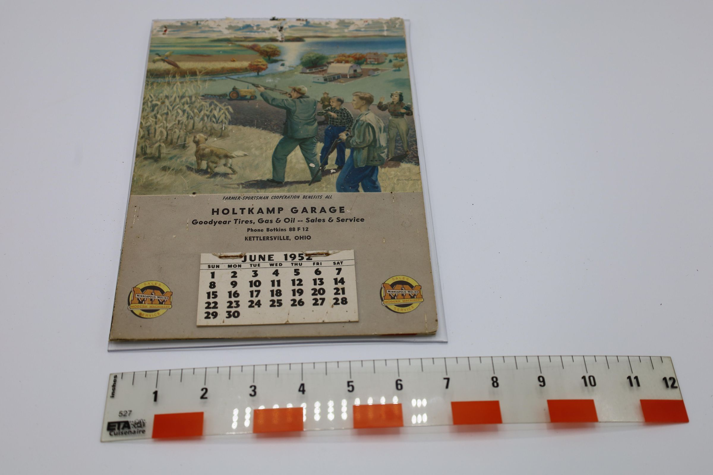 This Minneapolis Moline Farm Equipment advertisement calendar from 1952 was found between the walls of a Thelma Drive shed on Filburns Island. The picture at the top is of sportsmen hunting on a farm and has the phrase "Farmer-Sportsmen Cooperation Benefits All" under the image. It appears to have been used for advertising the Holtkamp Garage in Kettlersville, Ohio. Luke Koors donated this piece.Location