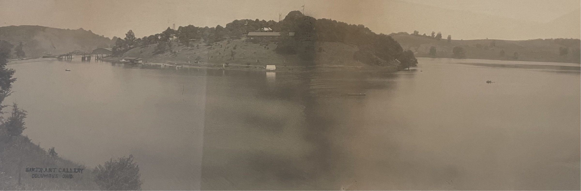 A photograph of the amusement park Alma Lake Park looking across Alma Lake. The island in the background (accessed by the bridge on the far right) held most of the park's attractions. Some parkgoers are paddling boats along the lake.