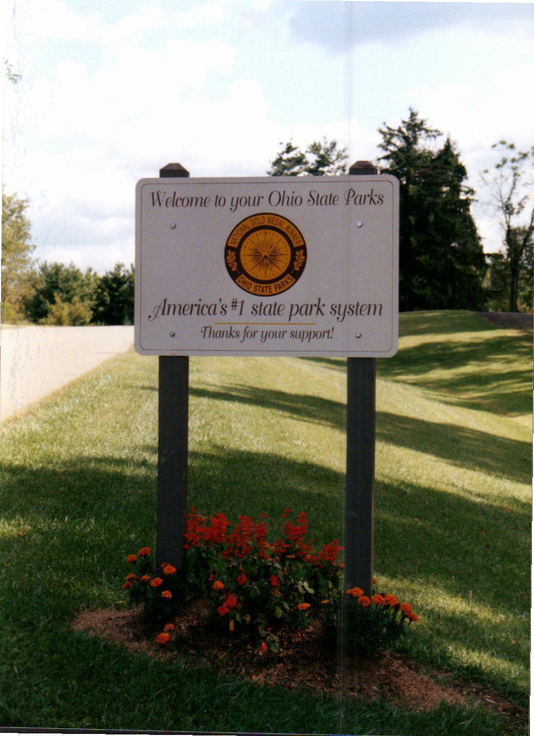 Burr Oak State Park displays their National Gold Medal Winner sign that honors the Ohio state park system's 1997 achievement as the top state park system in long-range planning, resource management, and innovative approaches to delivering superb park and recreation services alongside fiscally sound business practices.