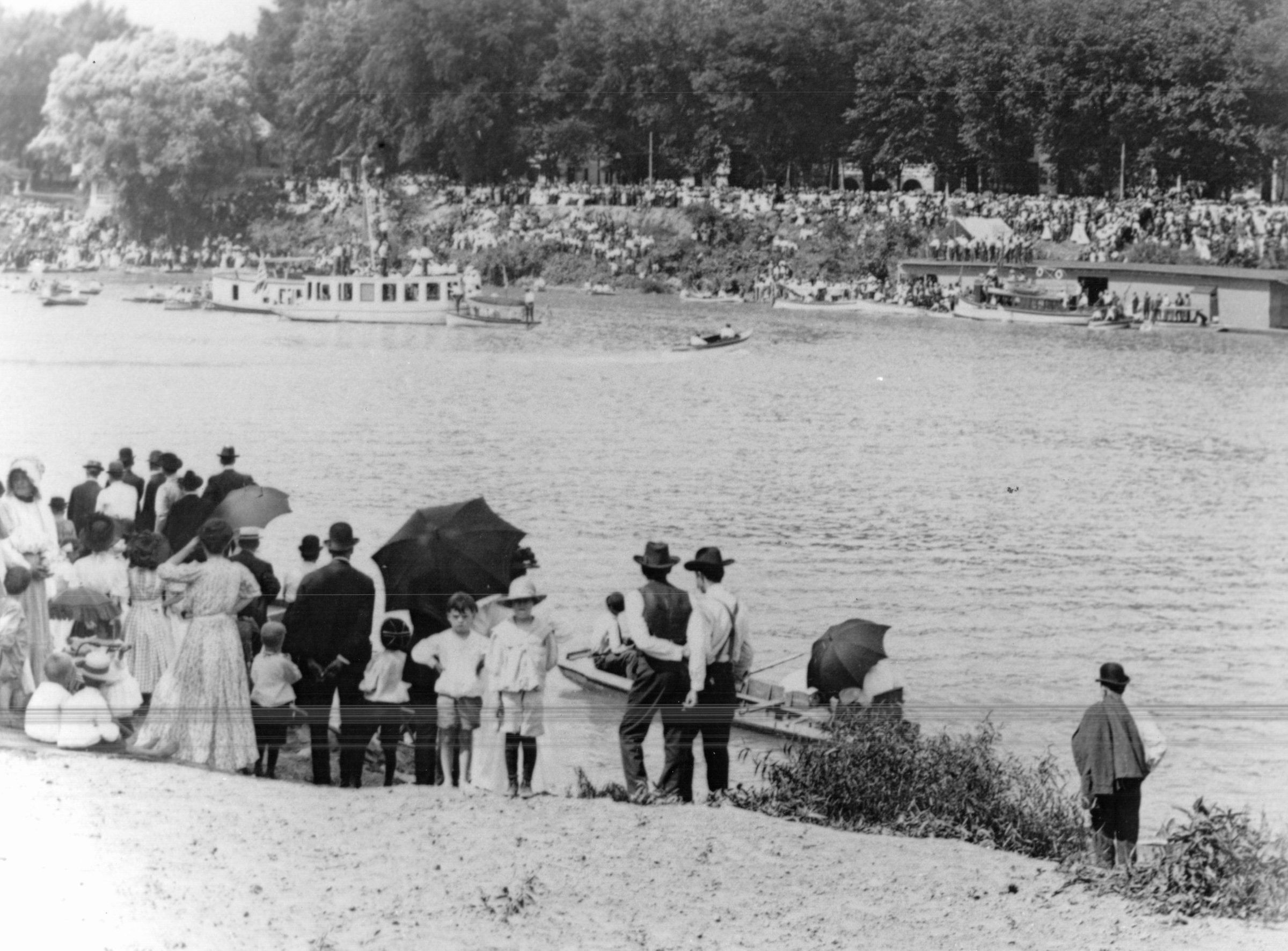 A large crowd of smartly-dressed spectators watch a heated boat race on the Muskingum River. Two boys take a break to pose for a photograph together.Cataloged By