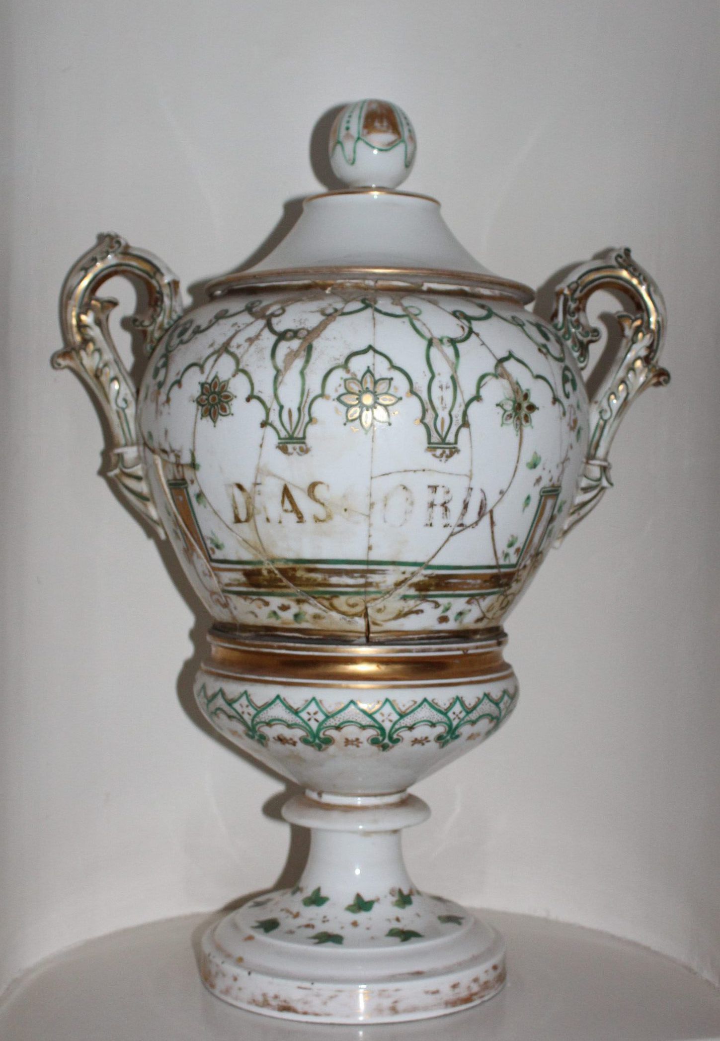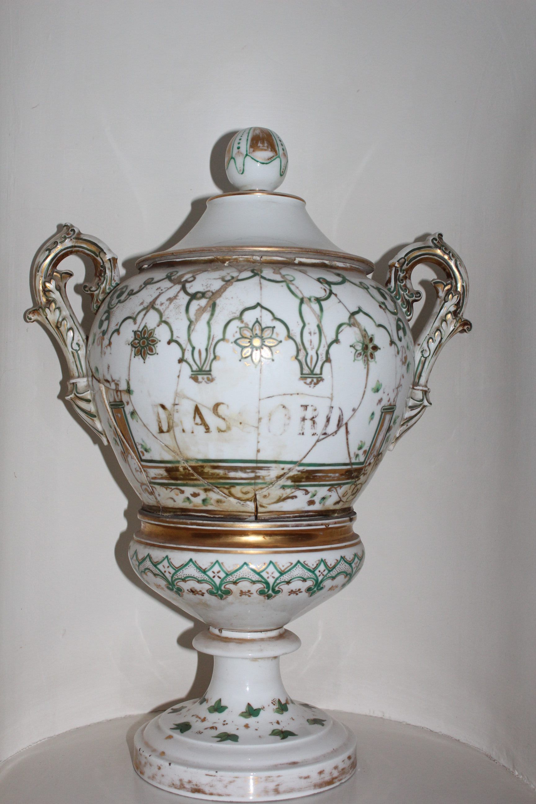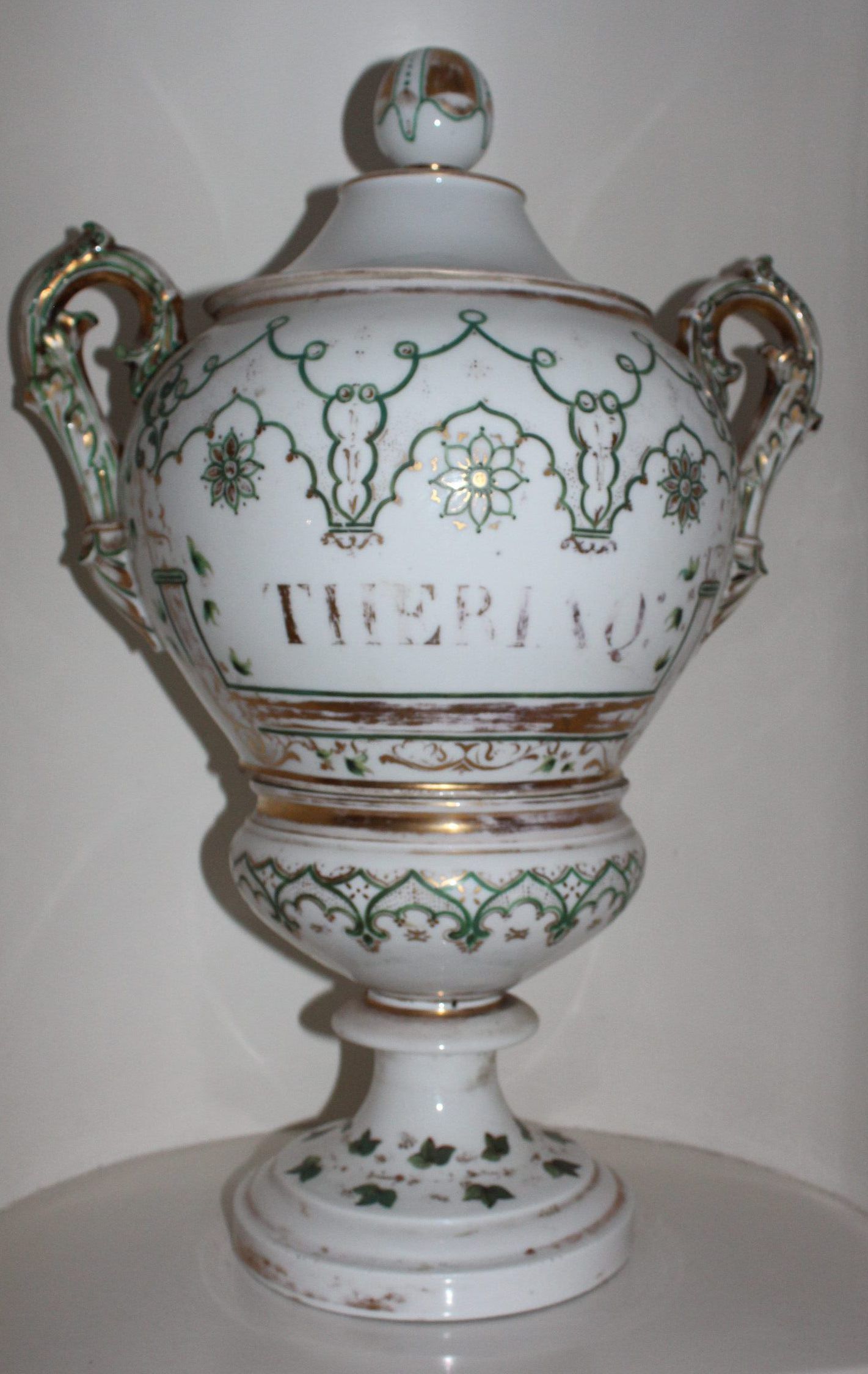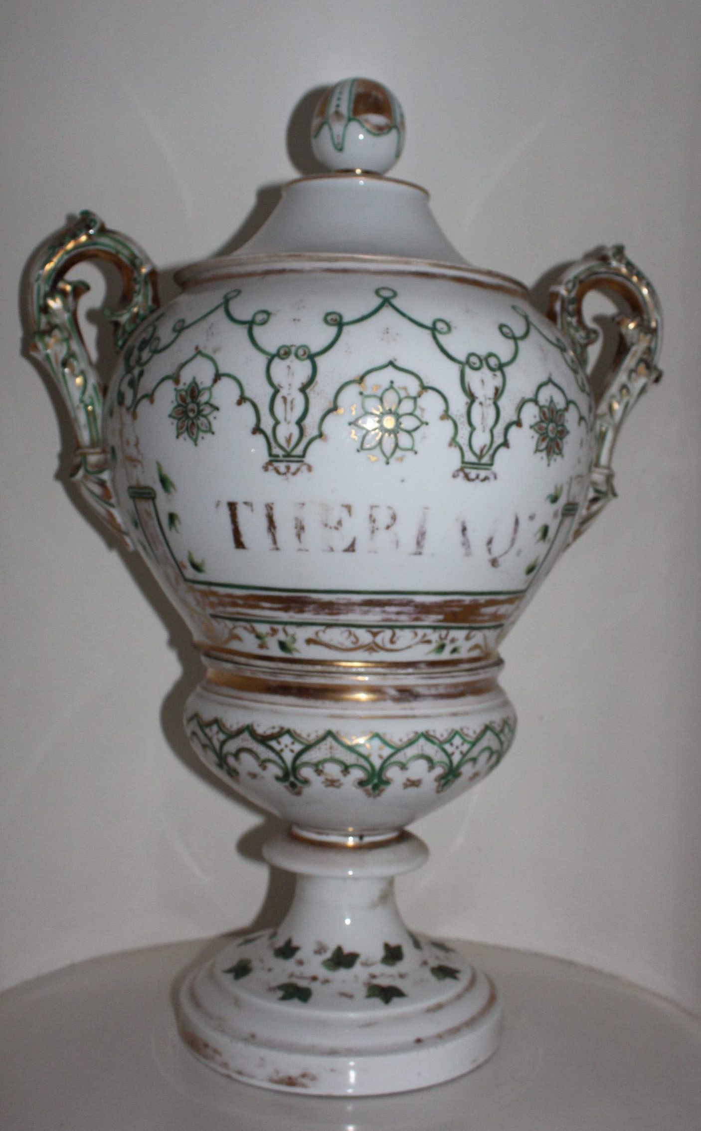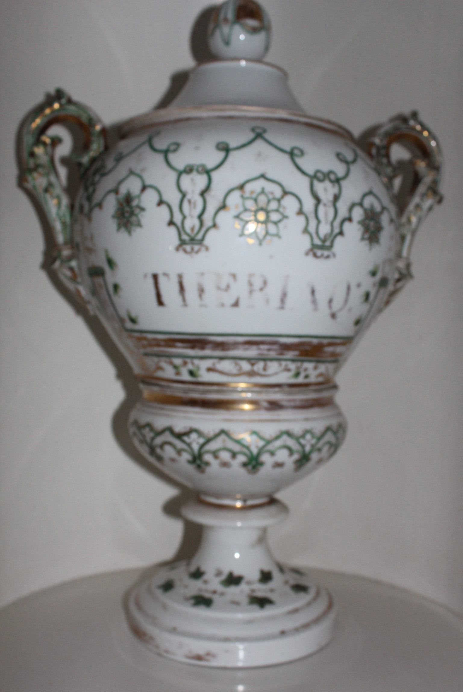 While neither of these were used to store medicines in the Bromfield home, that was their original use. Theriaq/theriaque, or theriac in English, refers to a mixture believed to cure illnesses caused by any number of poisons. Diascordium also refers to a mixture, but this a mixture of herbs that often includes an opiate. It was widely used used, although eventually the opiate element of the mixture was removed.Location