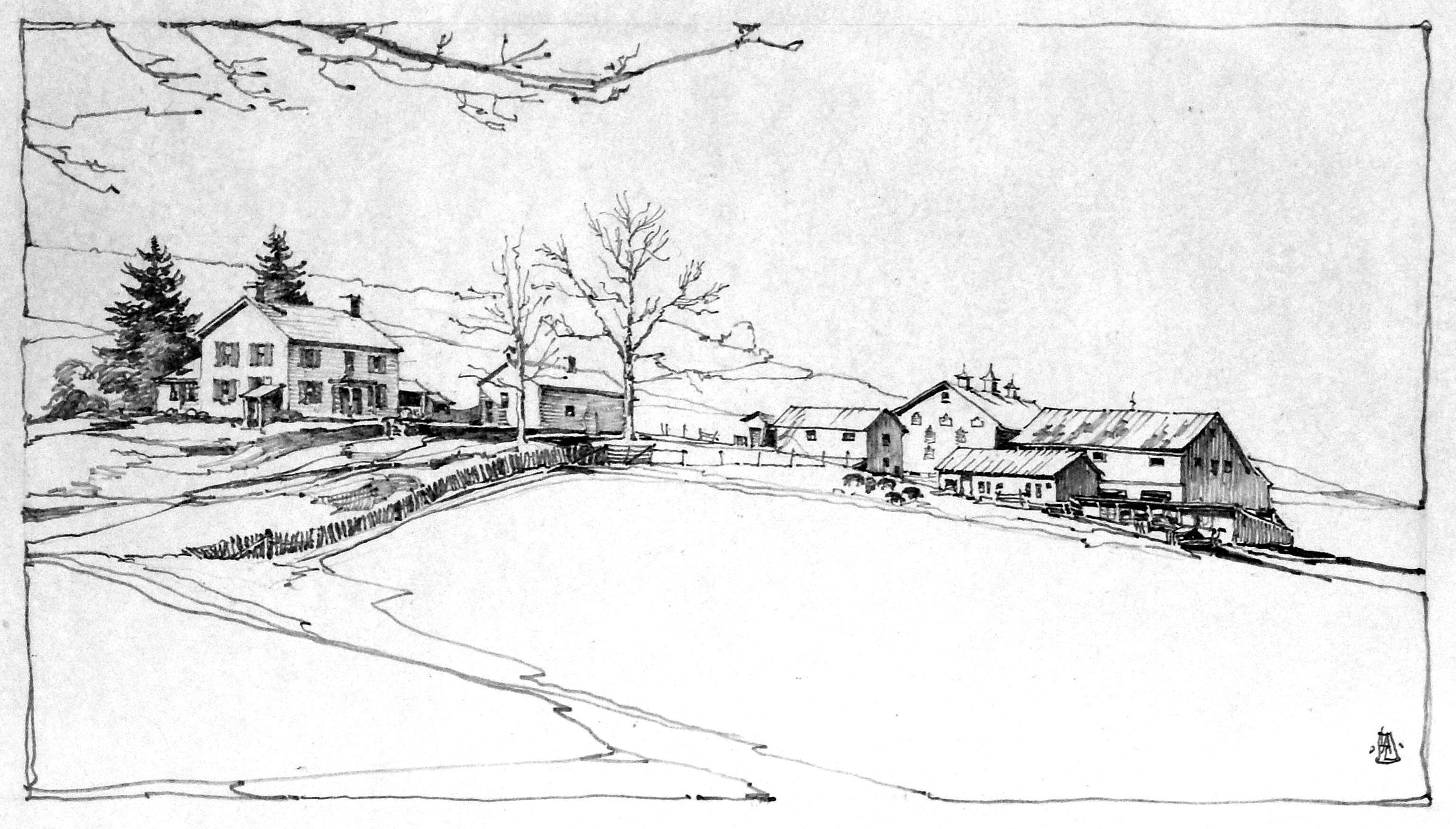 In 1939, Louis Bromfield hired Mansfield architect Louis Lamoreux to design a house for him at his new farm in southern Richland County, Ohio. Lamoreux would also serve as the general contractor for the work. Lamoreux did the drawing shown here. It shows the old Clement Herring home just before construction began on Bromfield's Big House. The old farmhouse was incorporated into the new structure. It is that part of the Big House to the left of the main entrance.