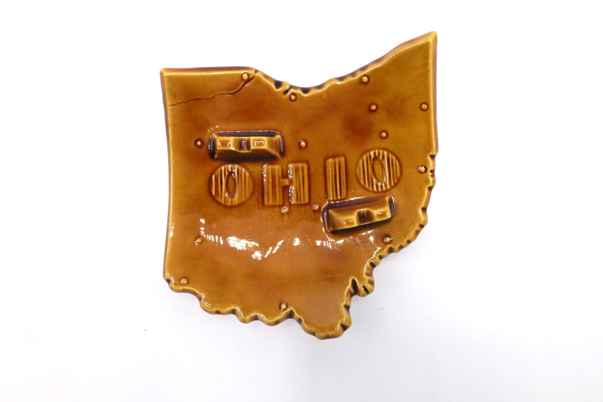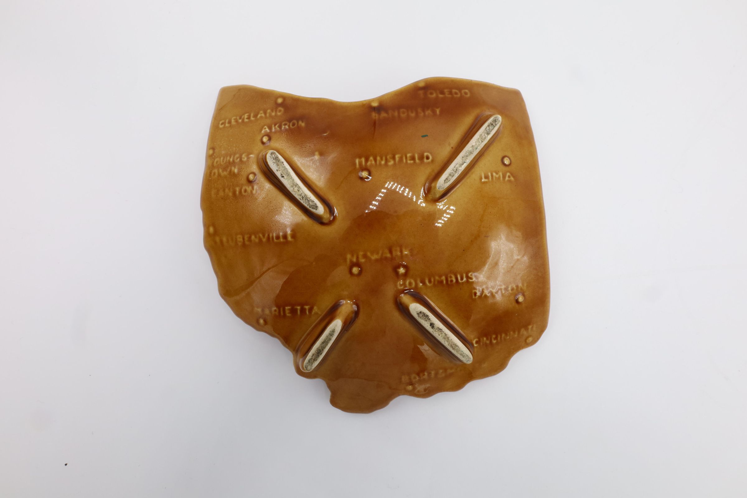 Ceramic ashtray in the shape of the state of Ohio. The ashtray has a burnt orange glaze with OHIO written on the top. Various Ohio cities are labeled on the back.Location
