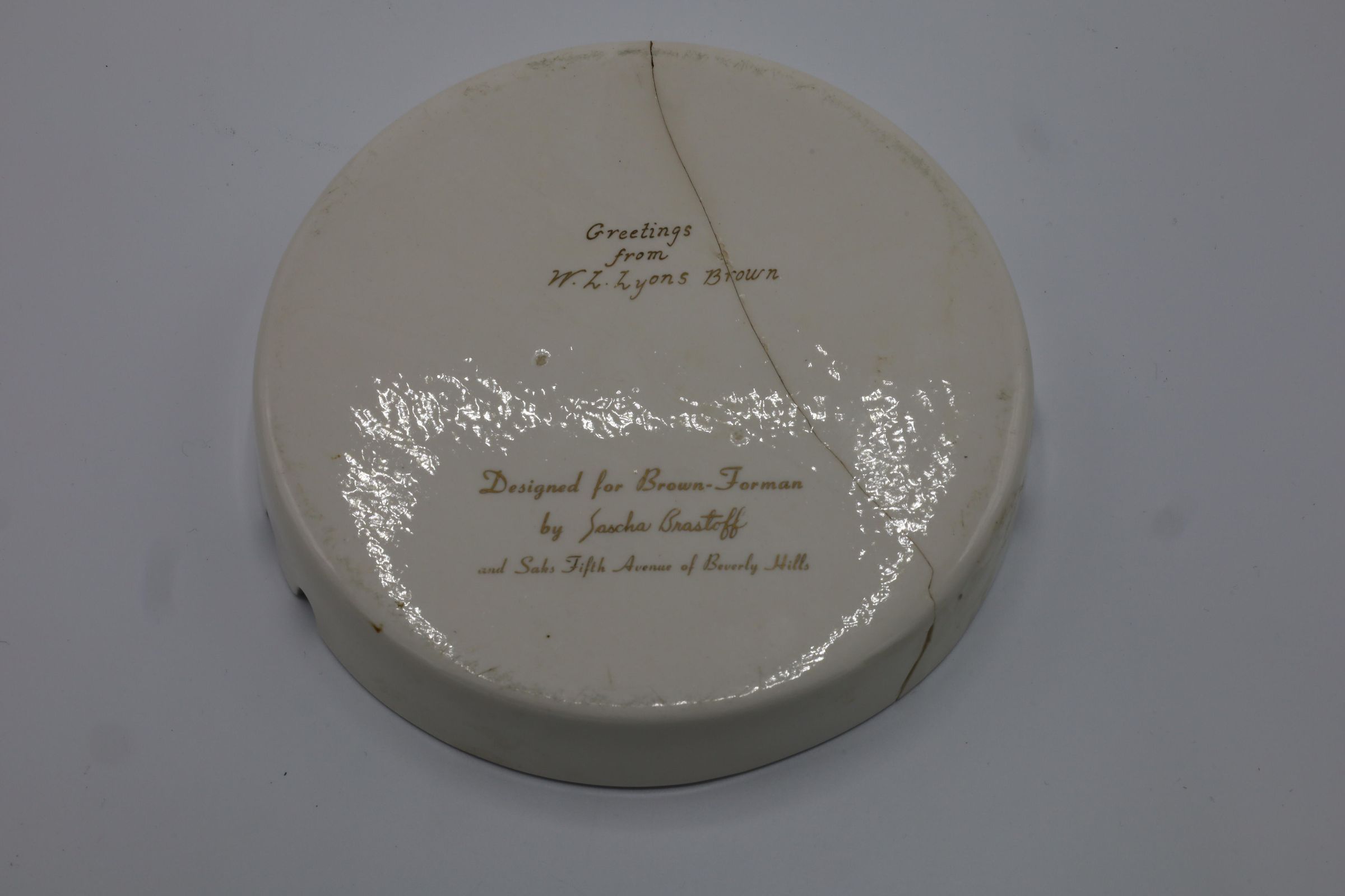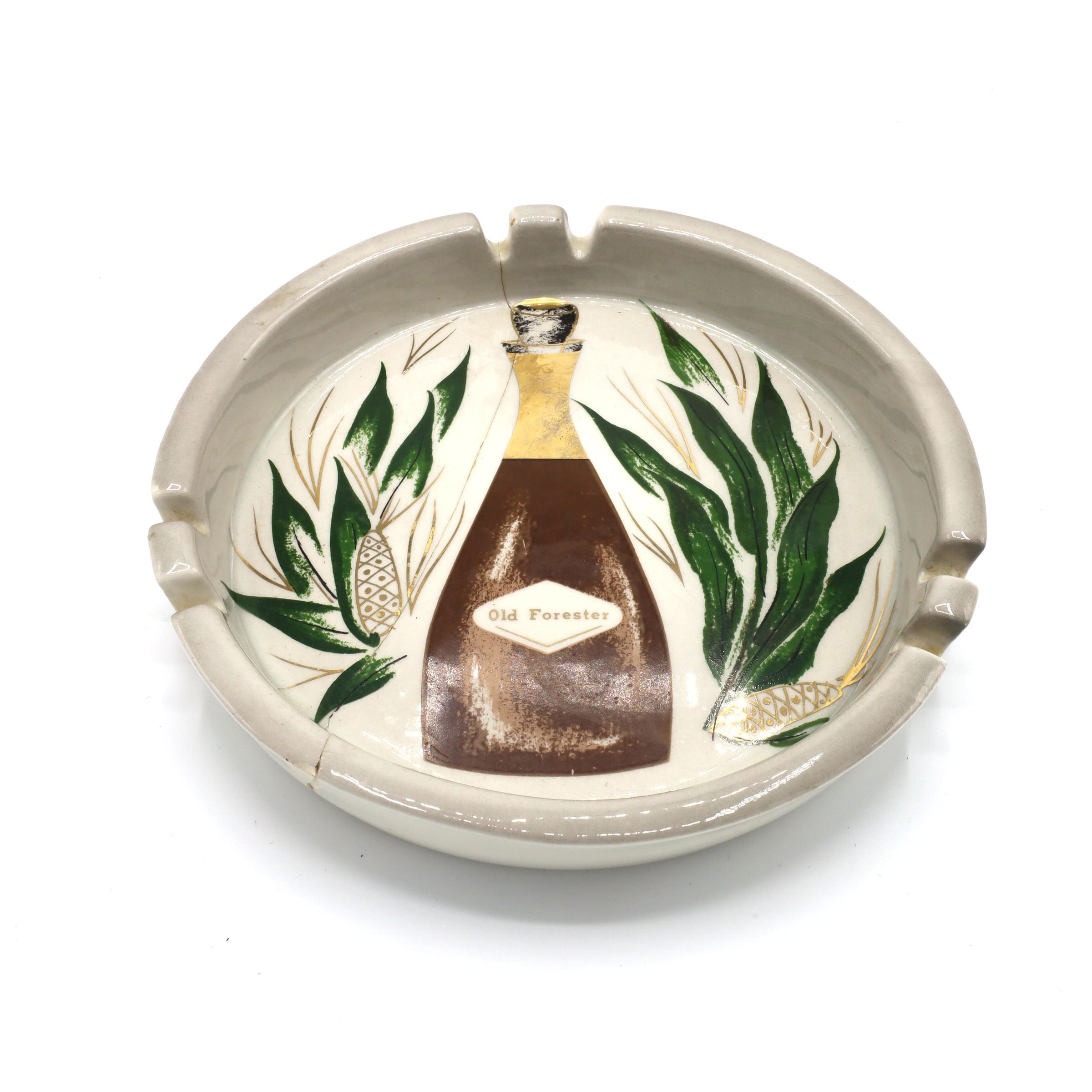 White, ceramic ashtray with an Old Forester bourbon whiskey bottle painted on the inside surrounded by rye. An inscription on the back states the ash tray was designed by Sascha Brastoff.Context