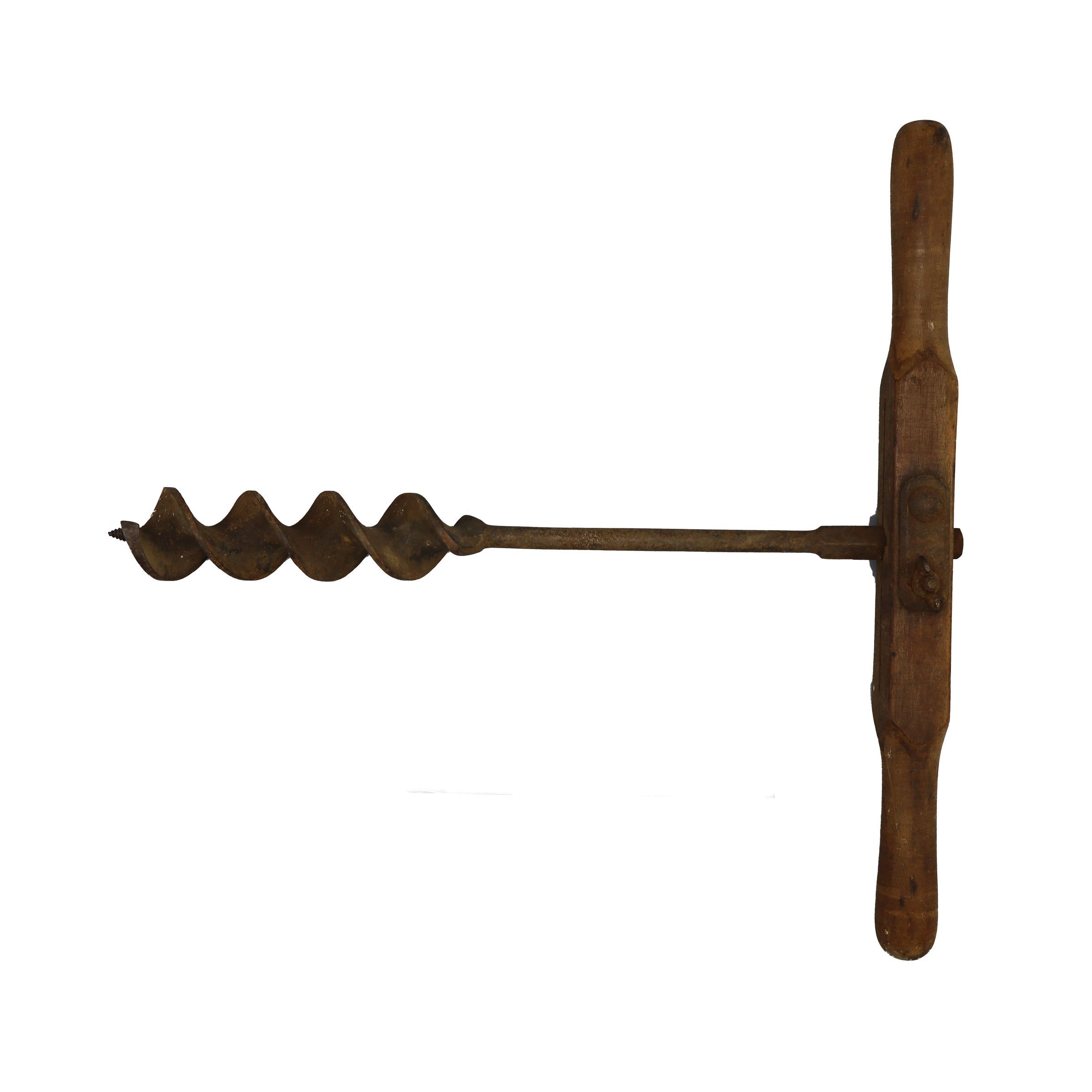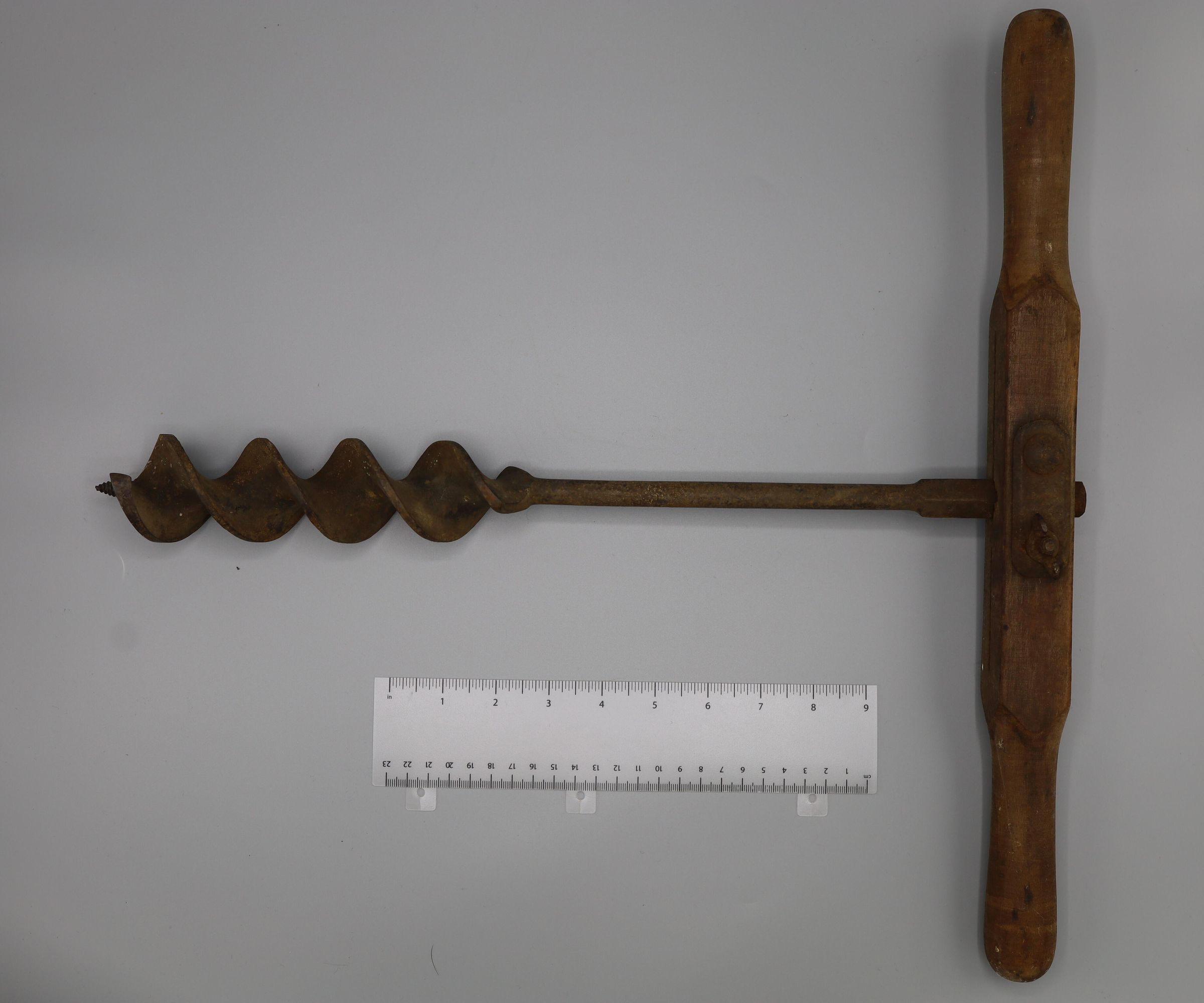 This wood-handled, metal bit auger would have been used to hand-drill holes in wood. Different bit sizes yield different hole diameters.Location