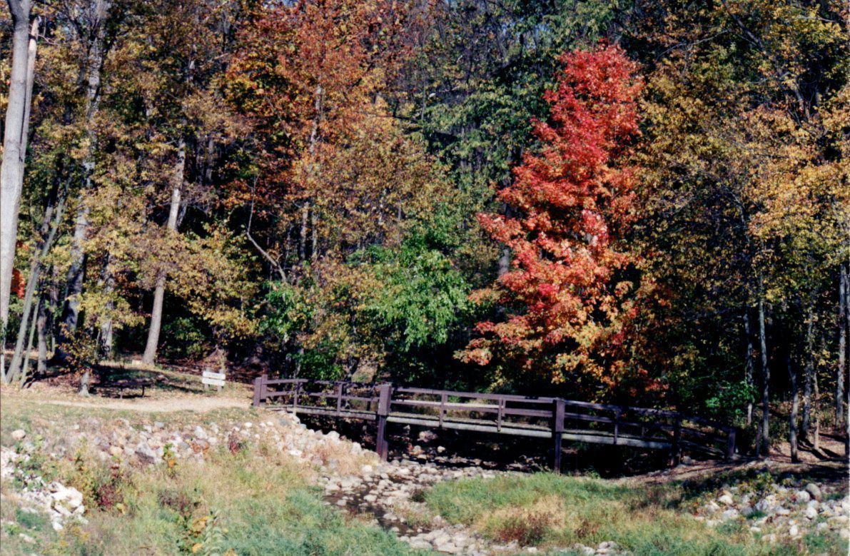 The waters of Sam's Creek have dried up and the leaves on the trees behind it have begun to change as autumn makes it mark in Mt. Gilead State Park.