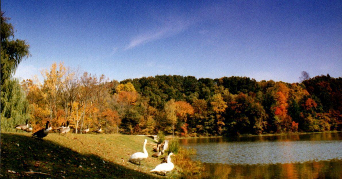 Geese line the shore of Mount Gilead Lake at Mt. Gilead State Park as autumn color transforms the surrounding hillsides and lakeshore.