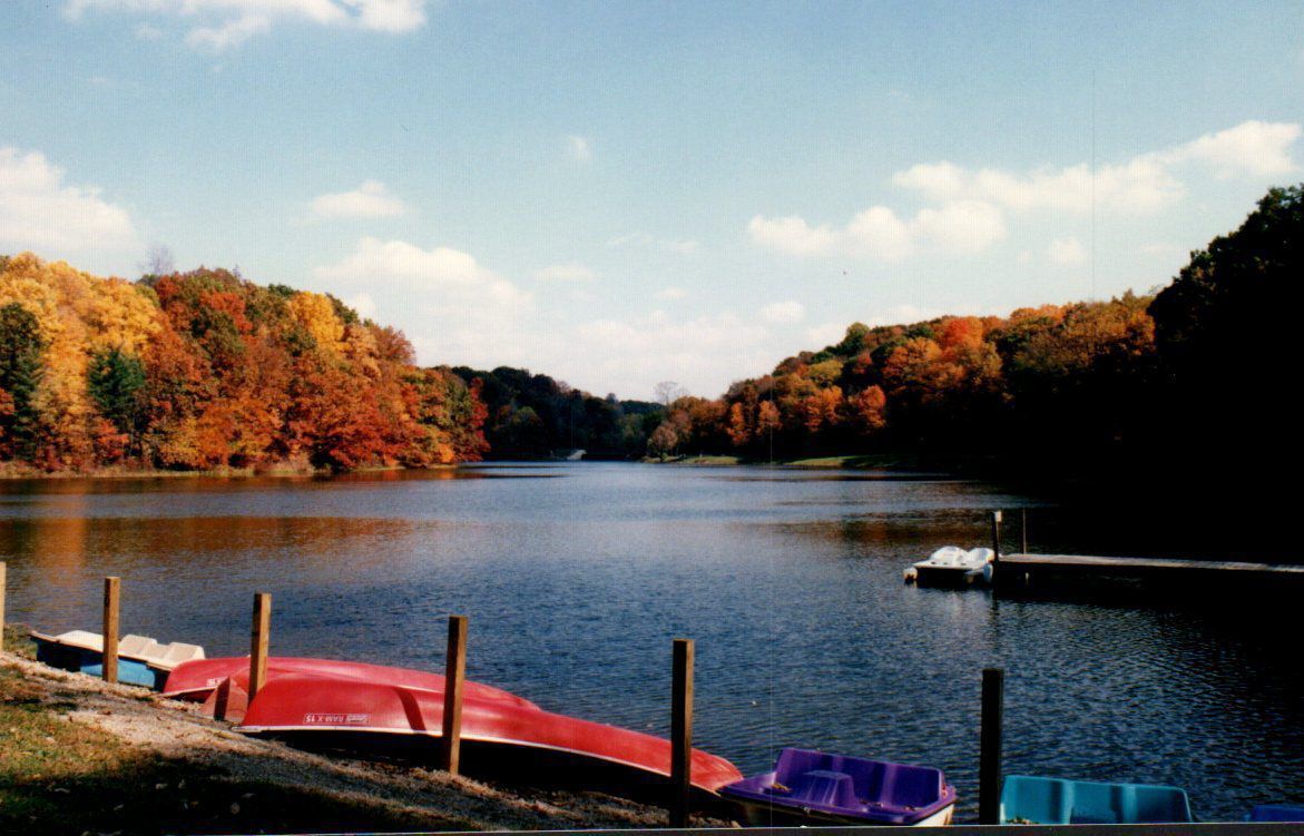 Splendid autumn color encircles Mount Gilead Lake at Mt. Gilead State Park during the fall of 1996.