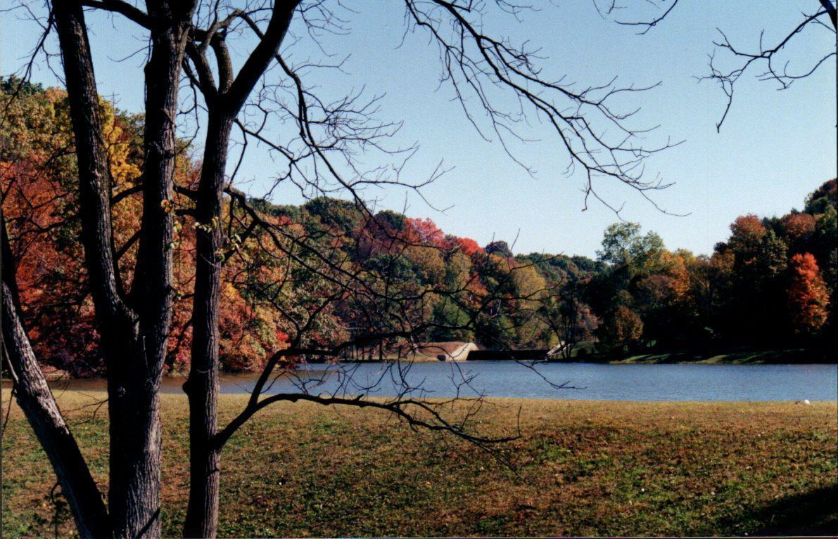 The trees surrounding Mount Gilead Lake in Mt. Gilead State Park are dashed with splendid autumn color in this photograph from 1994.