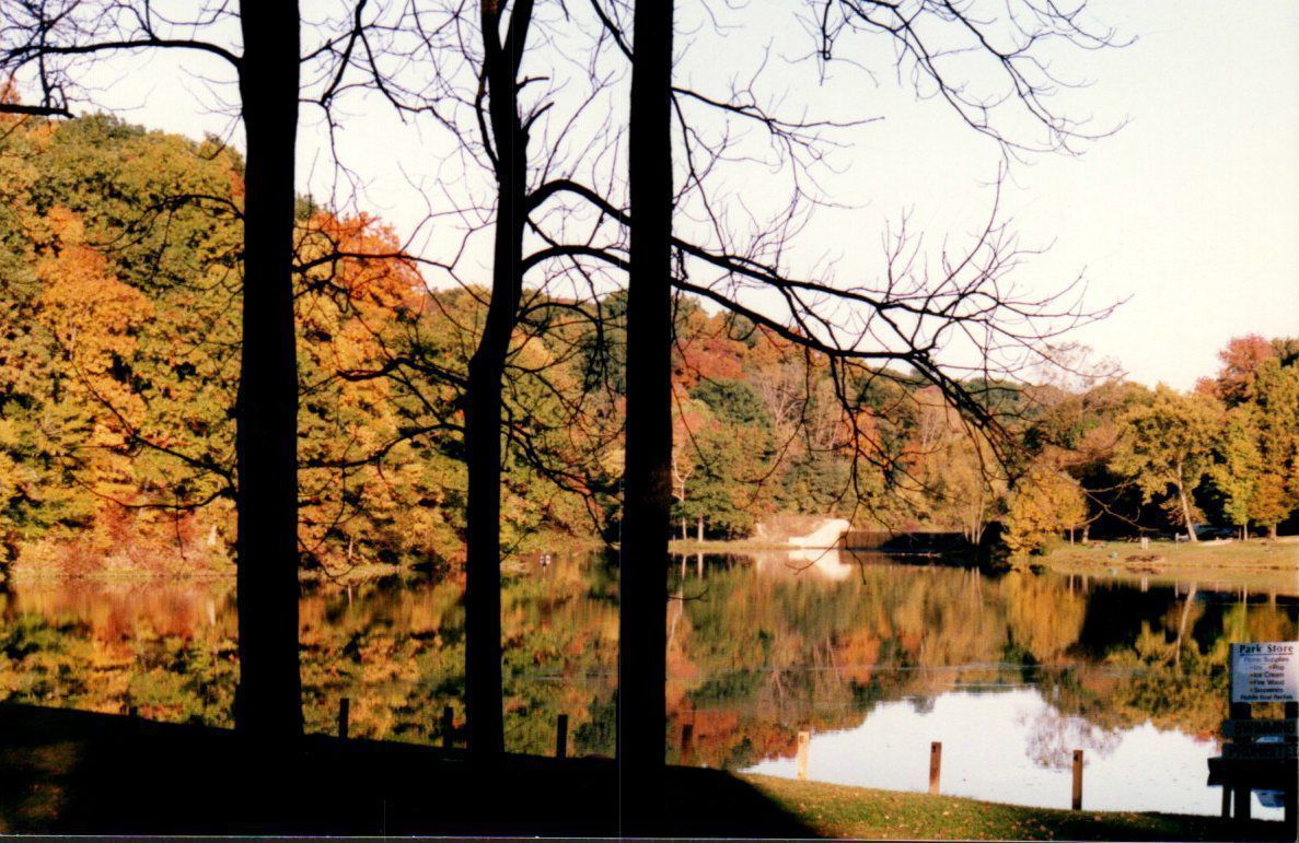 The lakeshore surrounding Mount Gilead Lake is transformed with fall color during the autumn of 1996. The red, yellow, and orange leaves are reflected off the tranquil waters.Cataloged By