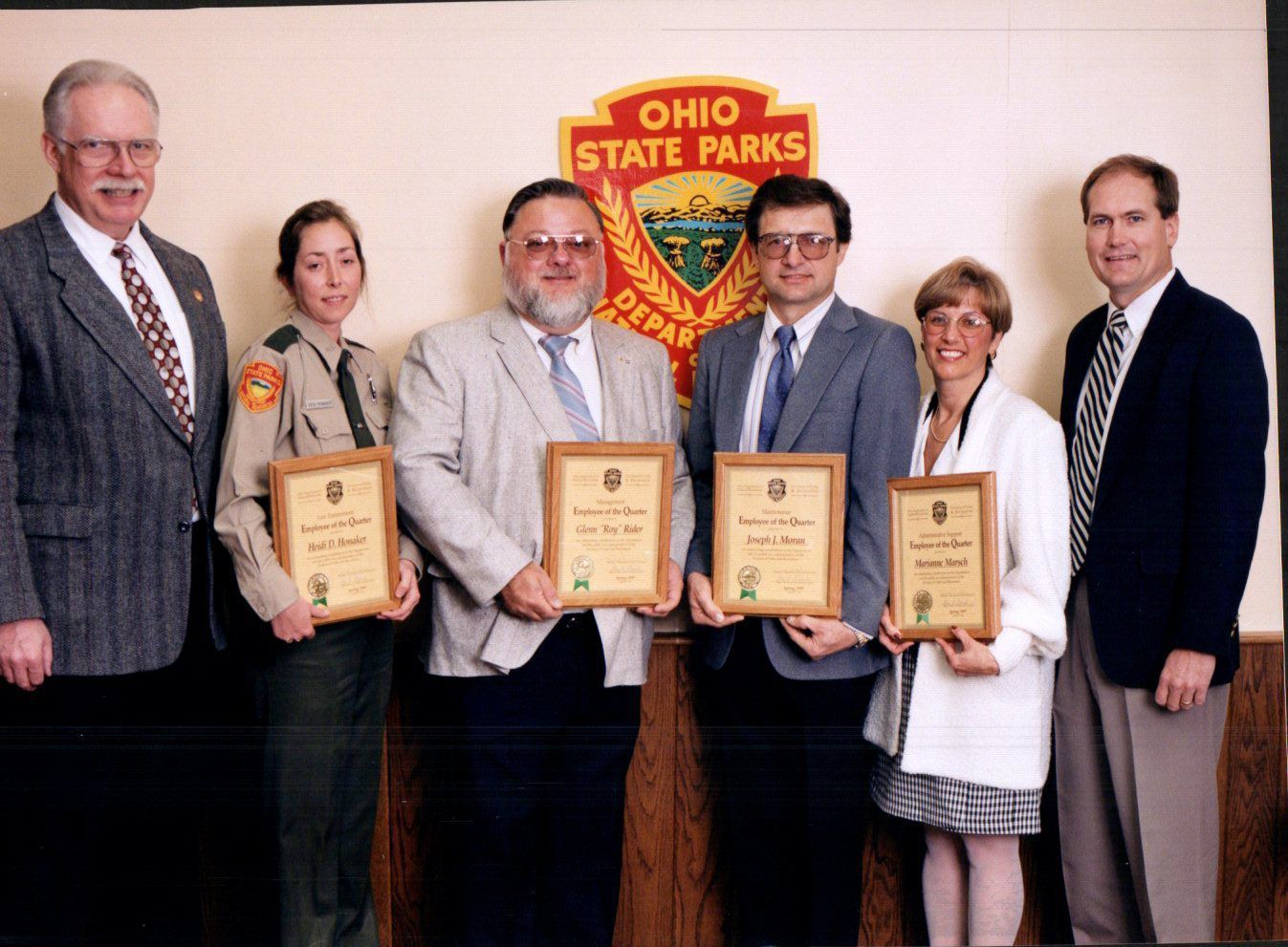 Staff at Indian Lake State Park receive award plaques. On the far left is Glen D. Alexander, the chief of the ODNR Division of Parks and Recreation (today the Division of Parks and Watercraft) between 1991-1997. Alexander received the Cardinal Award in 2024 in honor of his career in natural resource management.