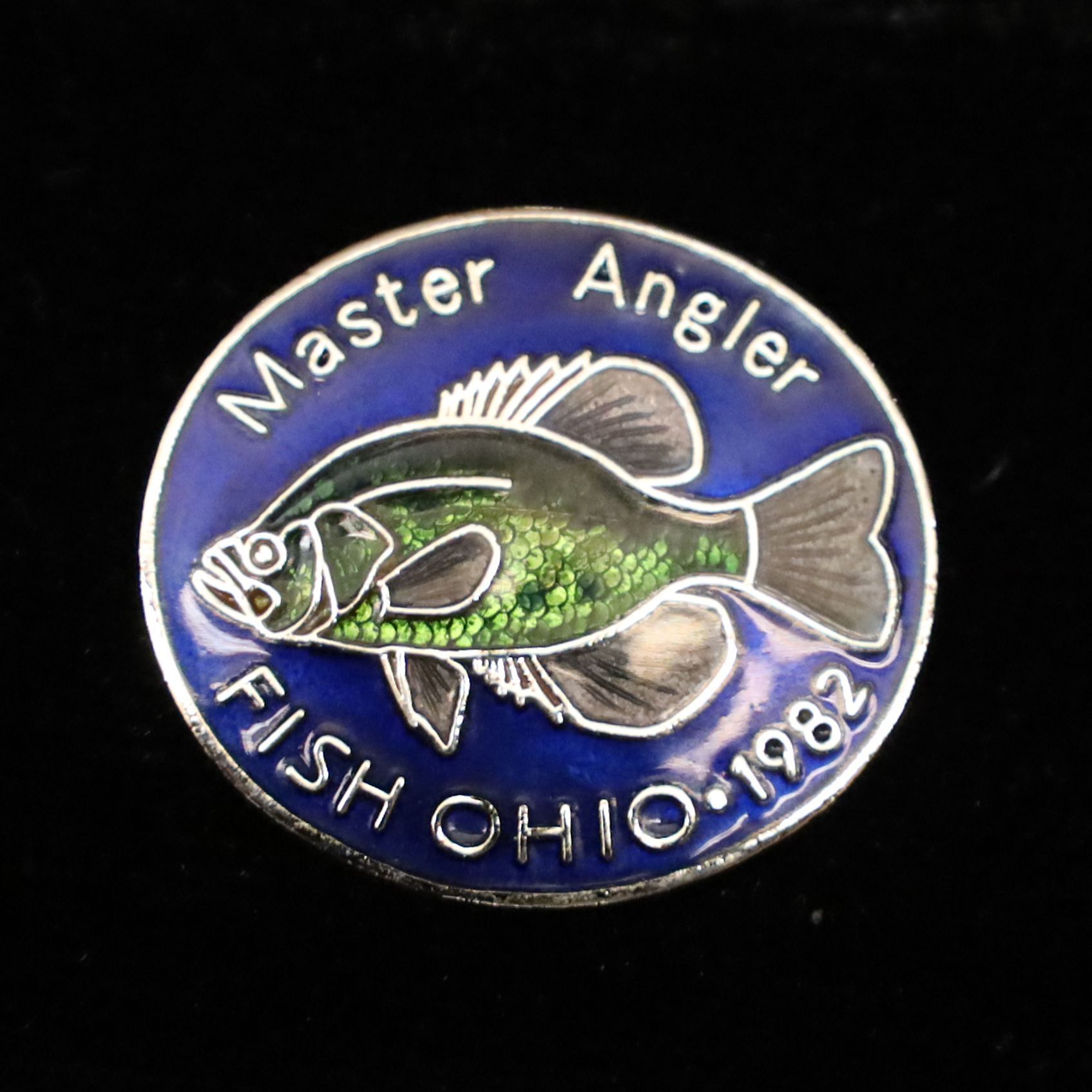The 1982 Master Angler pin features a crappie. The pin is enameled with a dark blue background, a green scaled crappie, and the words Master Angler on the top border and Fish Ohio 1982 along the bottom border.
