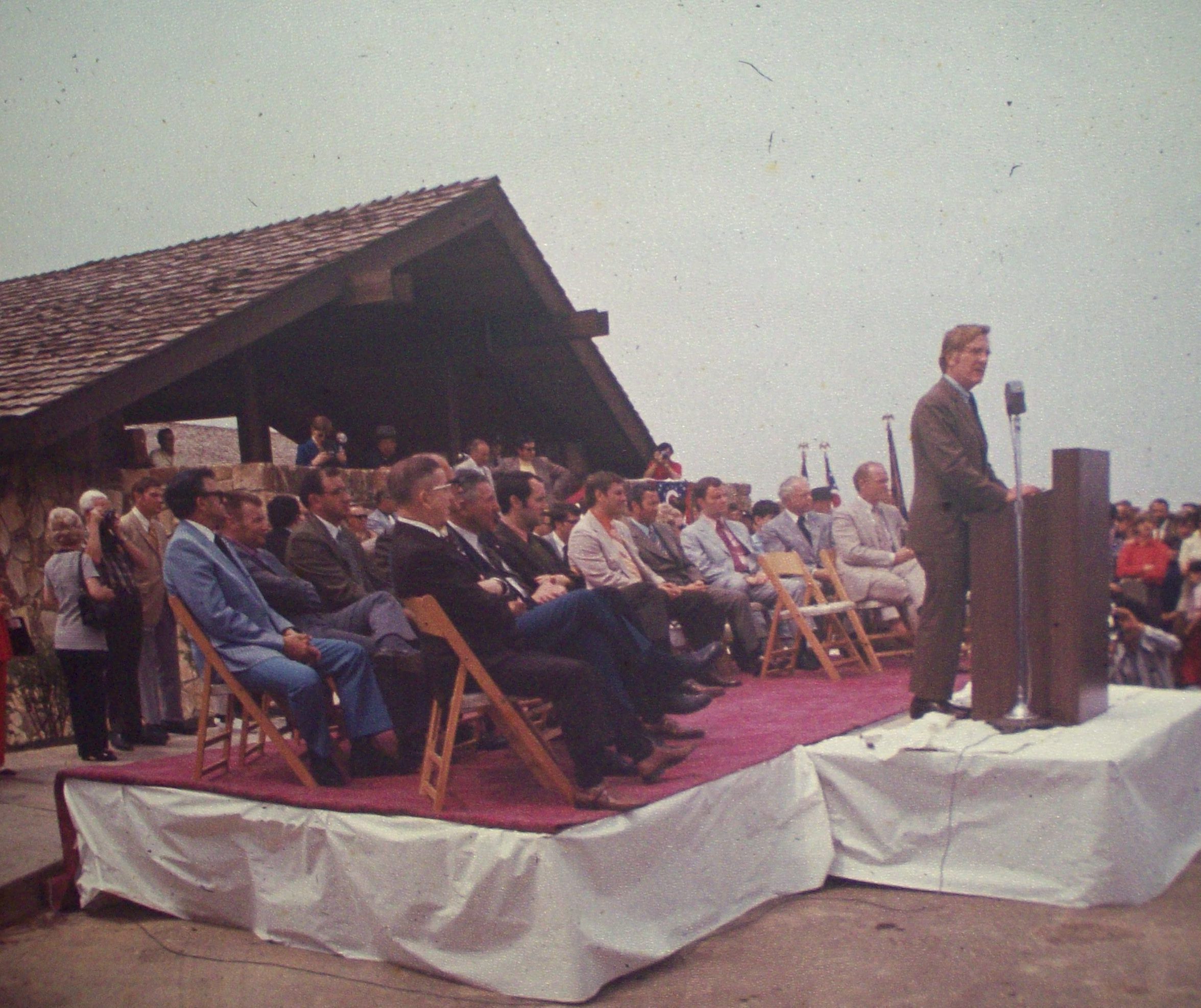 Salt Fork State Park's lodge officially opened in 1972 following a dedication ceremony. Governor John J. Gilligan speaks from the podium to a large crowd and many local and state officials.Cataloged By
