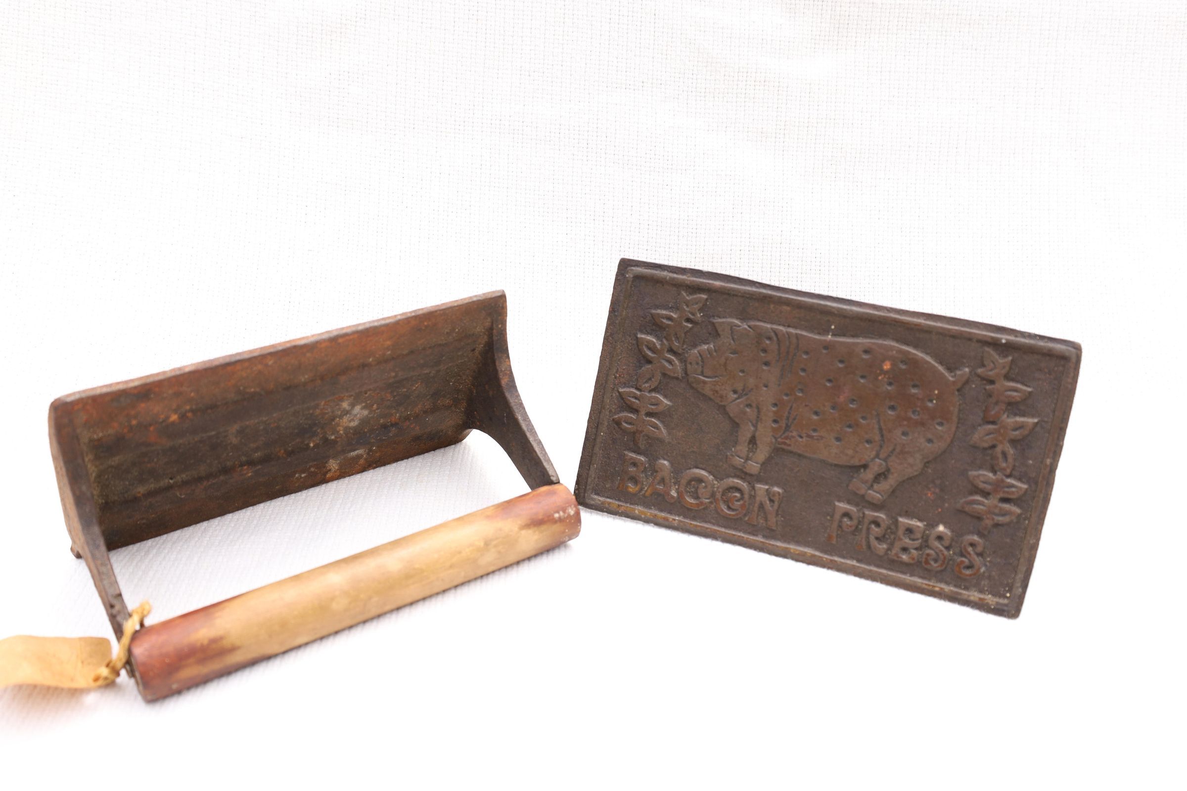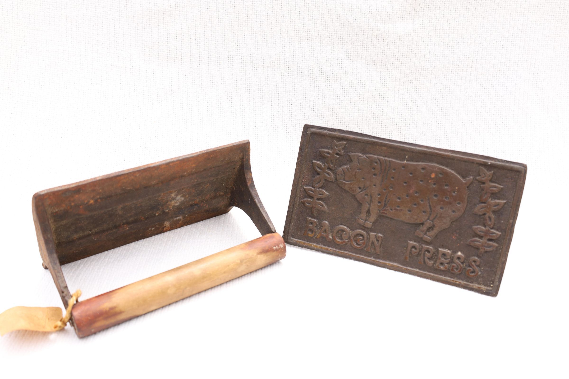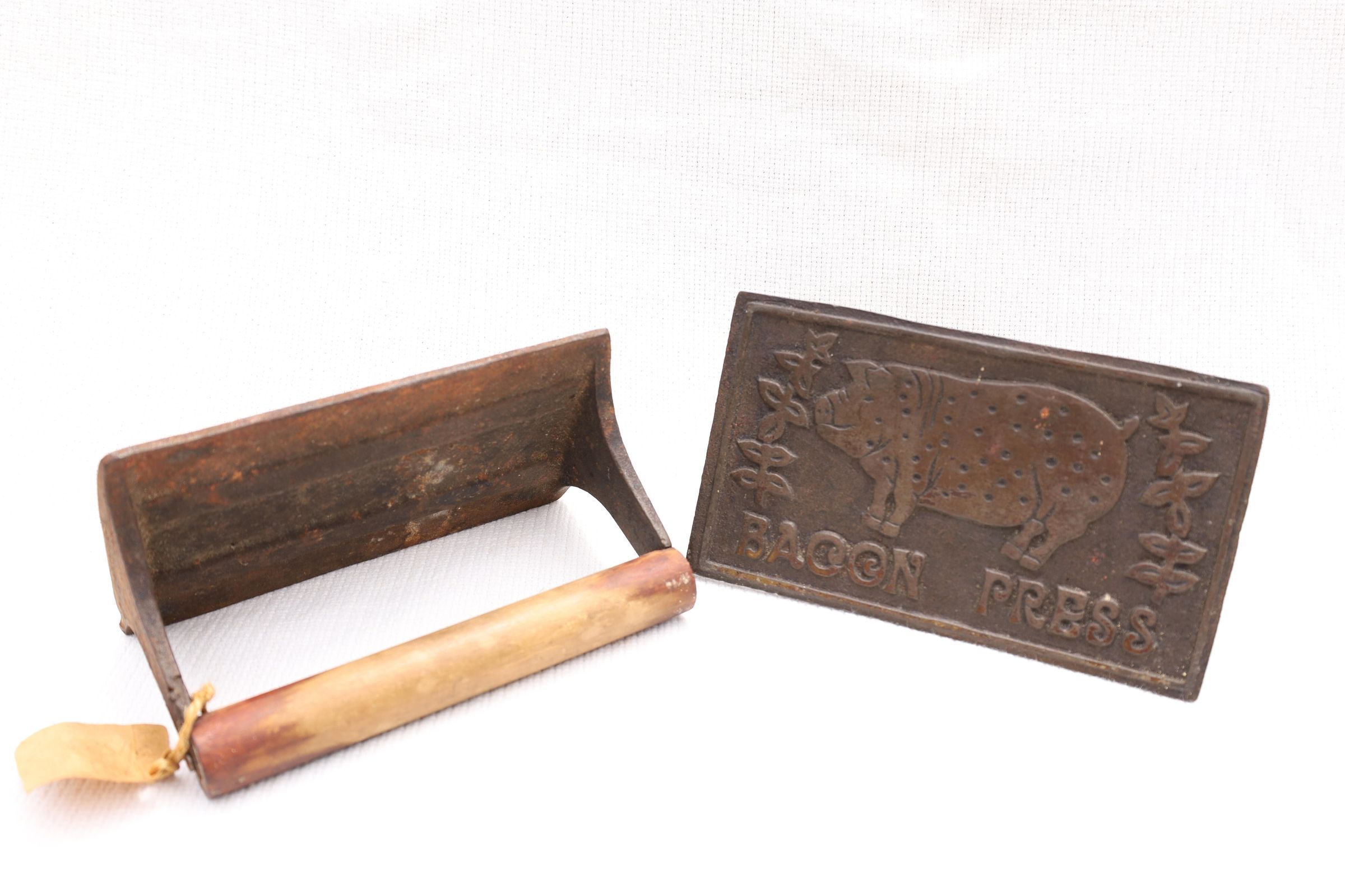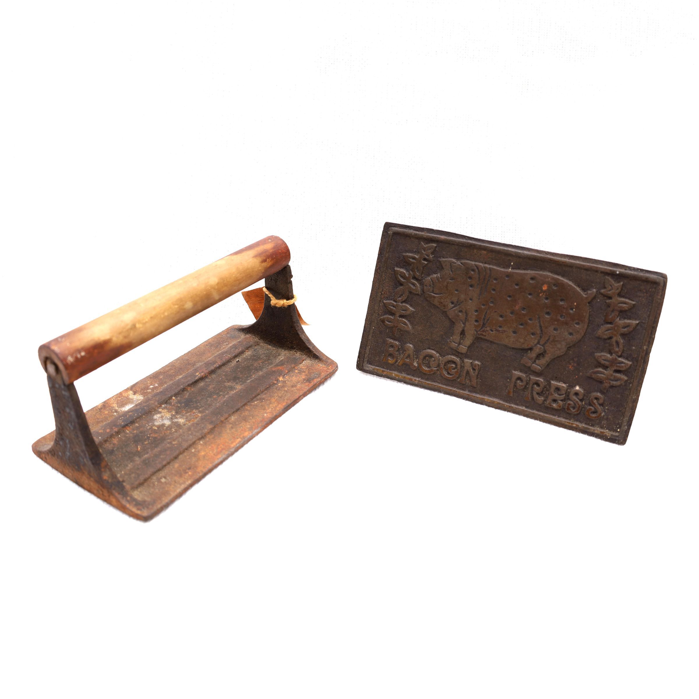 This heavy iron mold bacon press was used to hold bacon in place while cooking to prevent curling of the bacon. This example has a pig and the words bacon press on the front. The handle is wooden.Location