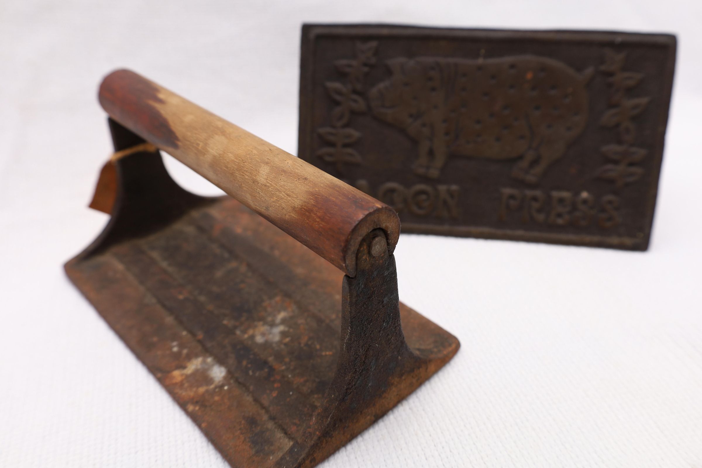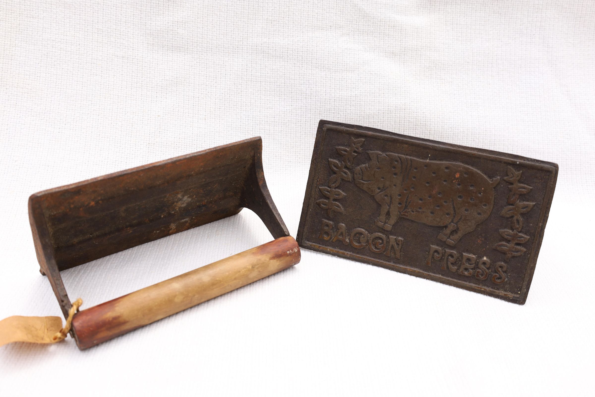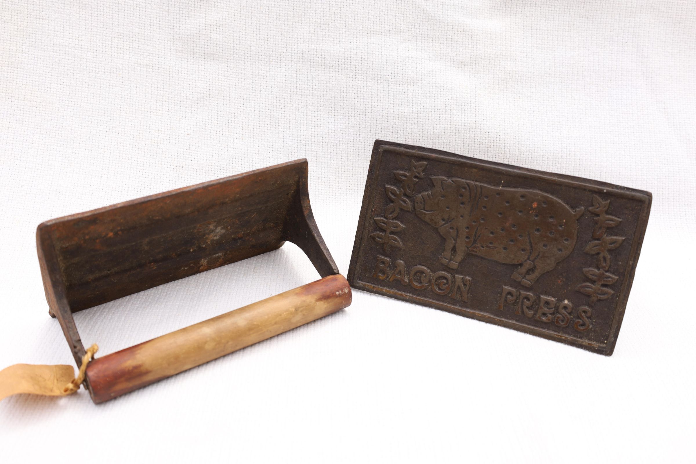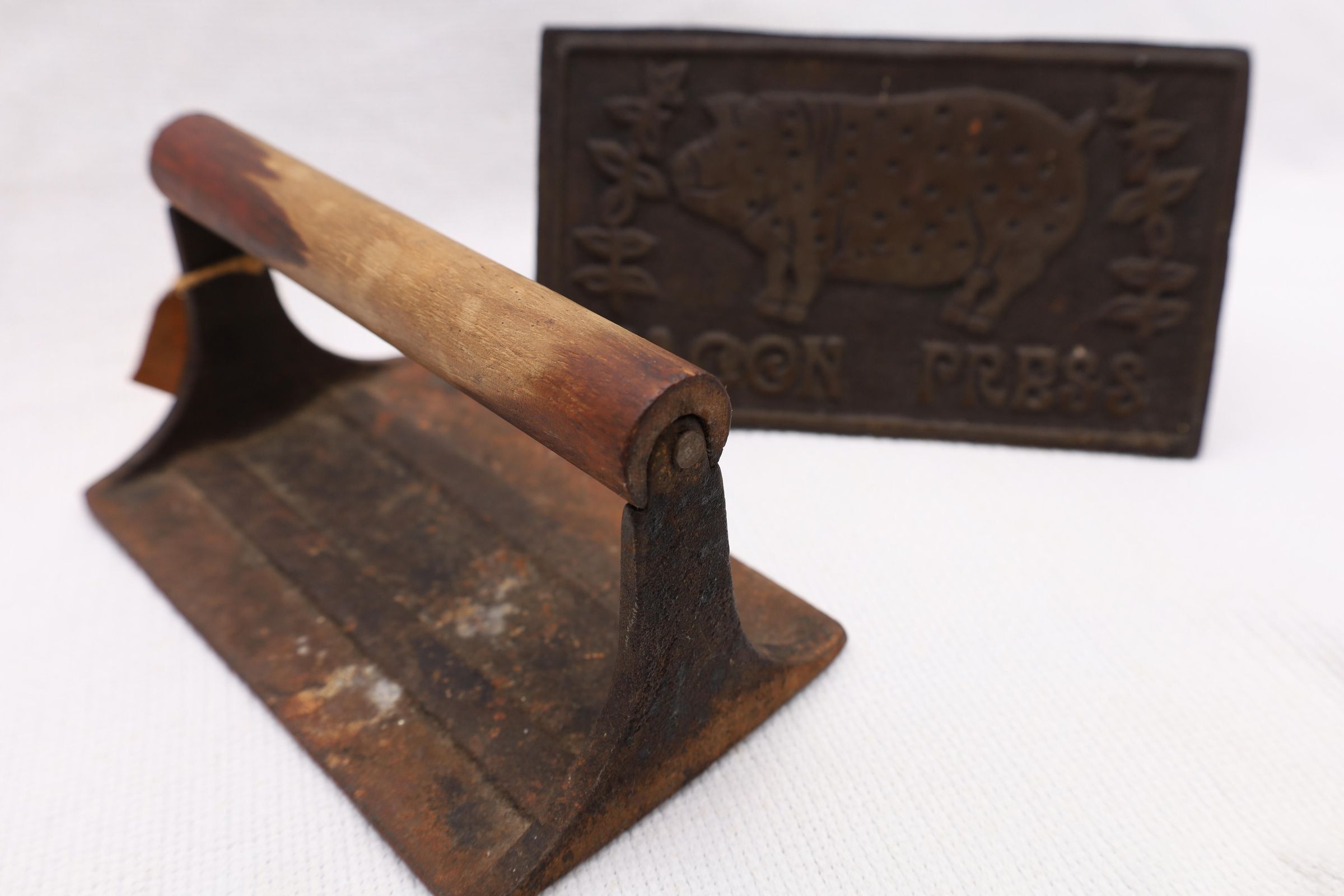 This heavy iron mold bacon press was used to hold bacon in place while cooking to prevent curling of the bacon. This example has a pig and the words bacon press on the front. The handle is wooden.Location