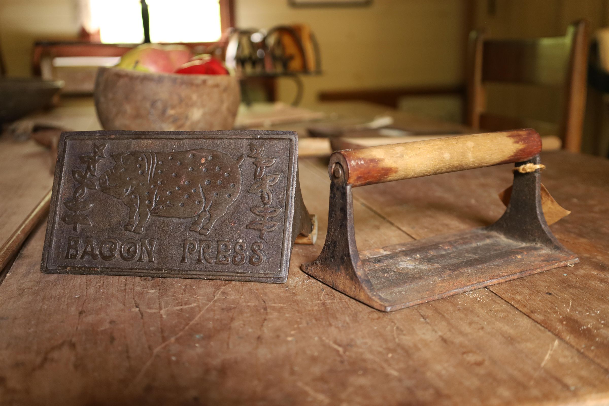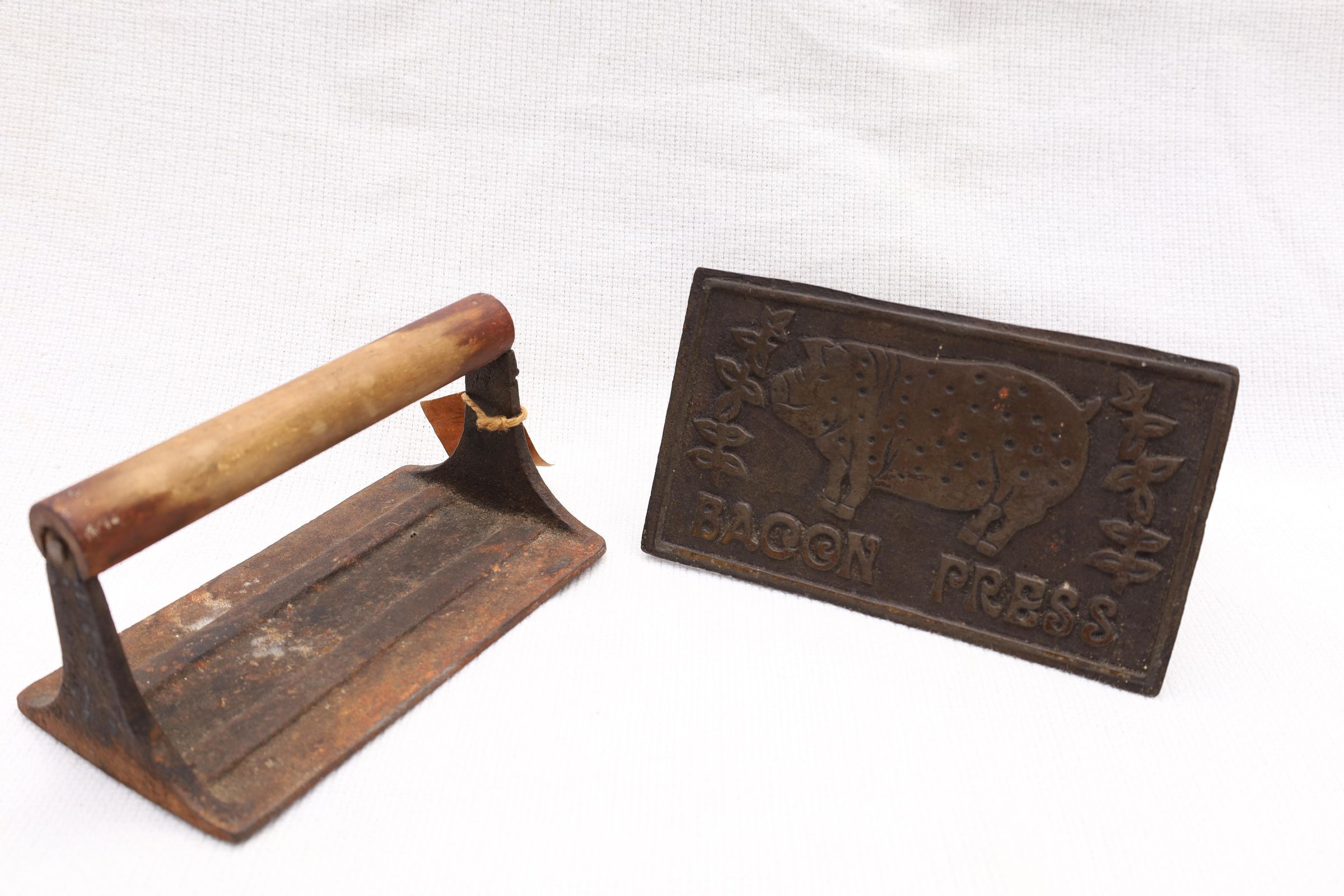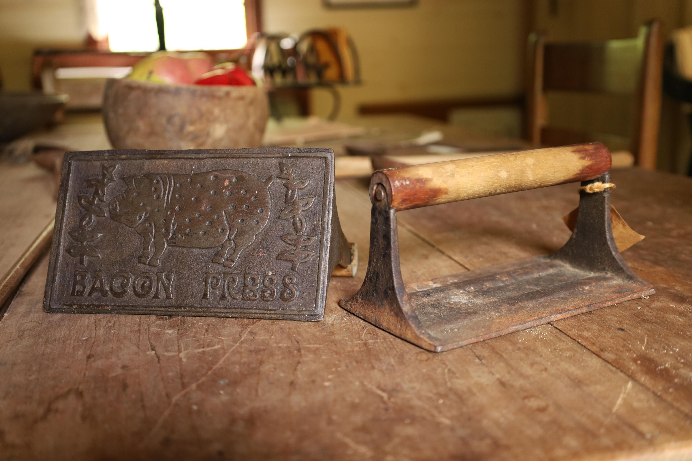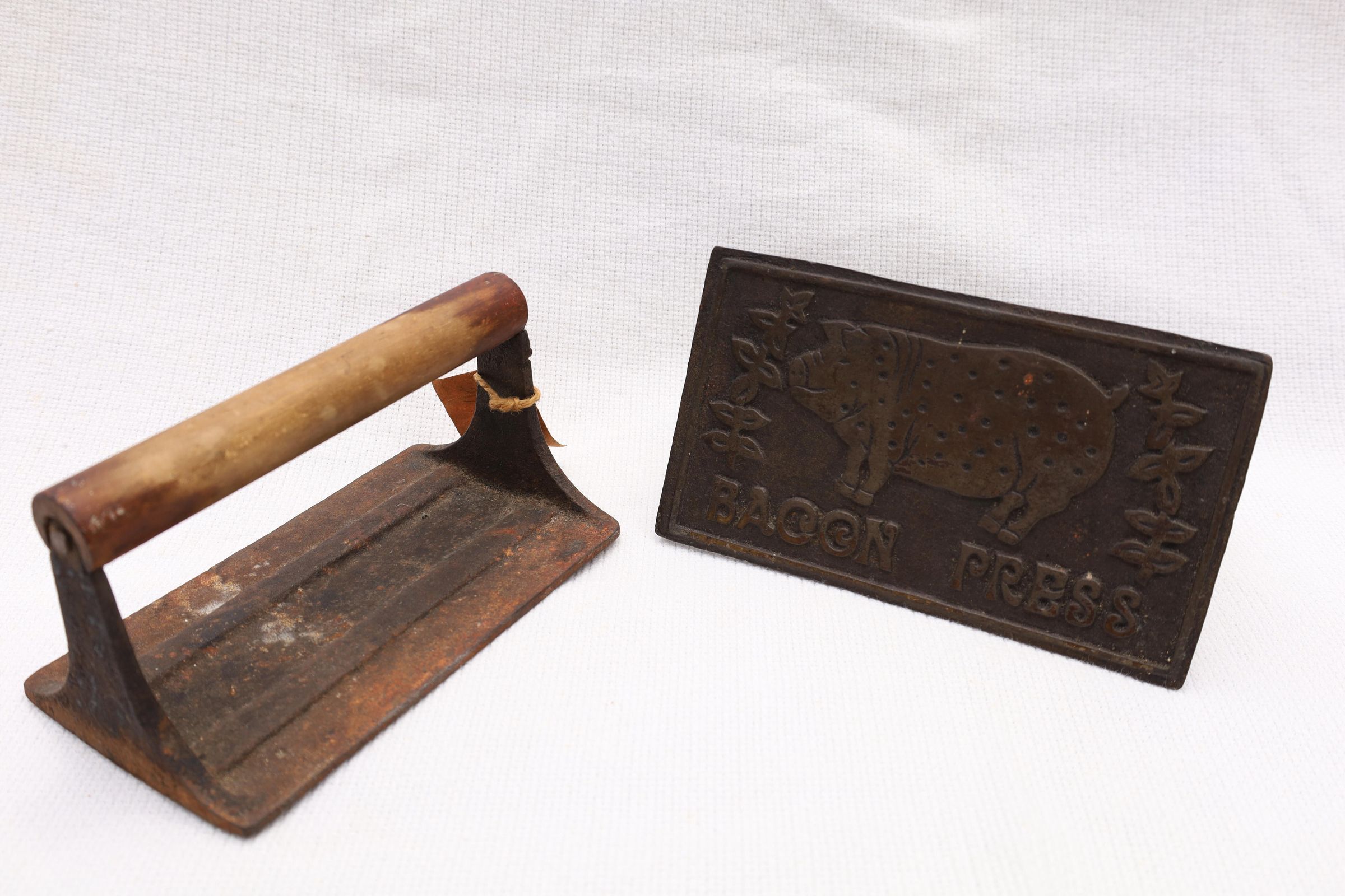 This heavy iron mold bacon press was used to hold bacon in place while cooking to prevent curling of the bacon. This example has a pig and the words bacon press on the front. The handle is wooden.Location