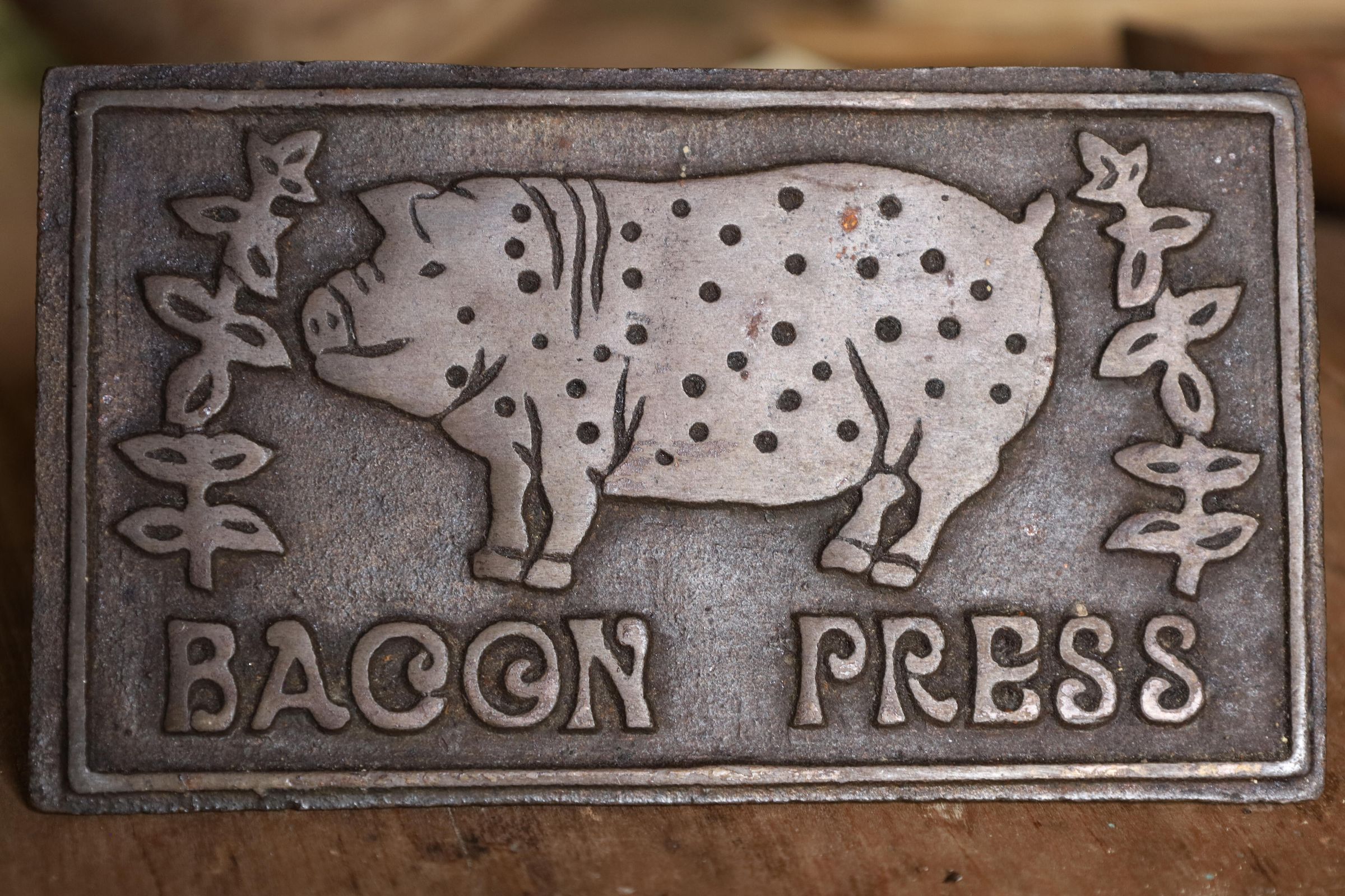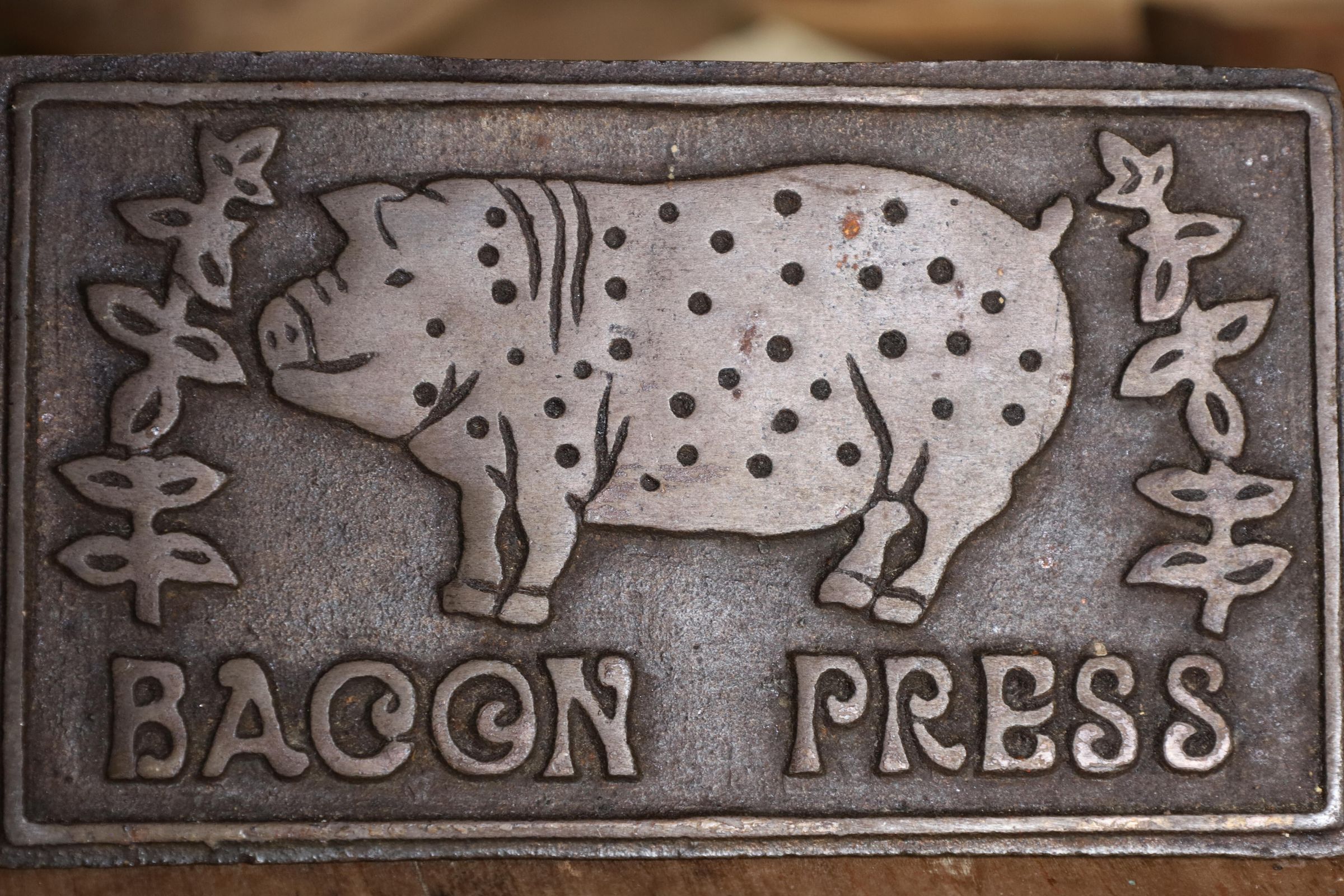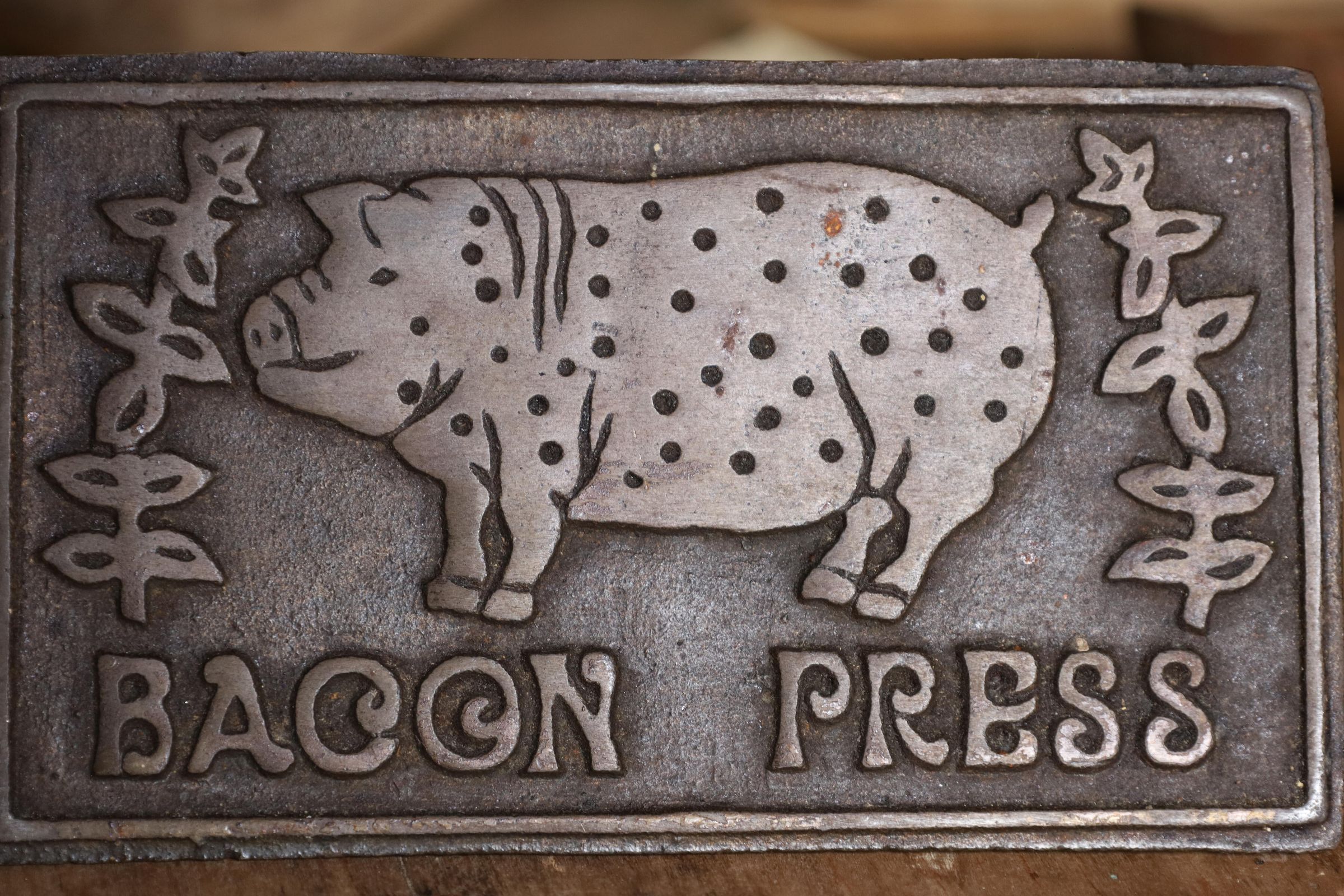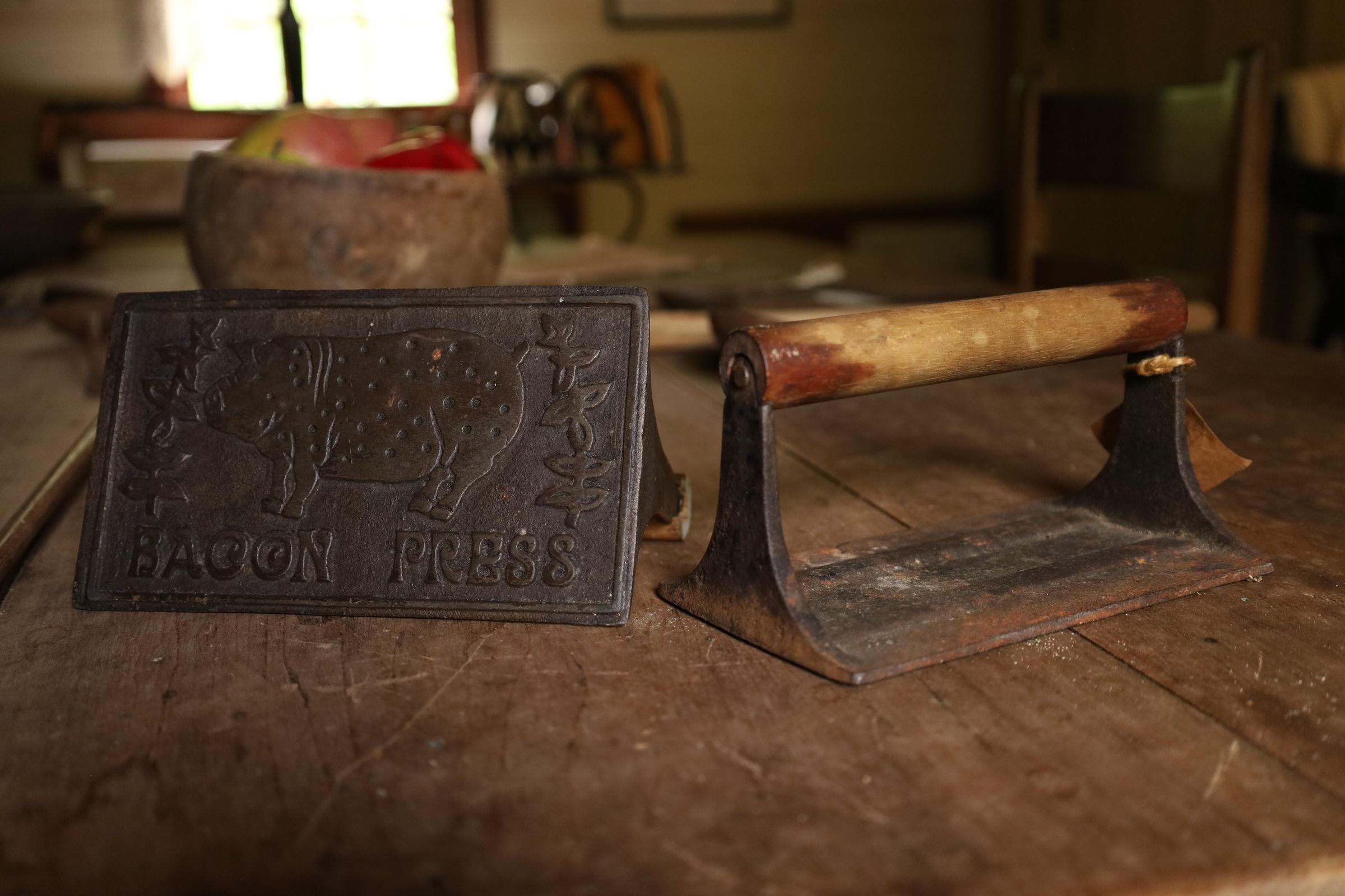 This heavy iron mold bacon press was used to hold bacon in place while cooking to prevent curling of the bacon. This example has a pig and the words bacon press on the front. The handle is wooden.Location
