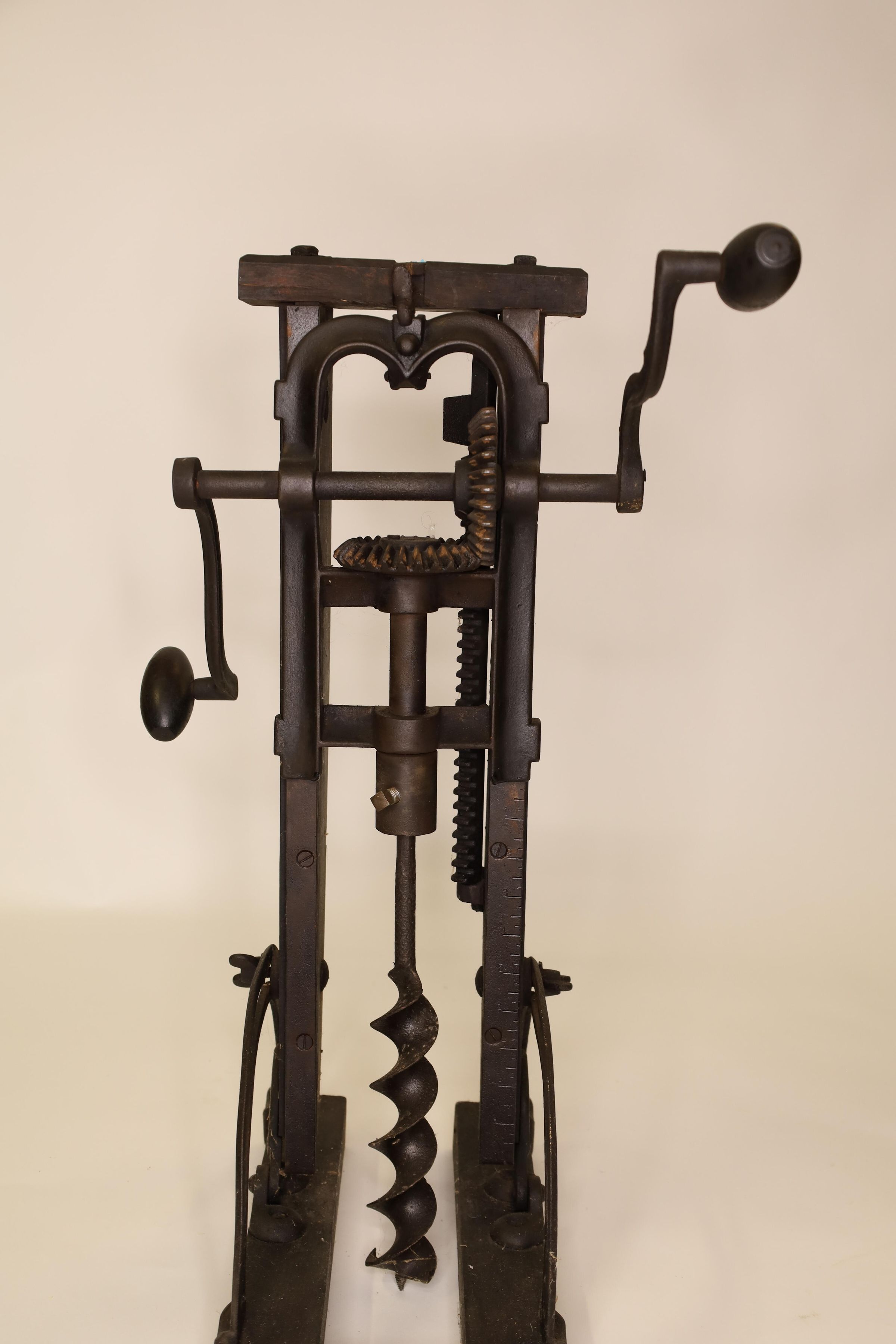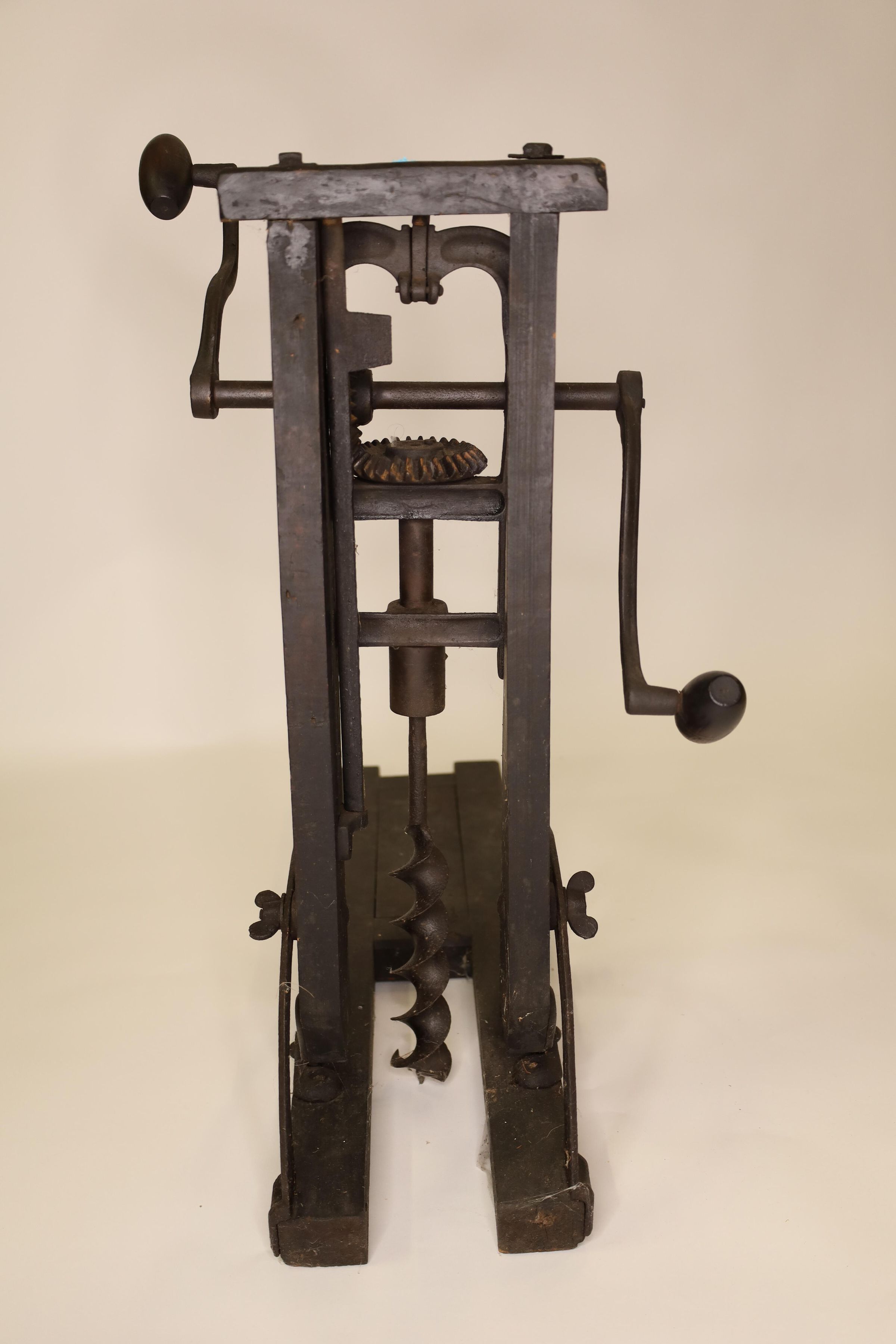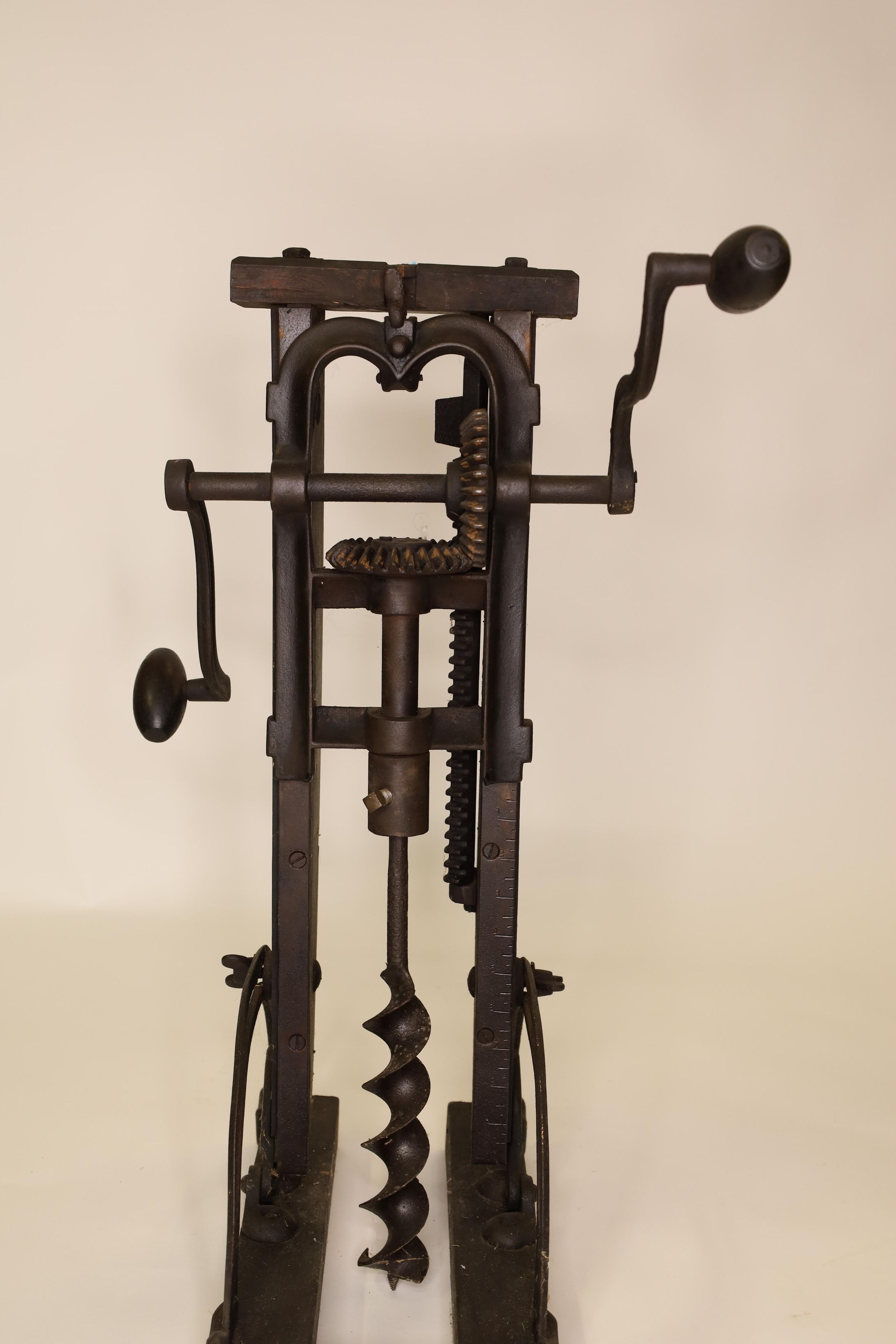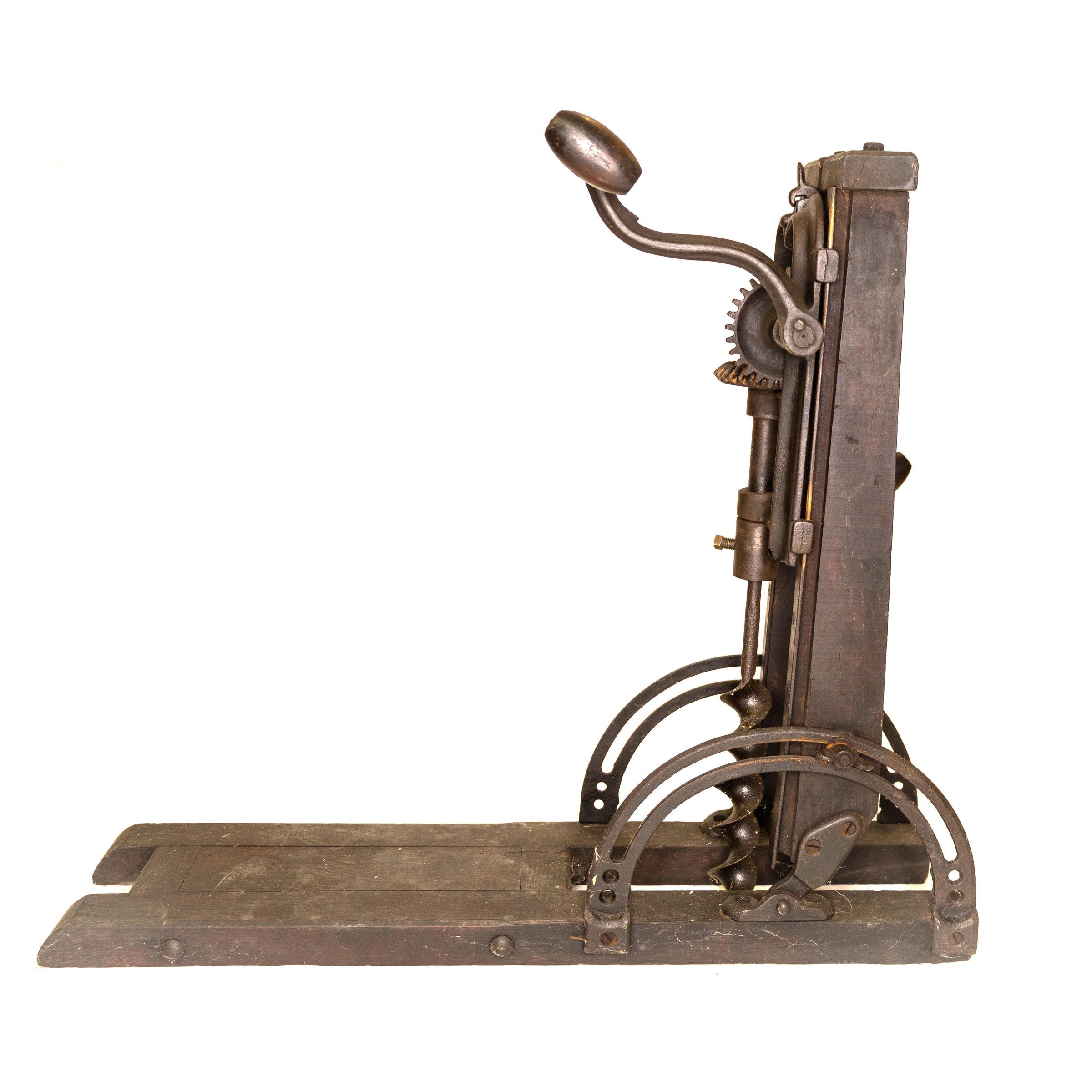 Barn beam drills were used in barn building before electricity, when timbers were held together with wooden pegs. Individual craftsman sat on the drill to fit the peg into the hole.Location