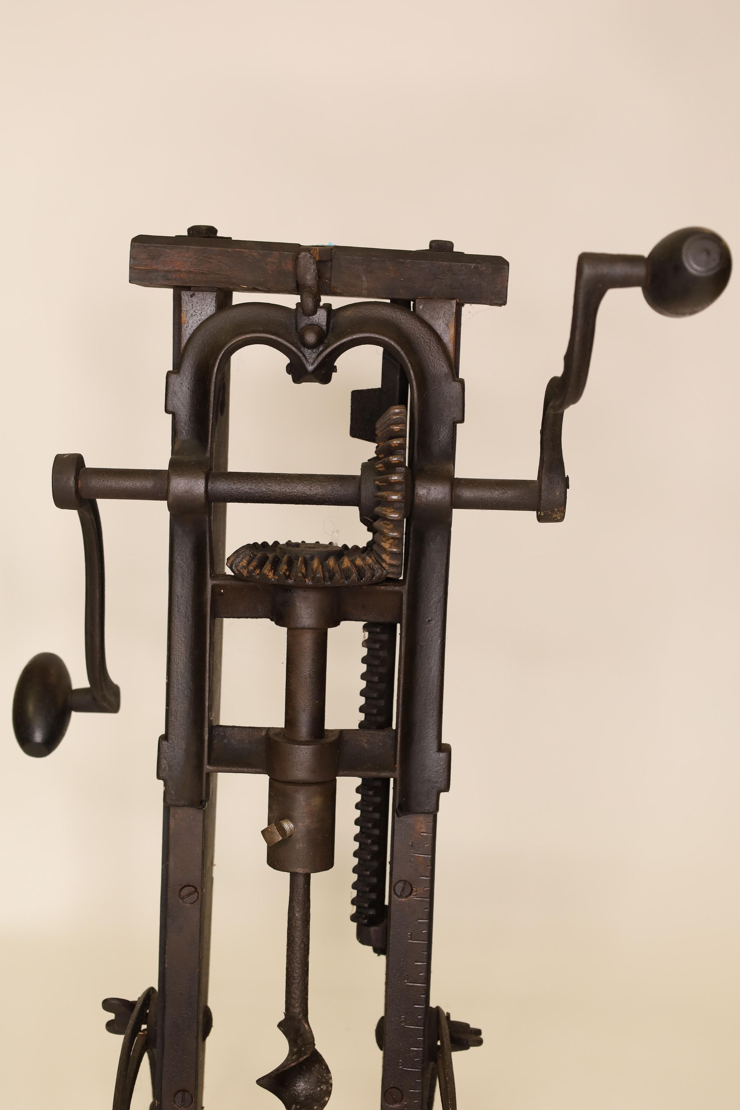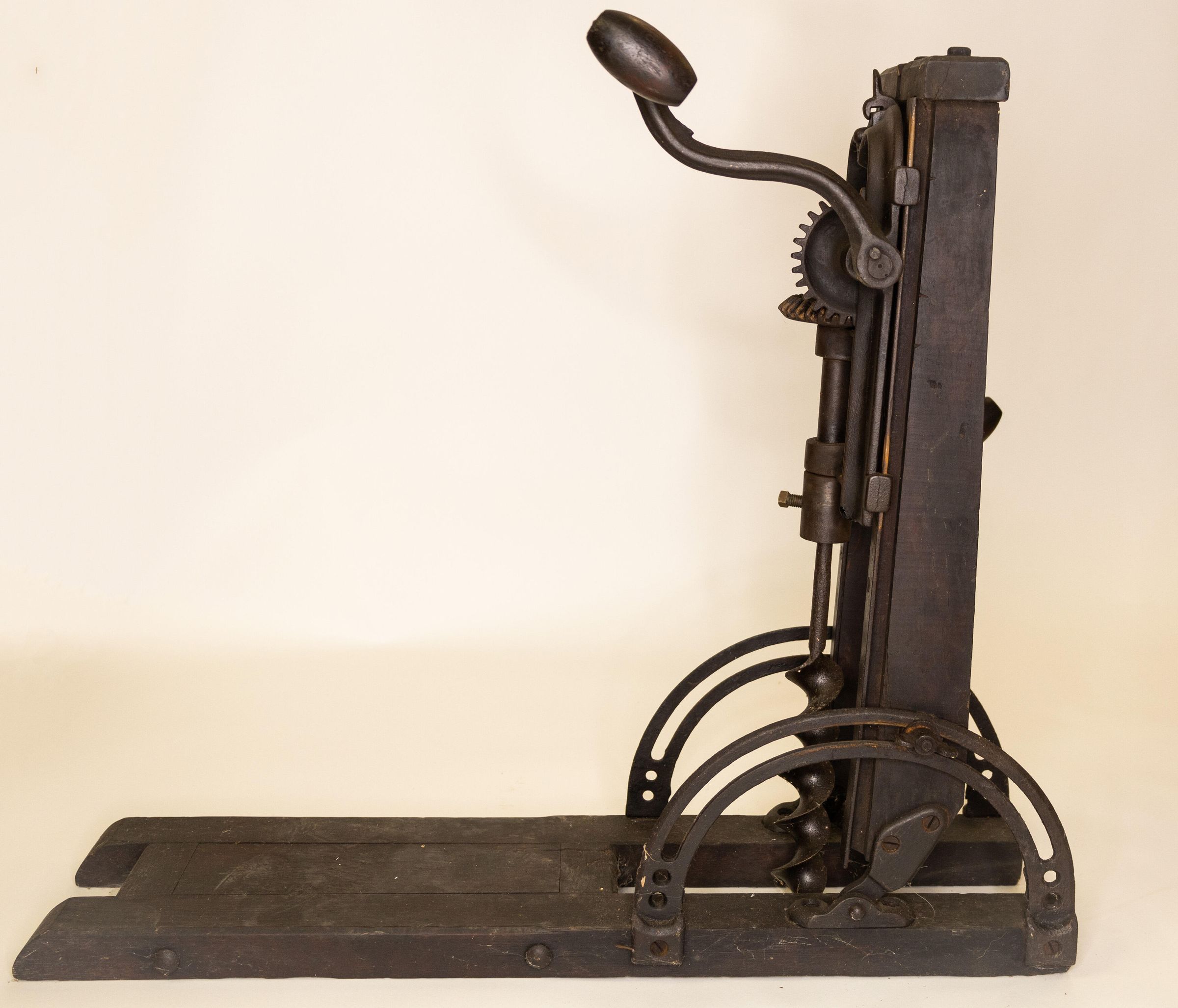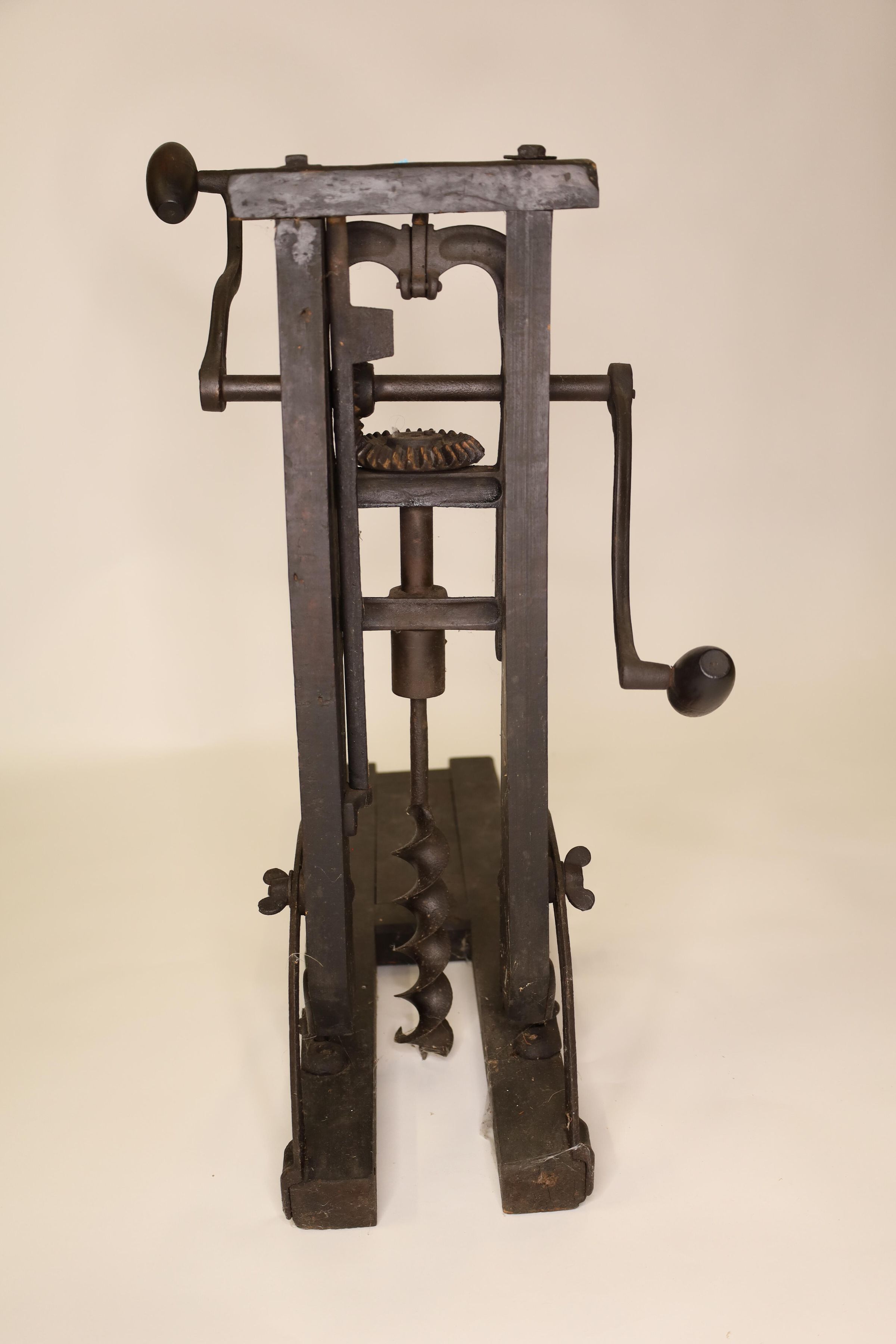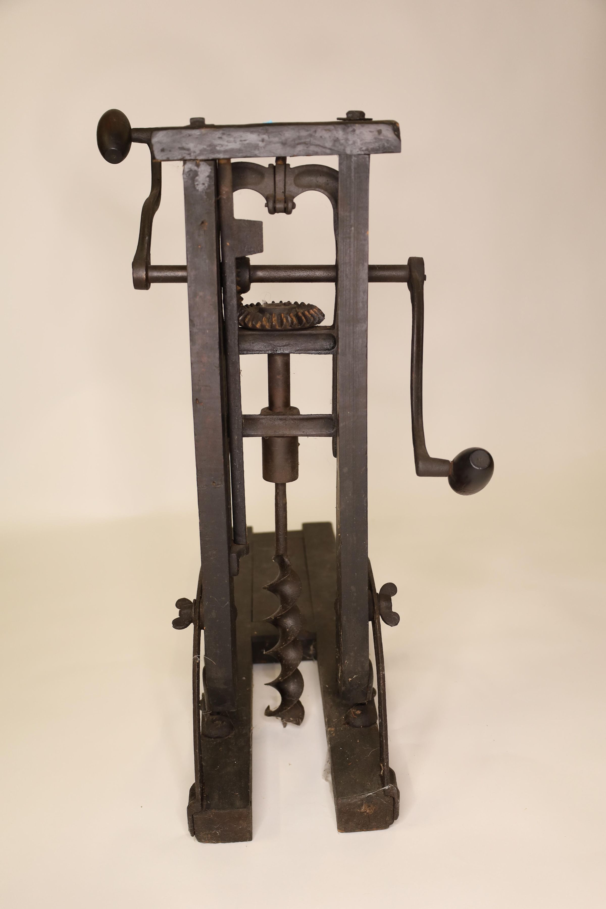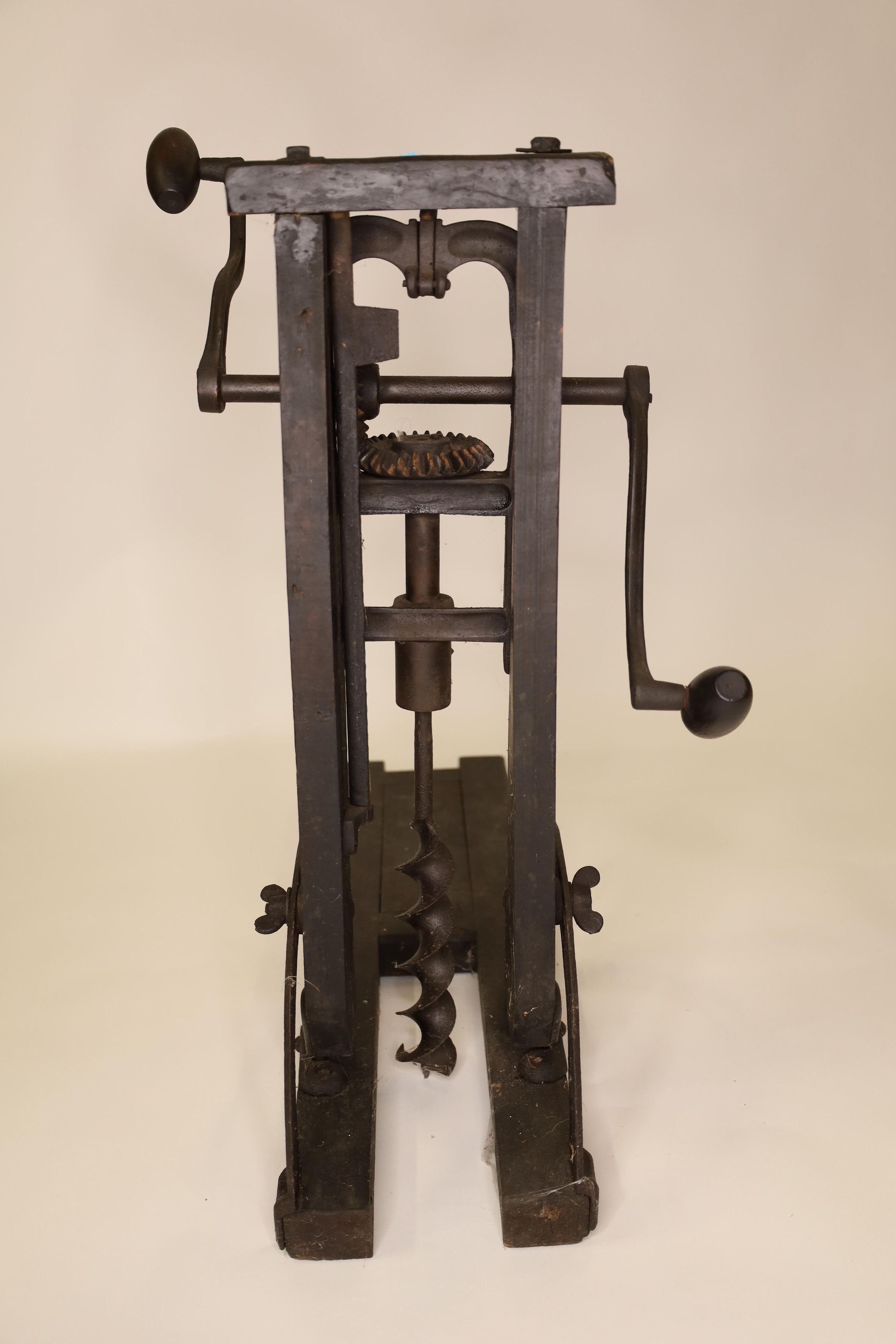 Barn beam drills were used in barn building before electricity, when timbers were held together with wooden pegs. Individual craftsman sat on the drill to fit the peg into the hole.Location