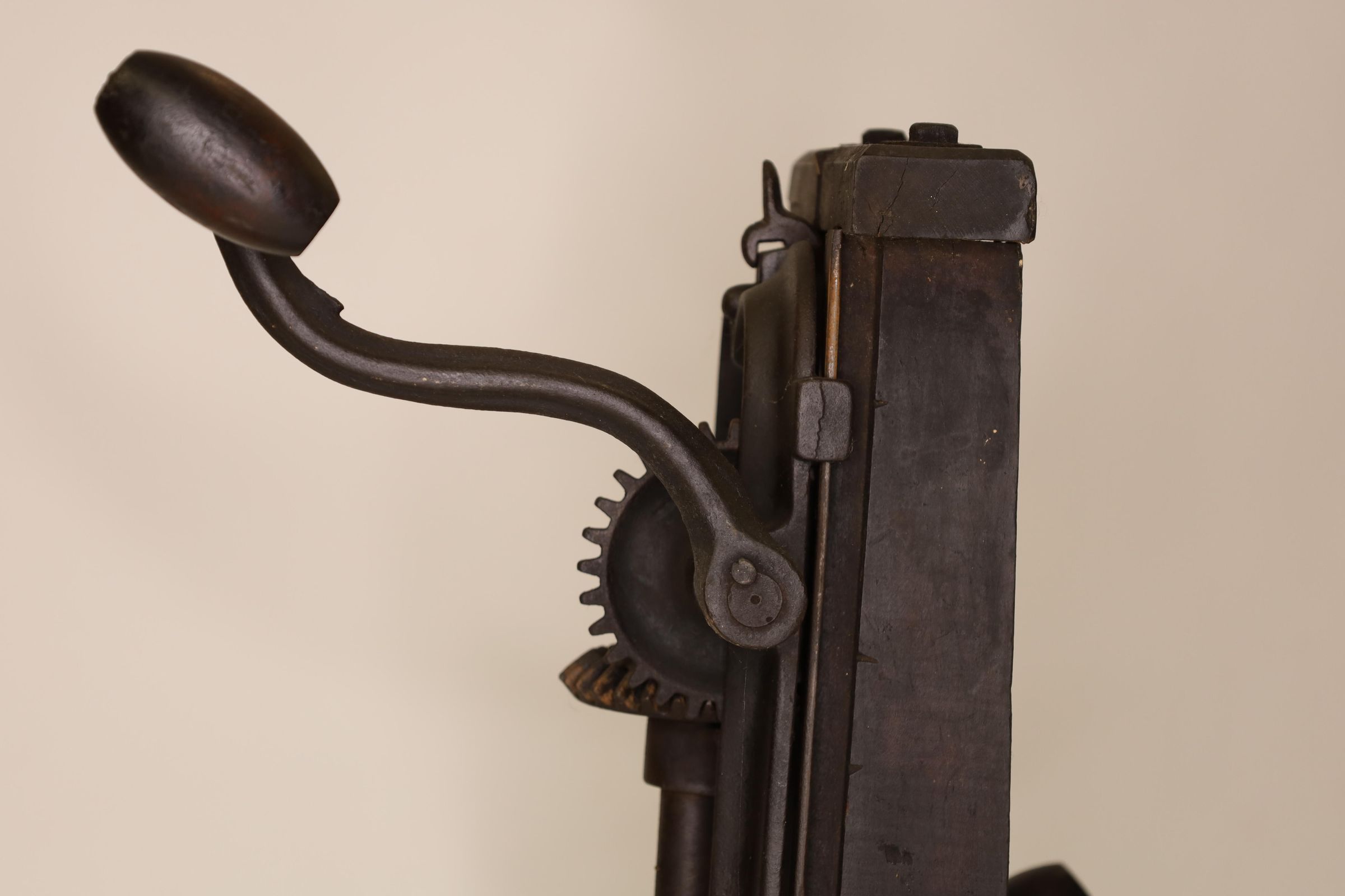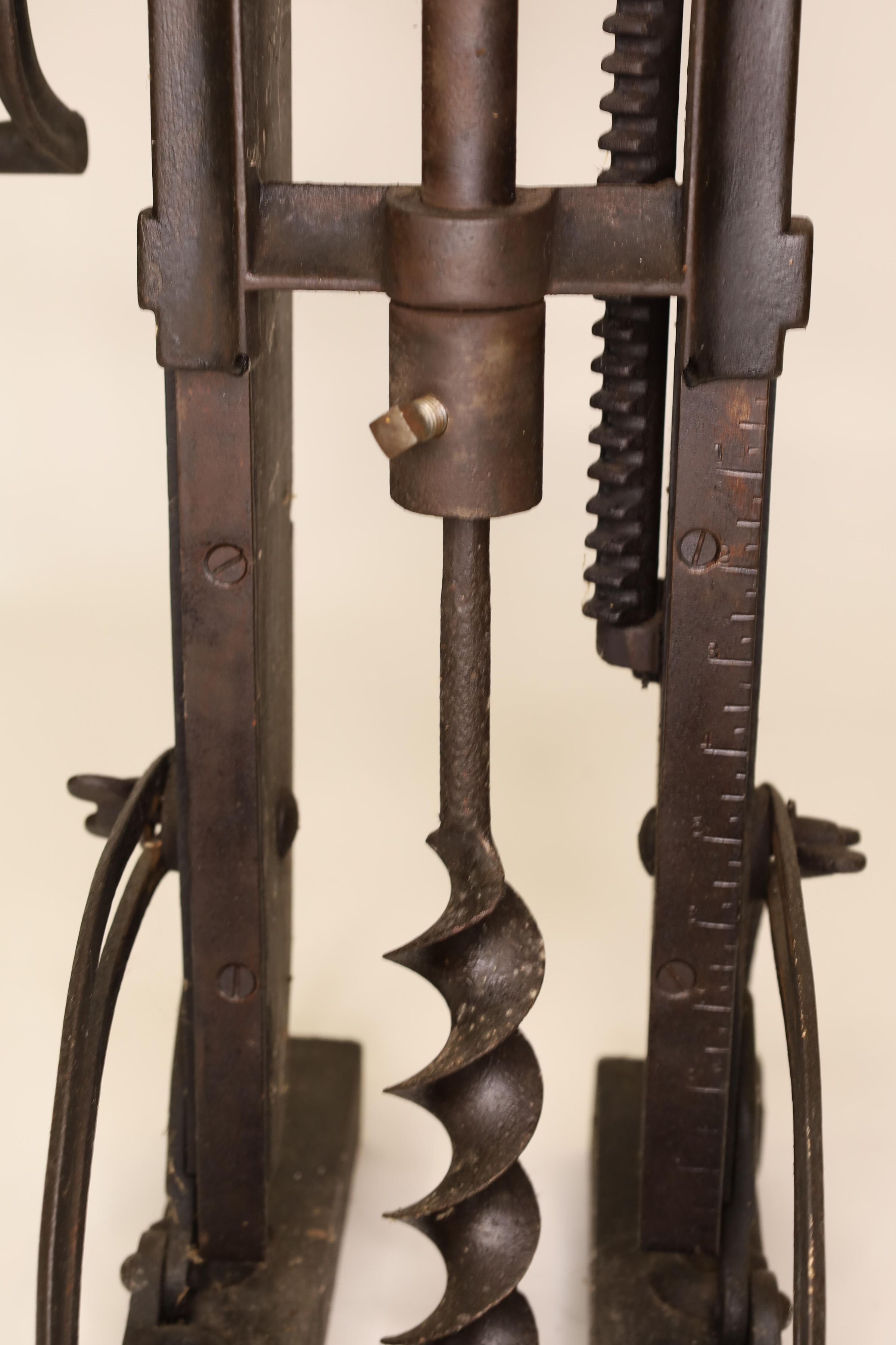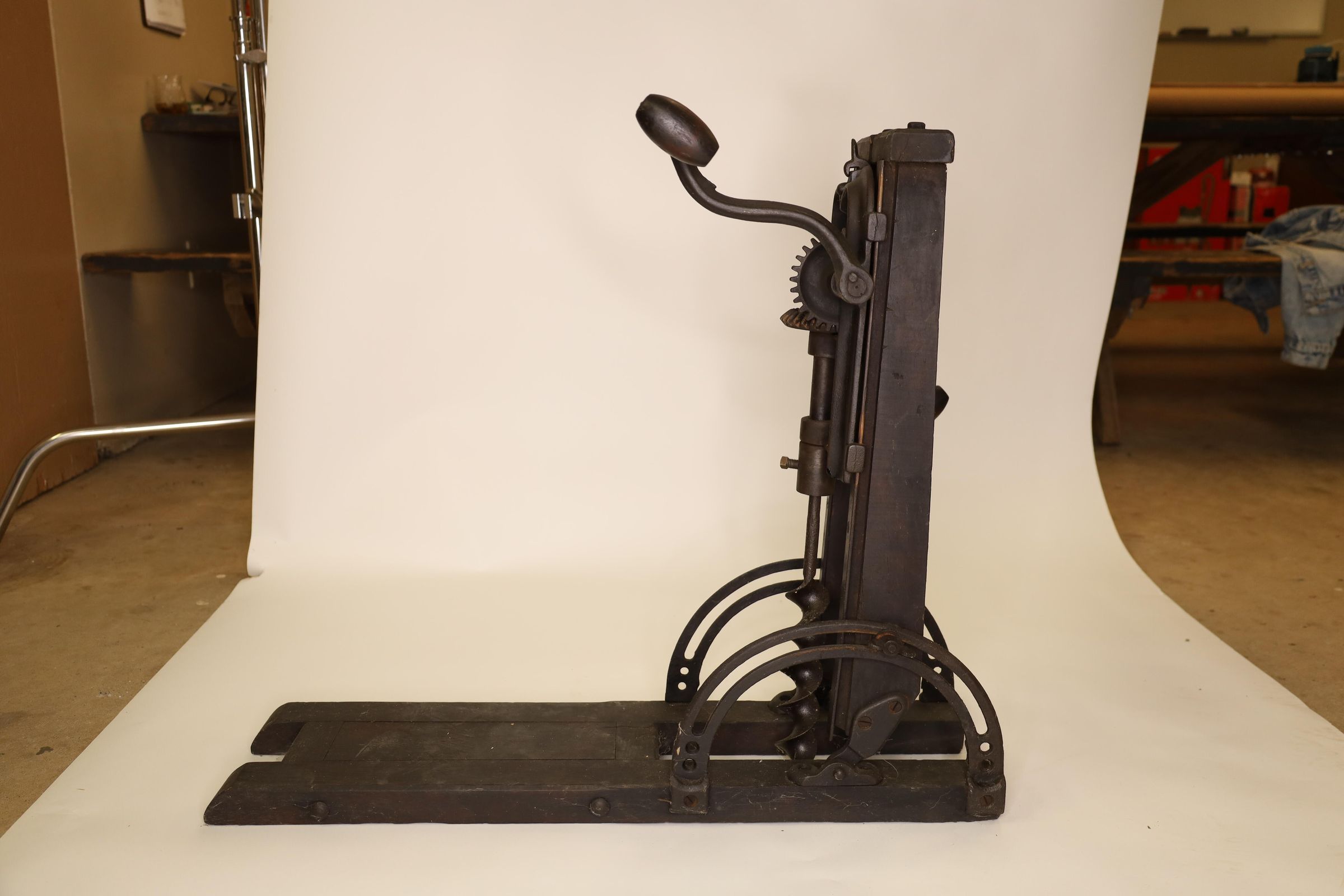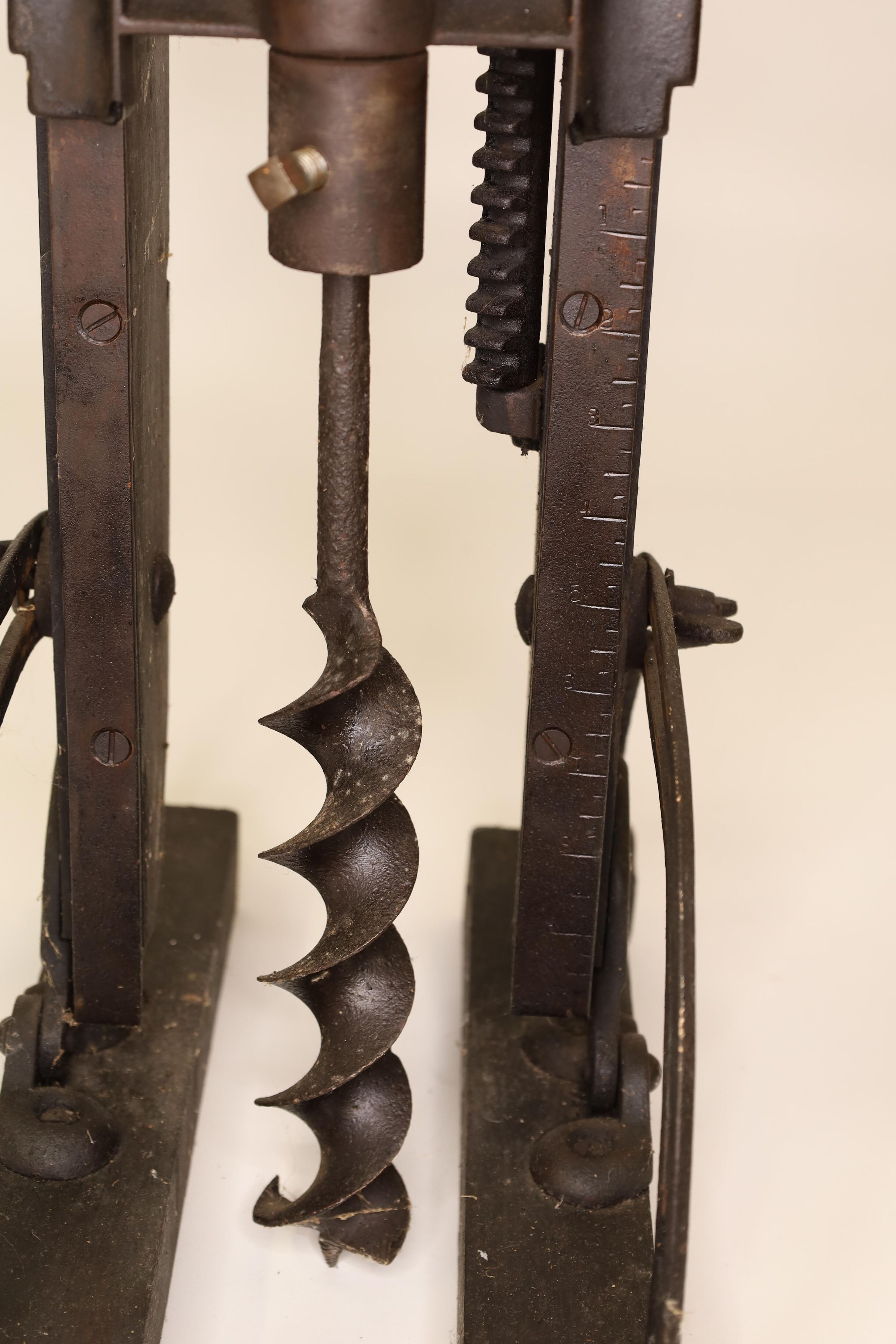 Barn beam drills were used in barn building before electricity, when timbers were held together with wooden pegs. Individual craftsman sat on the drill to fit the peg into the hole.Location