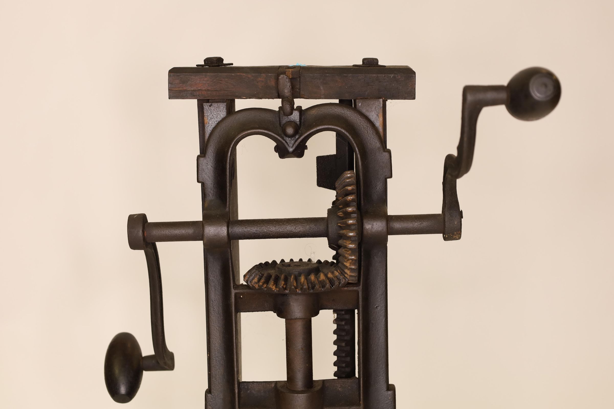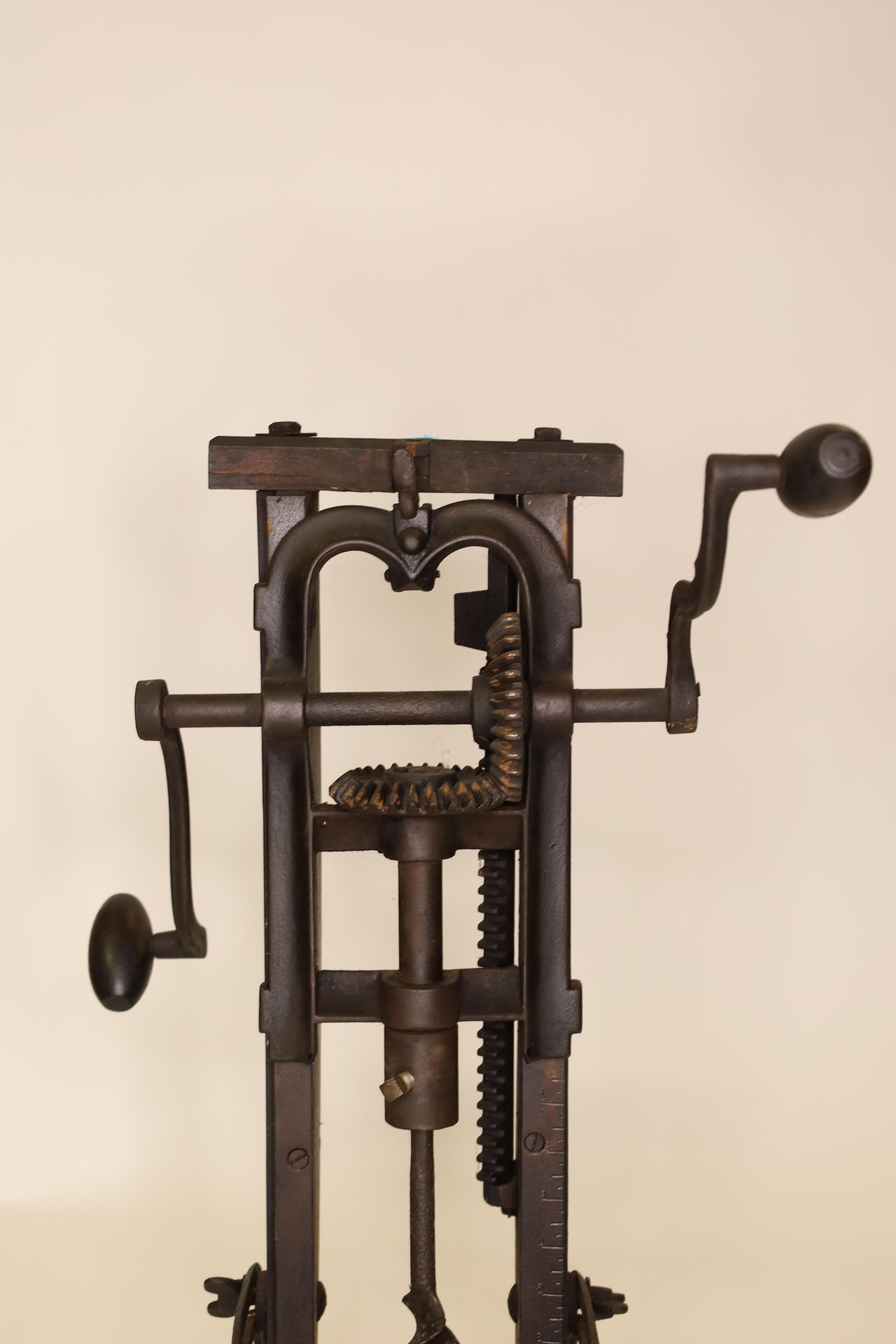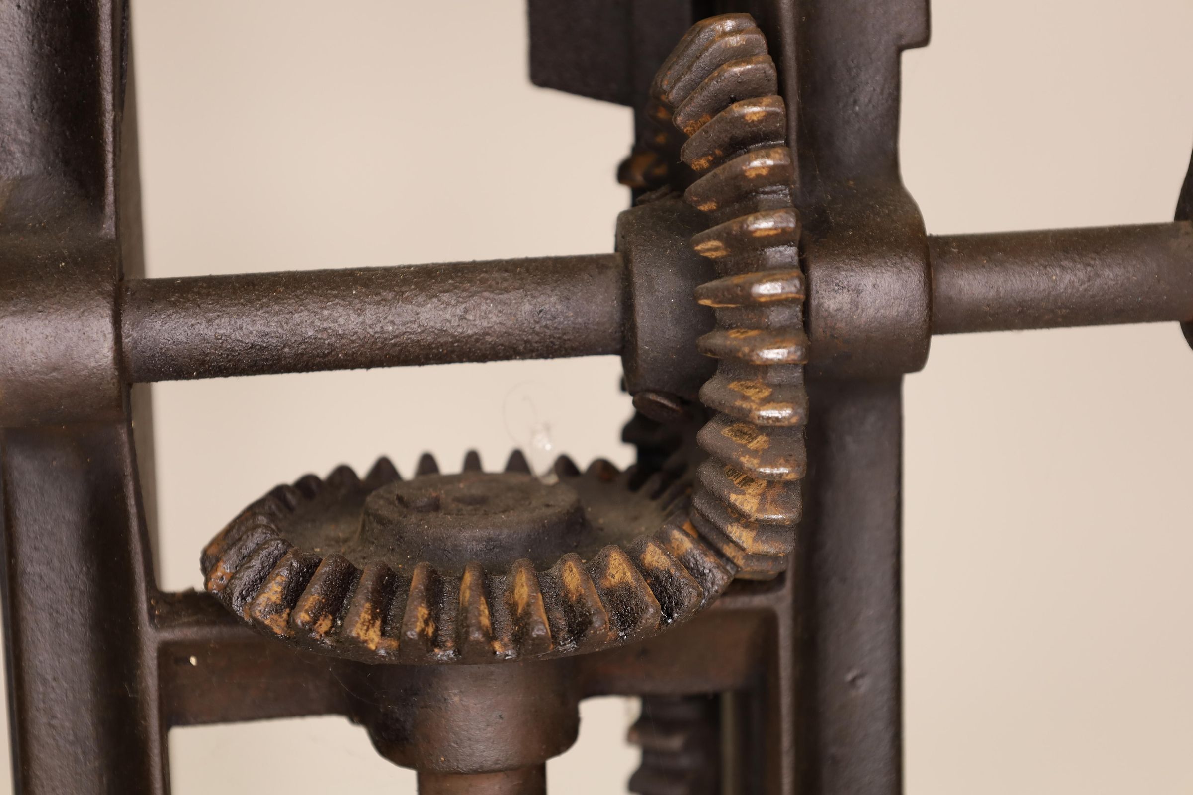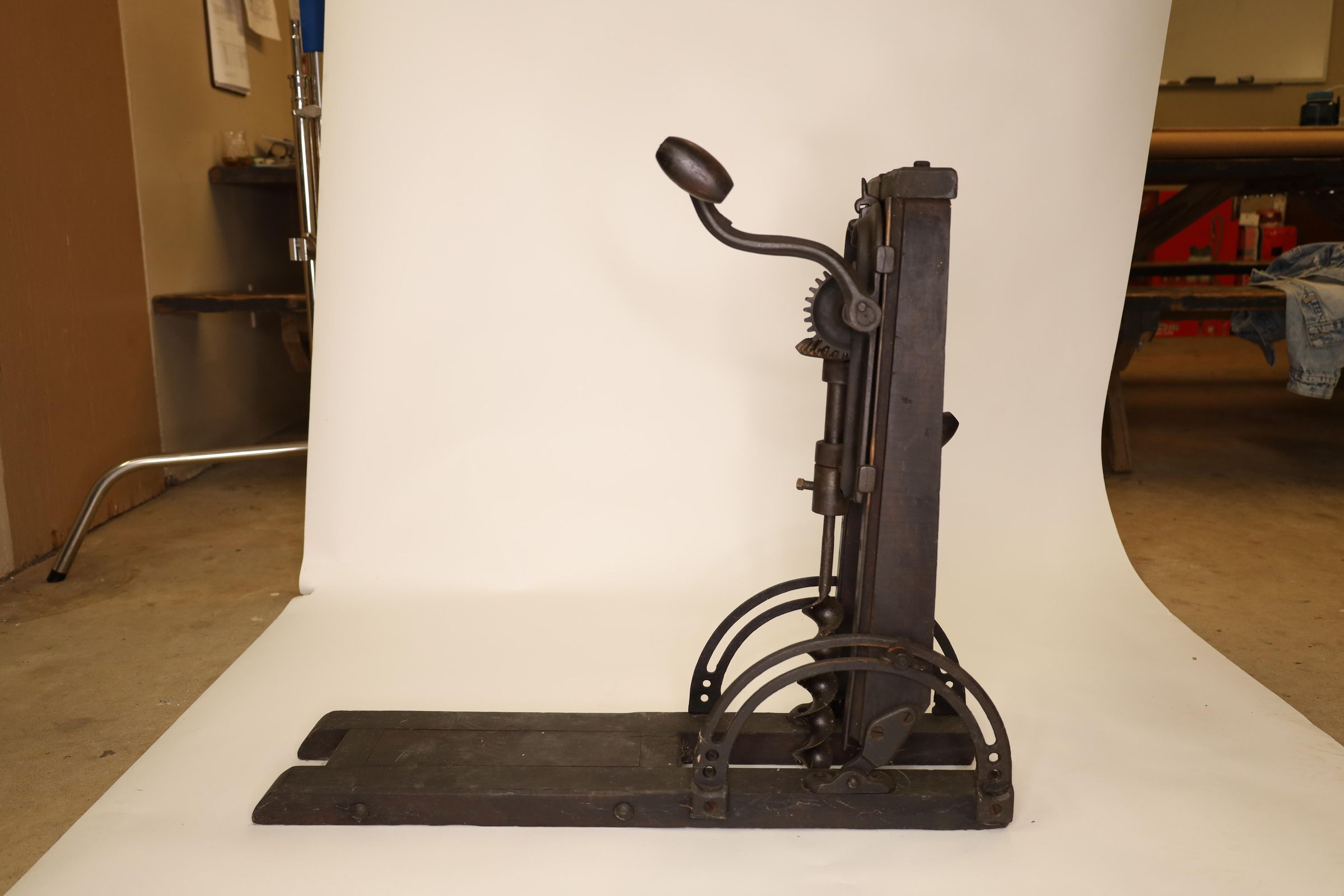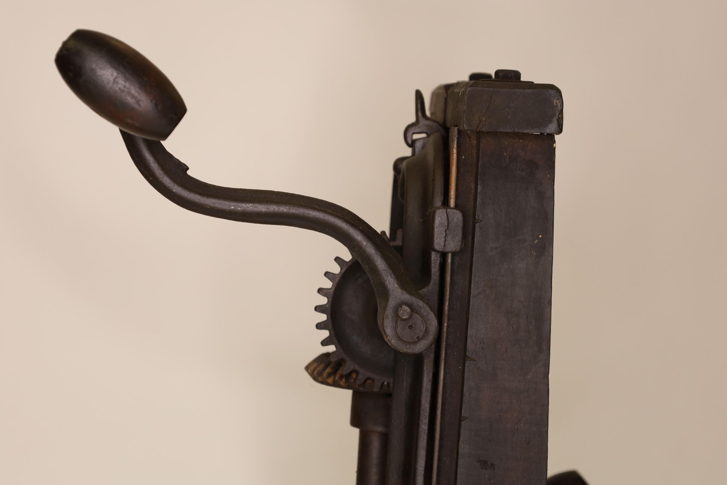 Barn beam drills were used in barn building before electricity, when timbers were held together with wooden pegs. Individual craftsman sat on the drill to fit the peg into the hole.Location