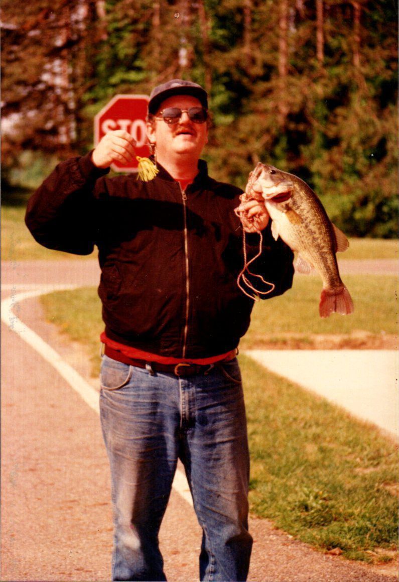 A fisherman named Wes poses for a picture with his lure and a prize 20-inch bass at Mt. Gilead State Park on June 8, 1997.