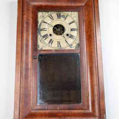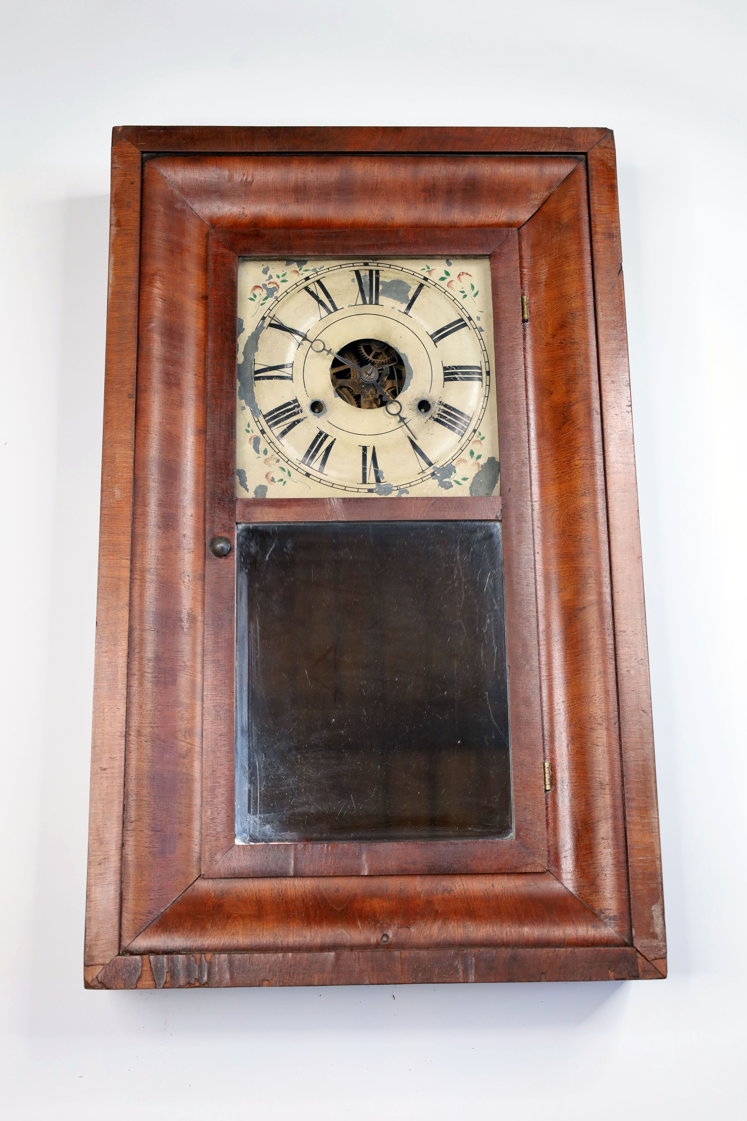 Antique wall clock with mirrored panel. Age and maker unknown.