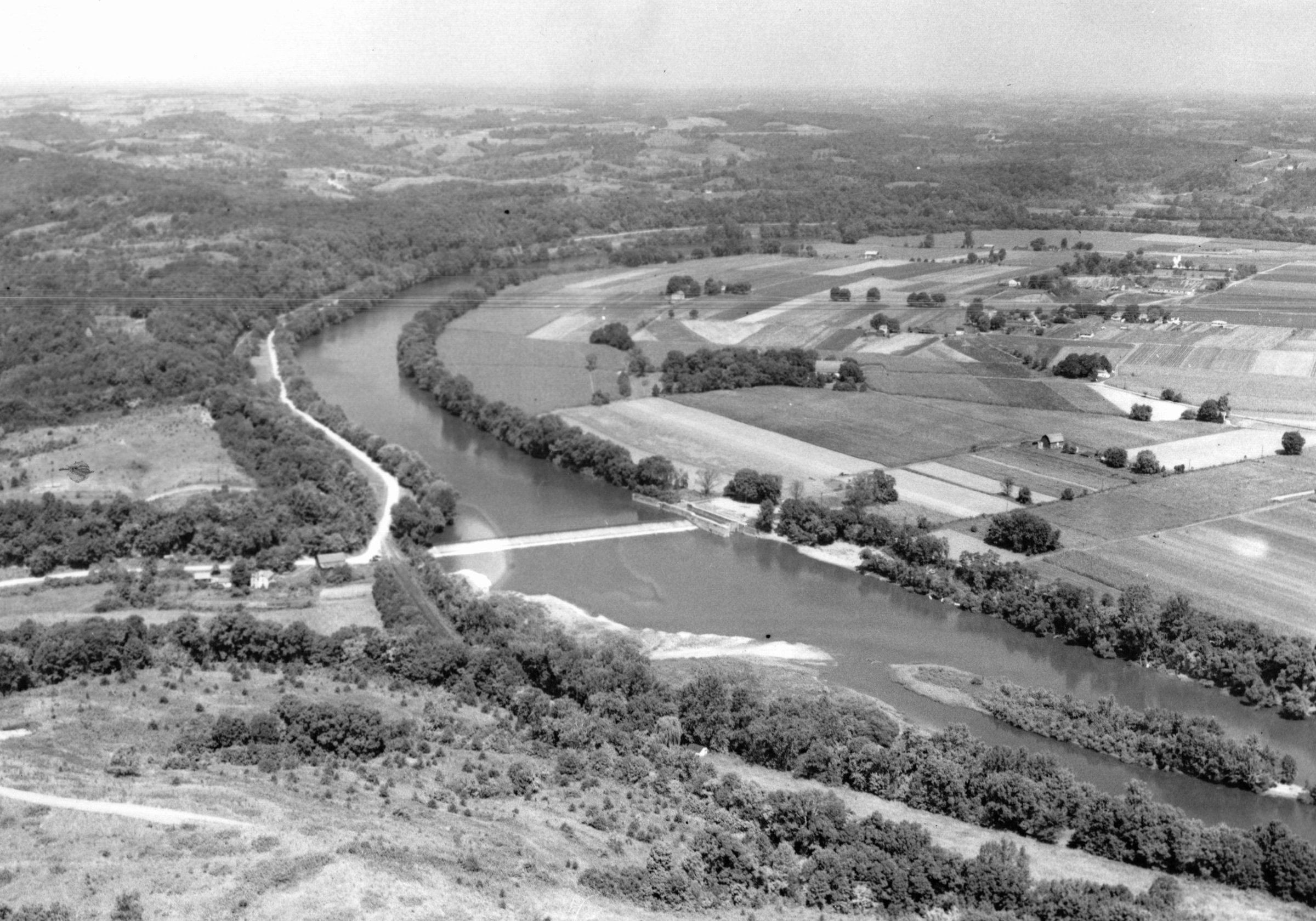 A bird's-eye view of the Muskingum River Lock #2 near Devola. The surrounding landscape is a patchwork of homes, farms, and forests defined by the mighty waterway.Cataloged By