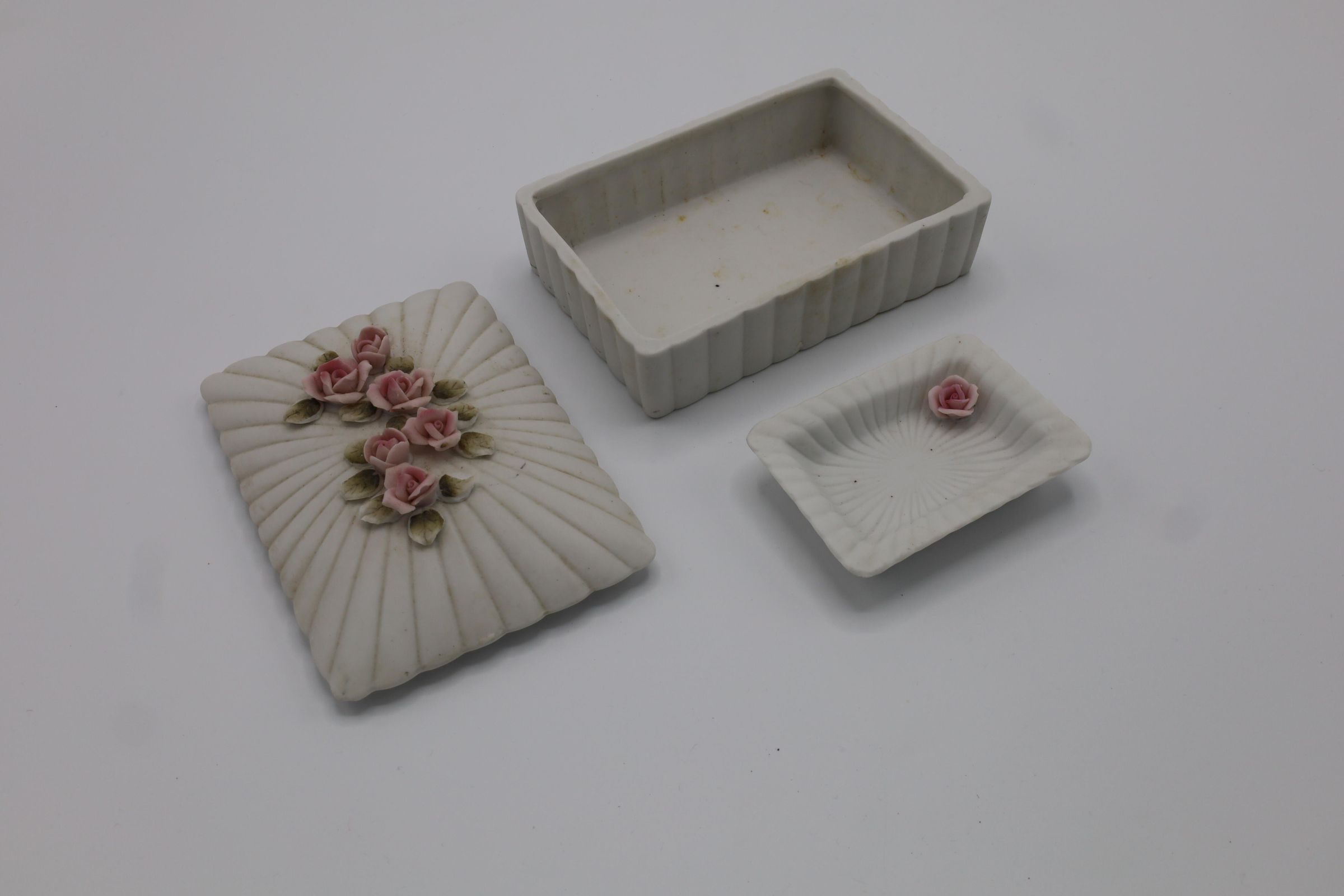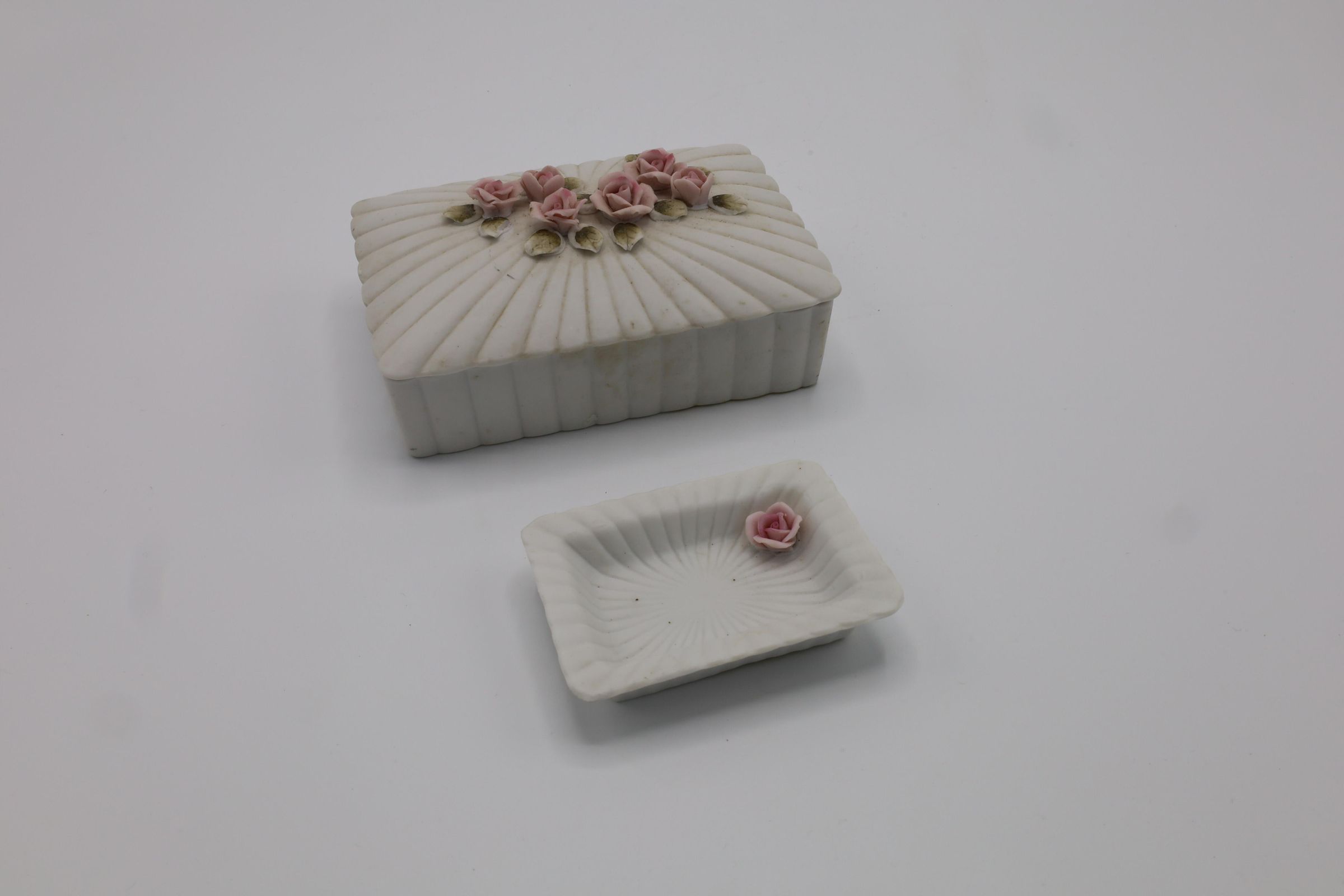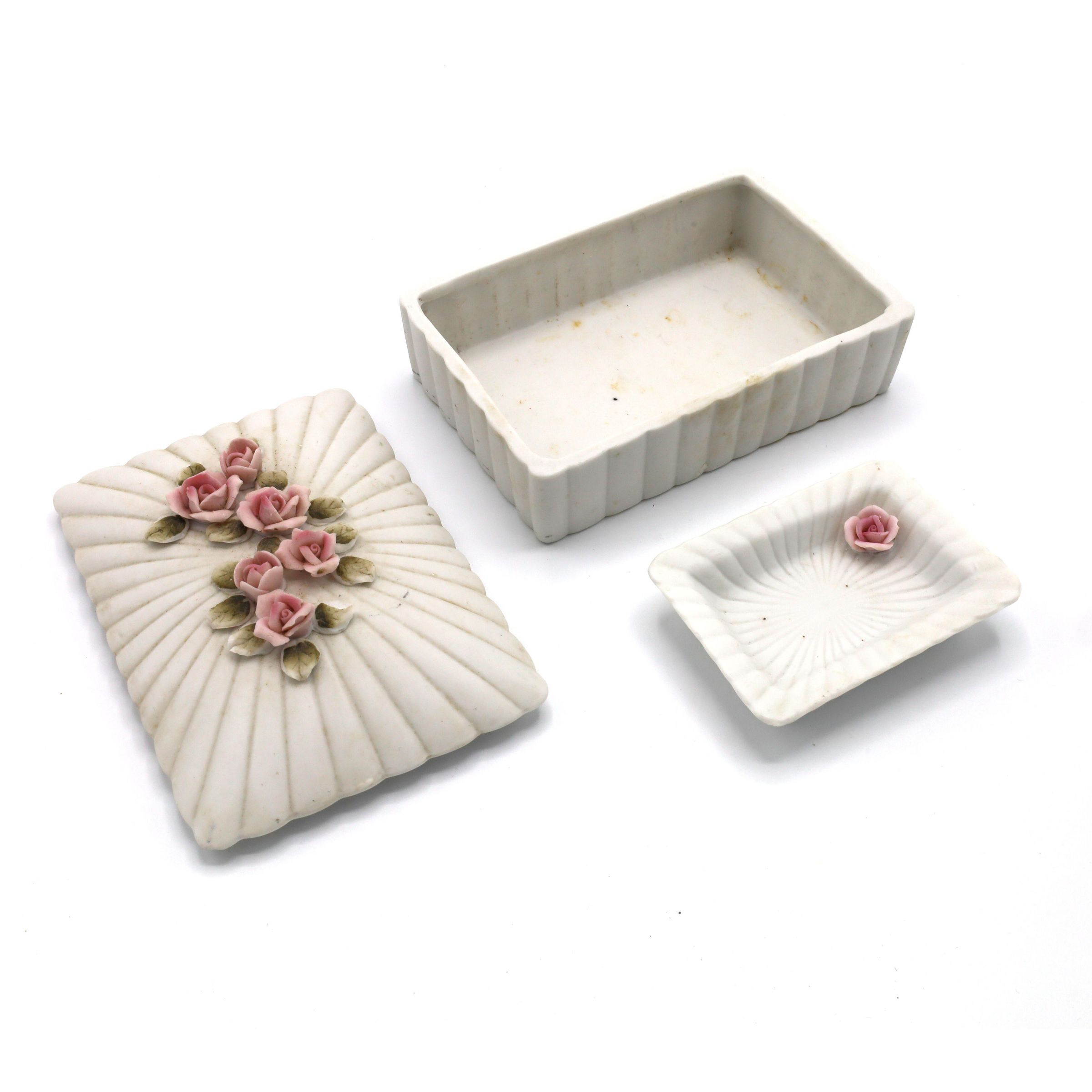 A lidded trinket box and a small tray of bisqueware. It is matte white and decorated with pink roses and green leaves. The small tray has a sticker on the bottom reading "$0.75."