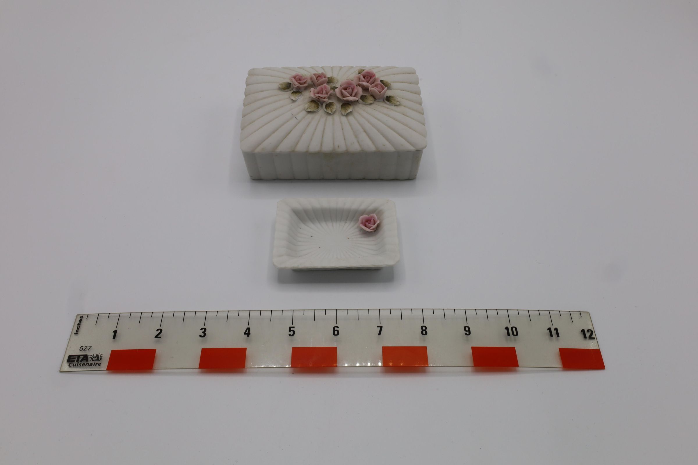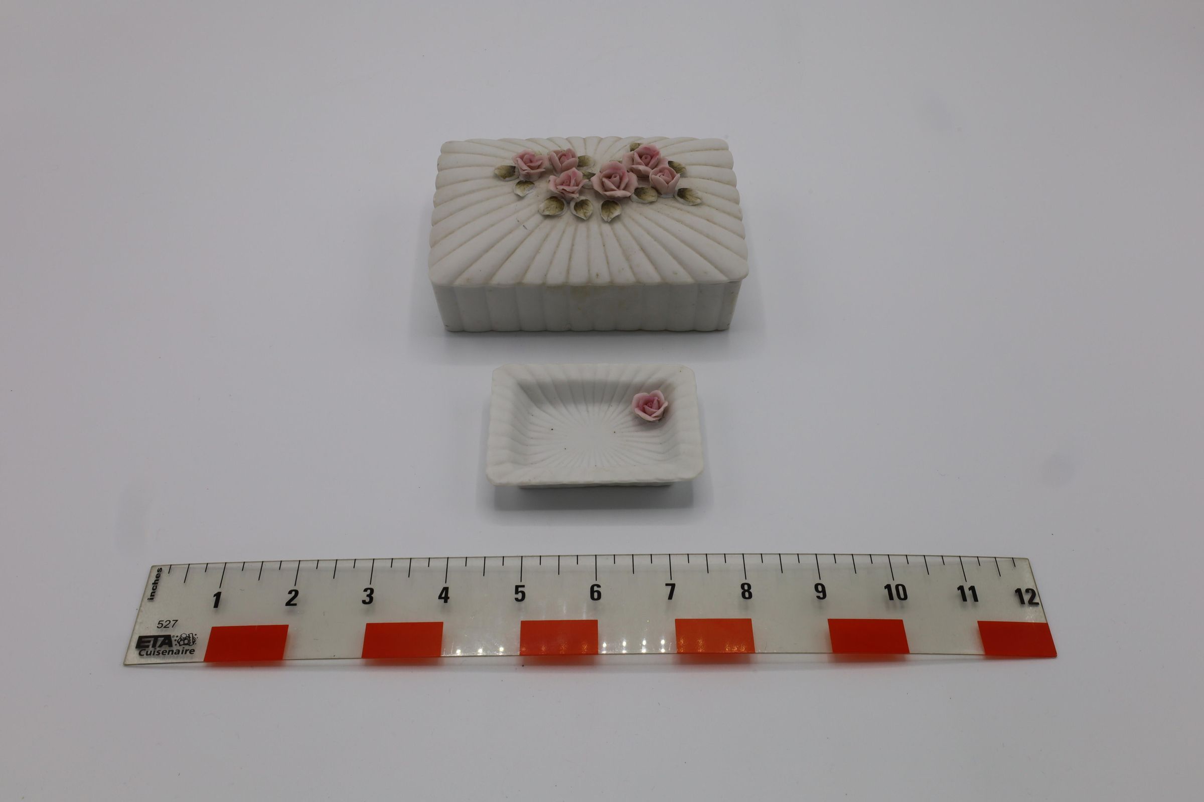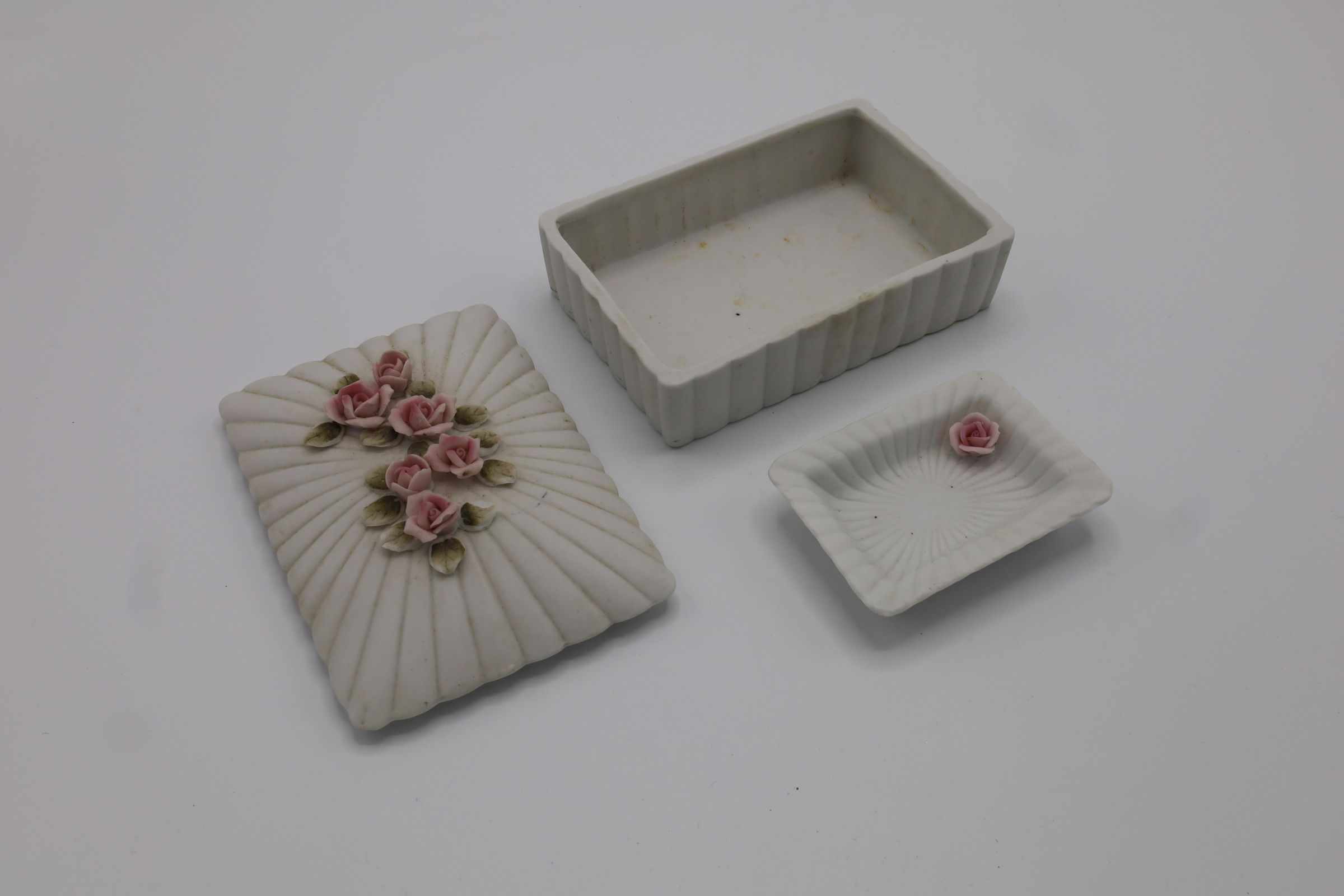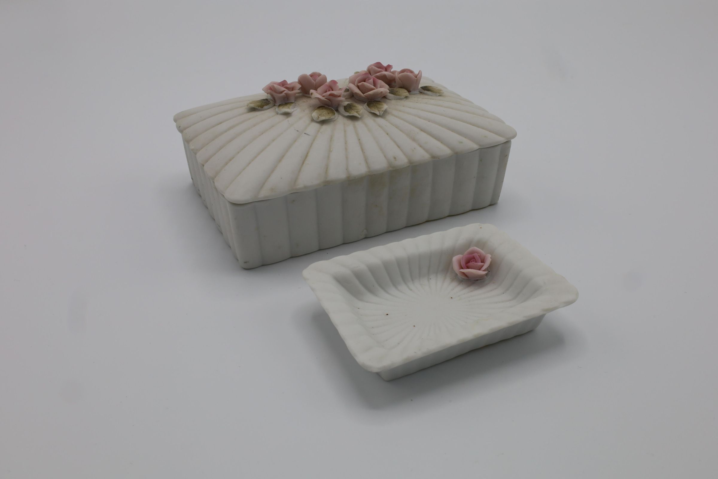 A lidded trinket box and a small tray of bisqueware. It is matte white and decorated with pink roses and green leaves. The small tray has a sticker on the bottom reading "$0.75."