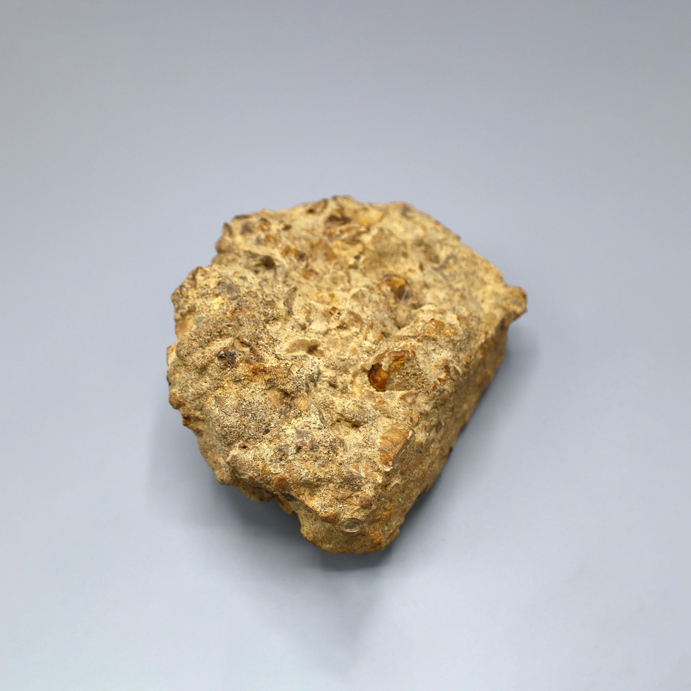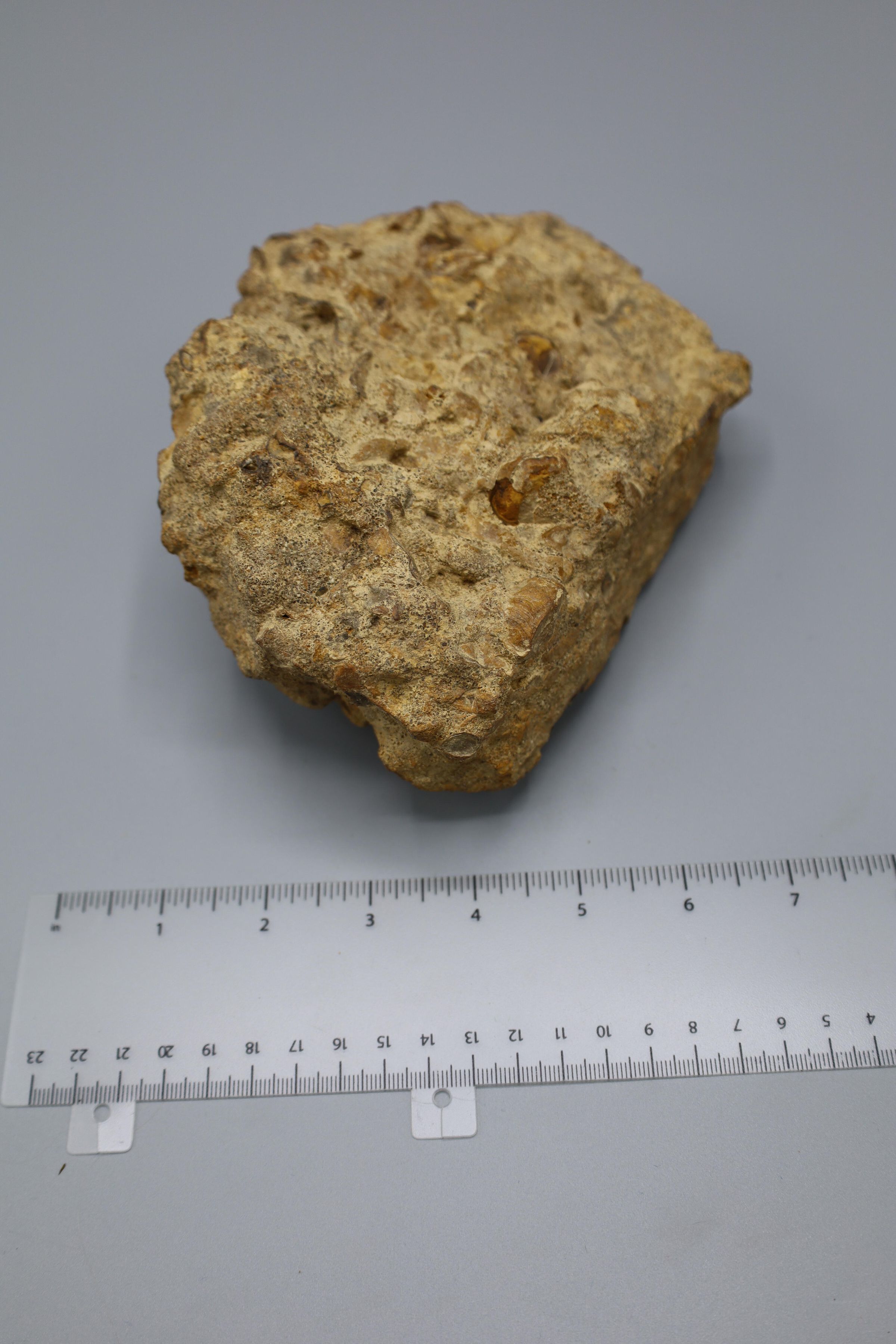 This is a piece of Black Hand sandstone. Black Hand Sandstone makes up many of Ohio's geological features, including Old Man's Cave, Cedar Falls, and Rock House in Hocking Hills. Named after an Indigenous petroglyph of a black hand in Black Hand Gorge near Newark, Black Hand Sandstone "is a coarse, sometimes conglomeratic quartz sandstone […and is] massive in nature, without many discrete beds or major changes in its consistency" ("Blackhand Gorge"; Hartshorn). Covering a range of colors from red to brown to cream, Black Hand sandstone "forms sheer cliffs and gorges" and often features waterfalls (United States Geological Survey; "Black Hand Sandstone"). Additionally, it may show "cross-bedding, the angled bedding of ancient ripples or dunes, and graded beds, where layers of coarse pebbles transition upward into layers of smaller pebbles and then into the sand, an indication of sorting by water" (Hartshorn).Location