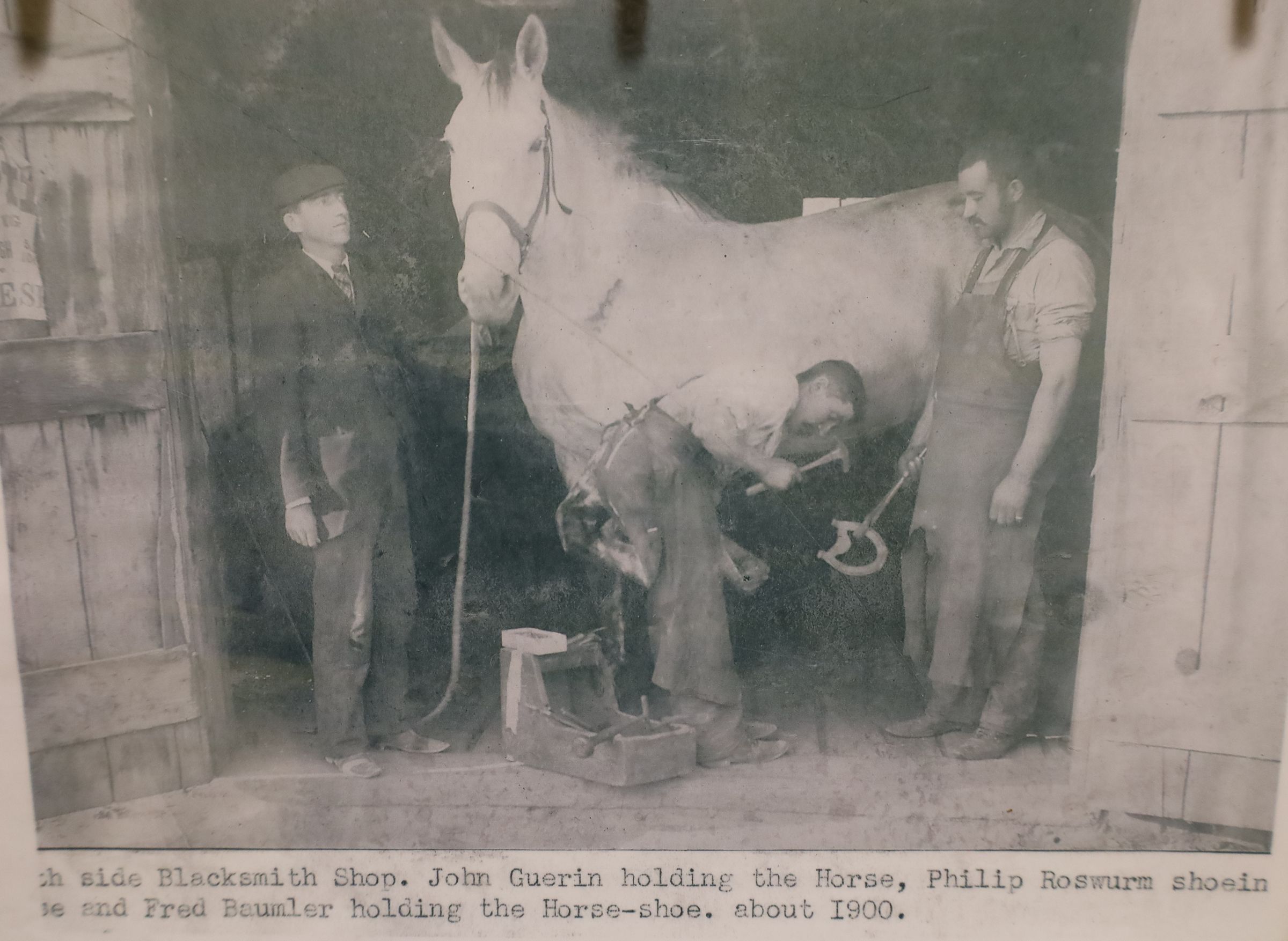 This picture, taken circa 1900, inside a blacksmith shop on Kelleys Island features Phillip Roswurm shoeing a horse with Fred Baumler holding the horseshoe and John Guerin holding the horse.Context