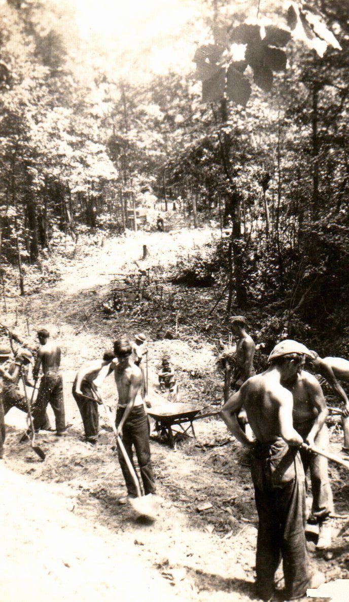 The men of Civilian Conservation Corps (CCC) Company 503 perform the strenuous task of blazing a trail through a dense forest.