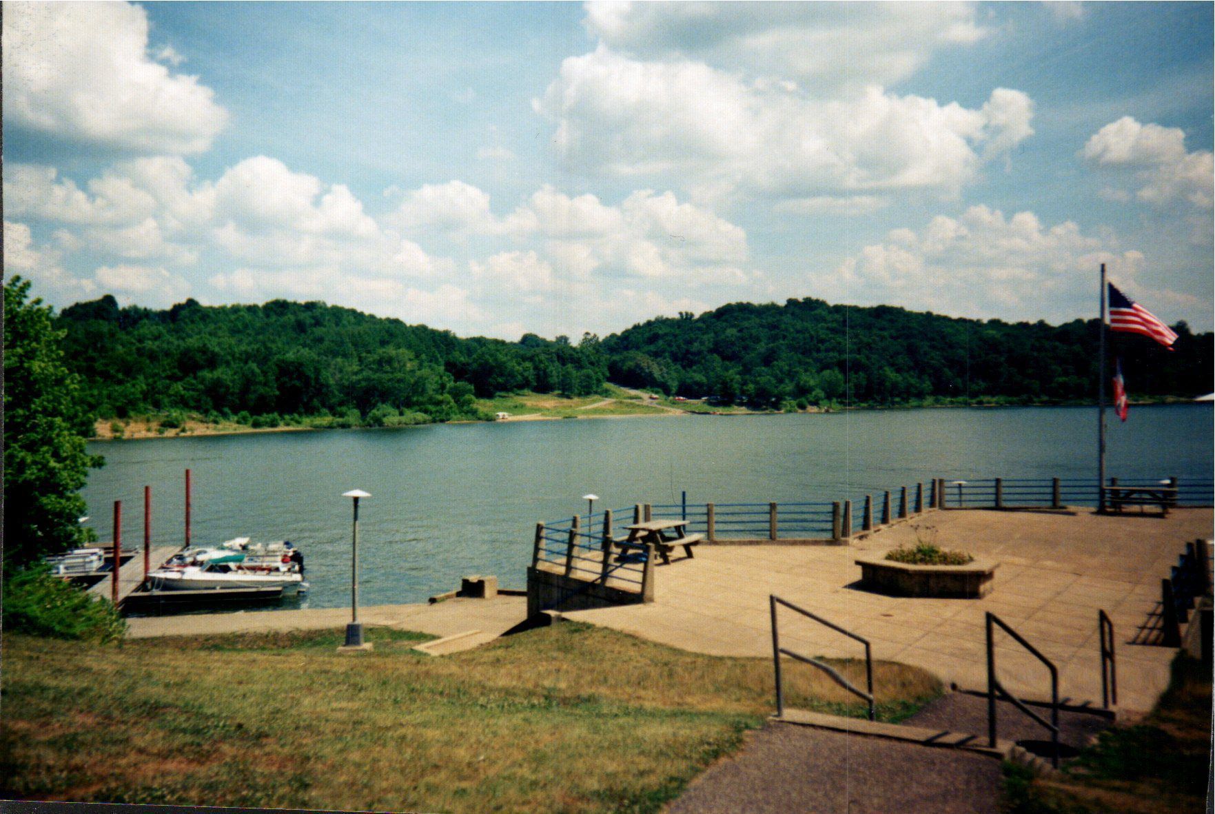 A gentle breeze blows the flags at Dillon Lake's Marina. A handful of boats are docked at the pier. Clouds punctuate a blue sky.