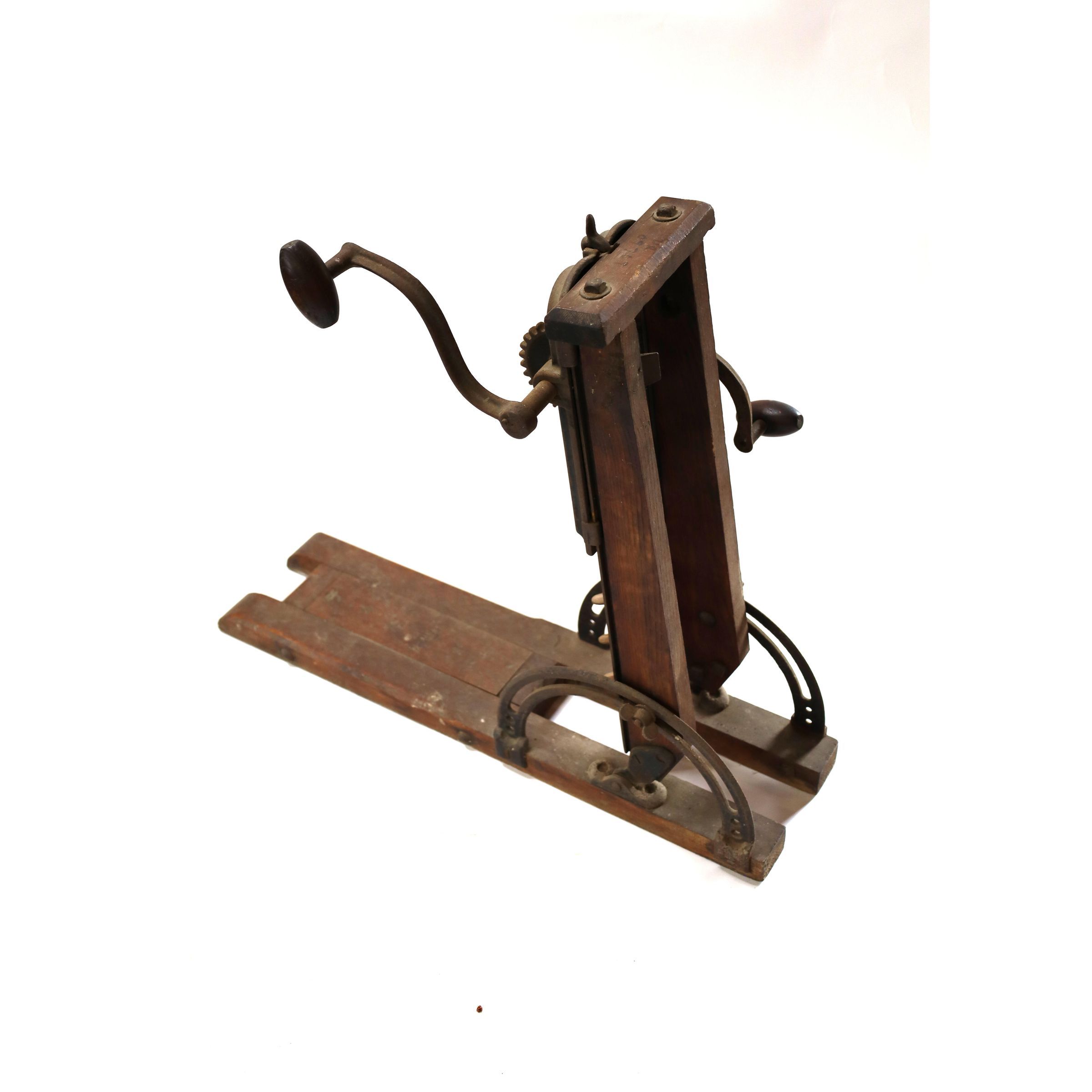 This hand-crank boring machine is constructed of wooden planks held together by metal screws and hinges, as well as two handles connected to metal gears and a drill bit. In addition, there are two metal, semi-circular guides attached to the bottom of either side to assist in the creation of holes at any angle.Location