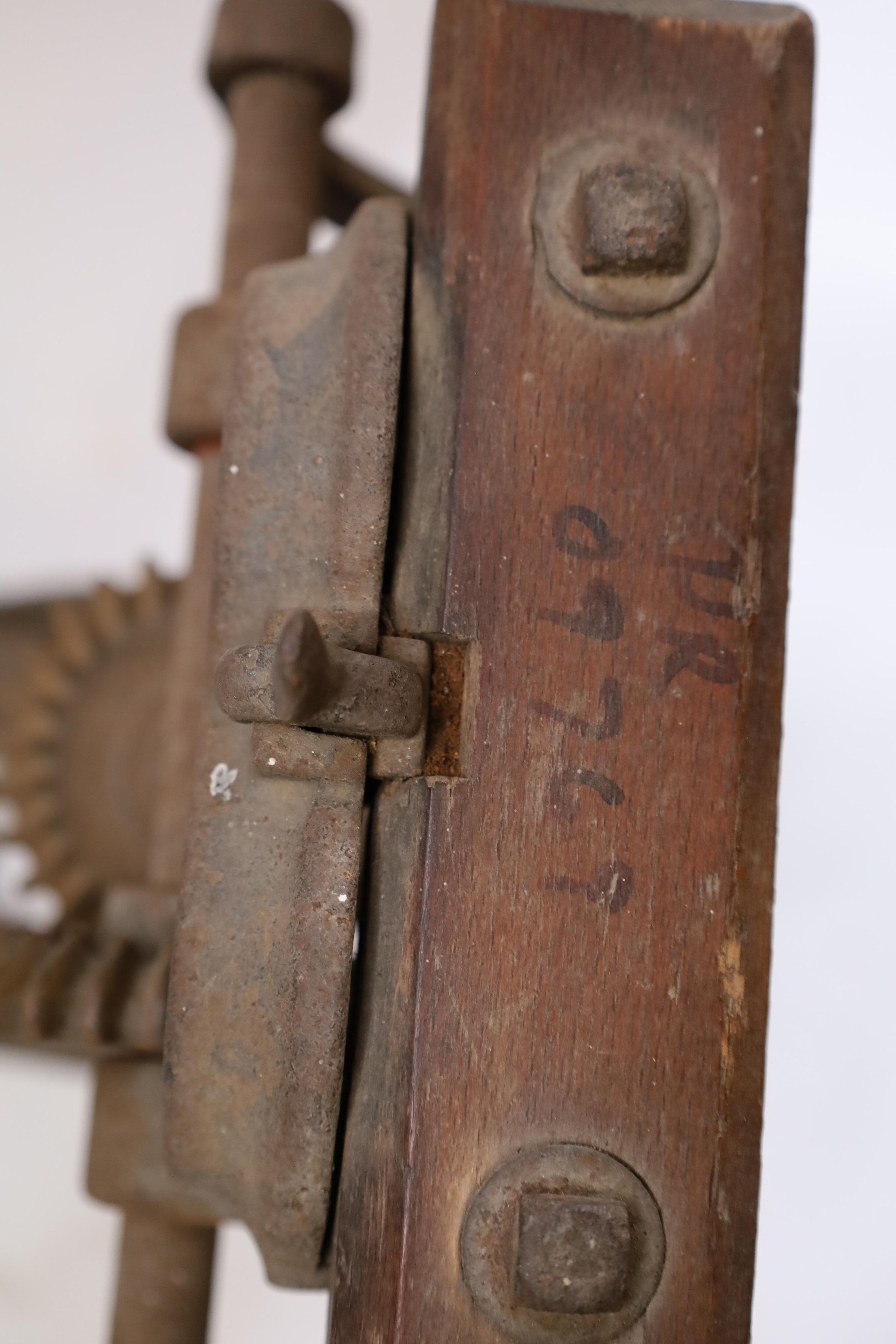 A boring machine or beam drill like this made building easier. Different size augers bits were available to attach to this hand-cranked machine to make holes in beams. A carpenter would mark the location where they would need to drill and then place this device on top of the beam, lining up the auger with the mark. The carpenter then sat on the extended part of the base, called a 'seat', and used both hands to turn the handles which rotated and lowered the augur into the wood, which drilled out a hole for connecting mortise and tenon joint construction.