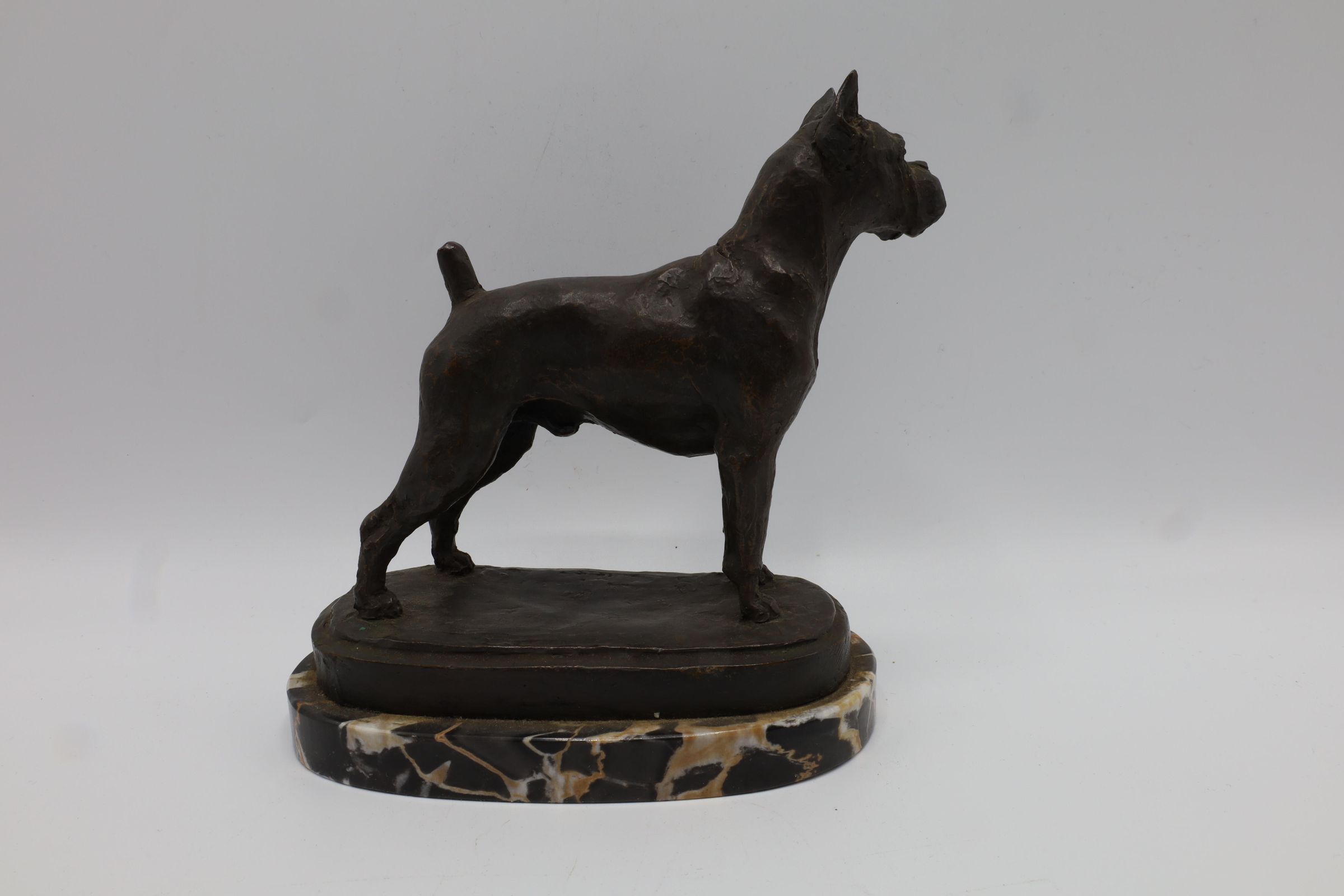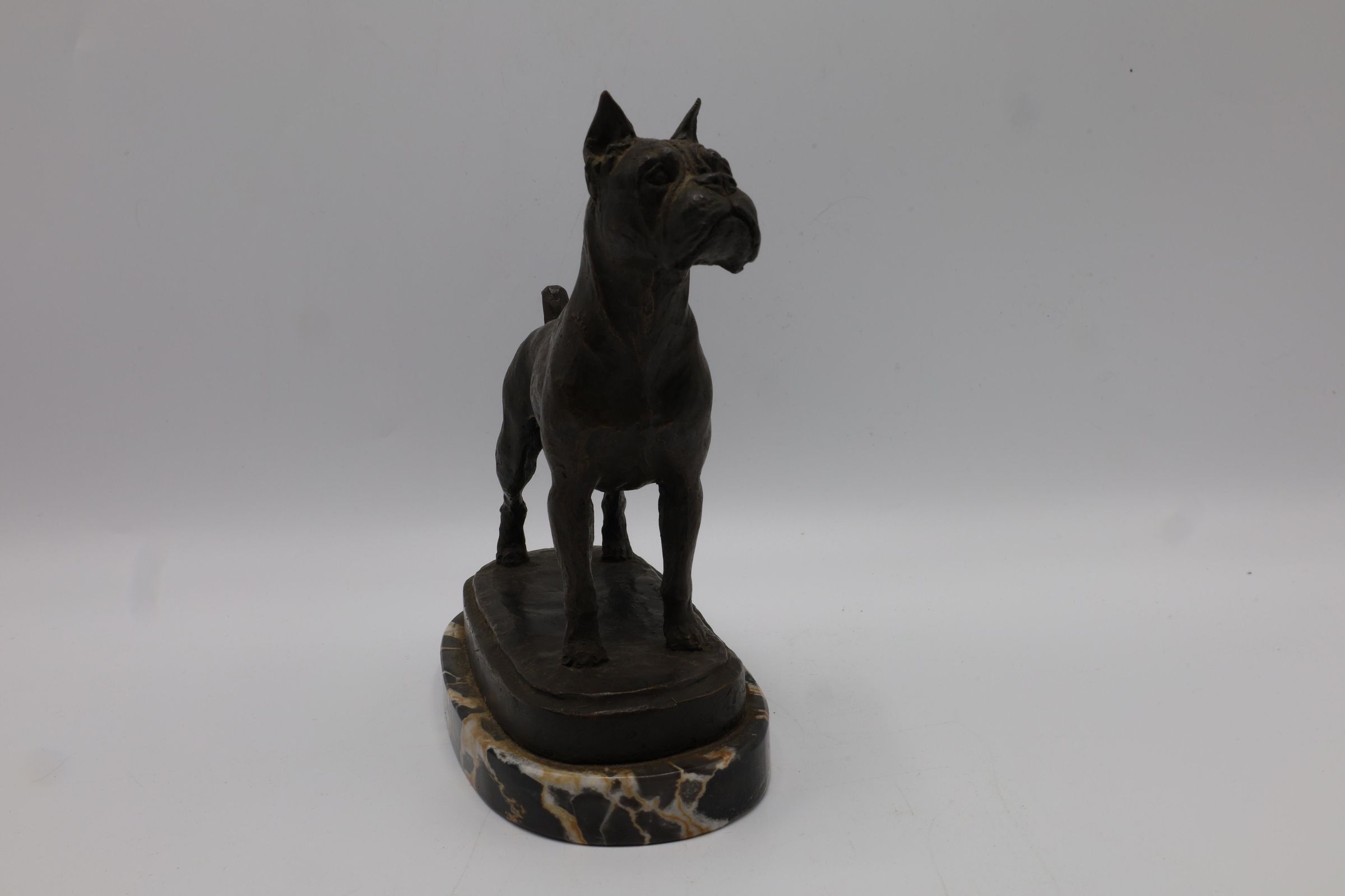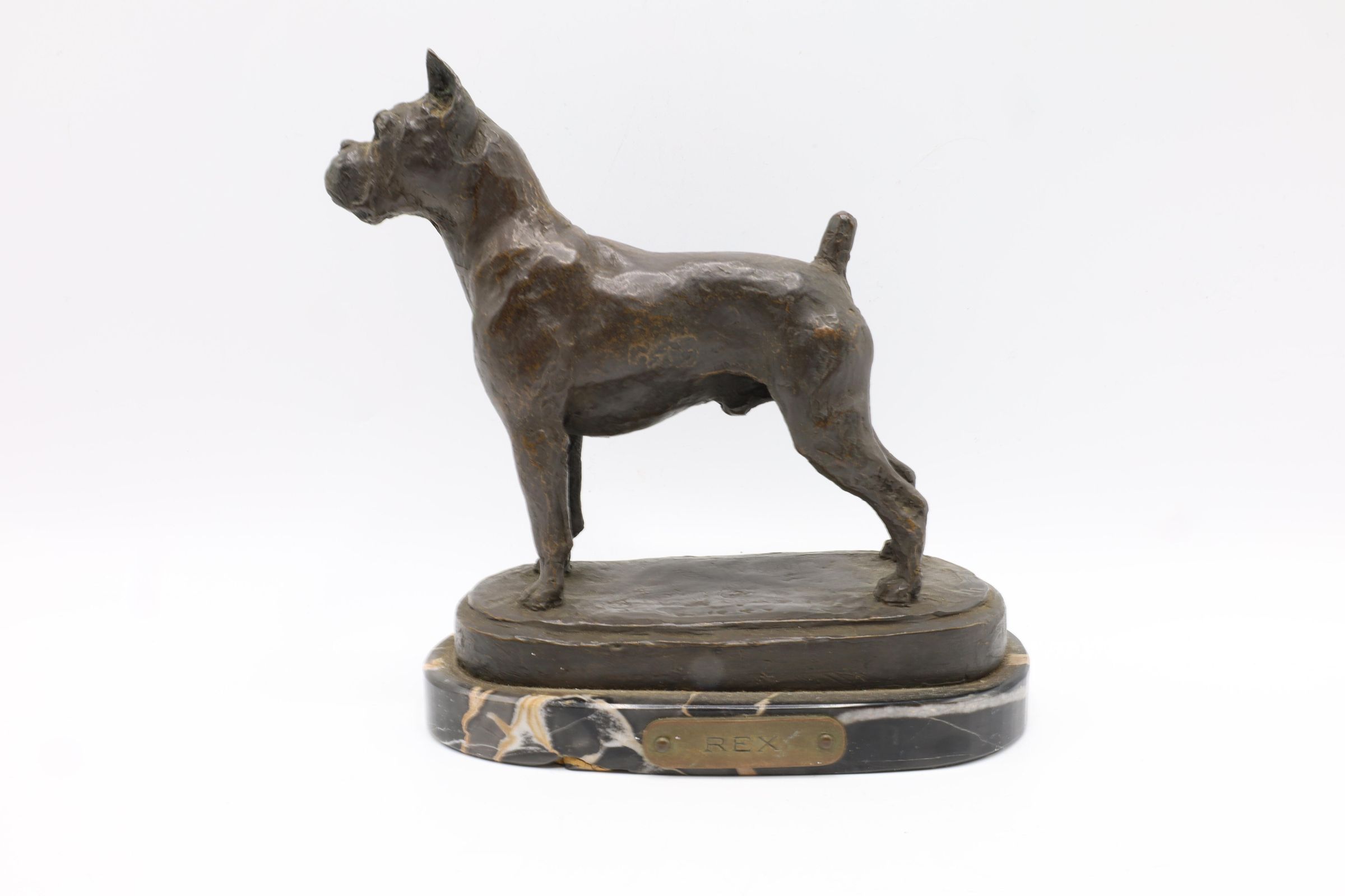 A small figurine of a Boxer dog mounted on a marble base. A small metal plate attached to the base is engraved with the word "Rex ."Rex was Louis Bromfield's first Boxer.Context
