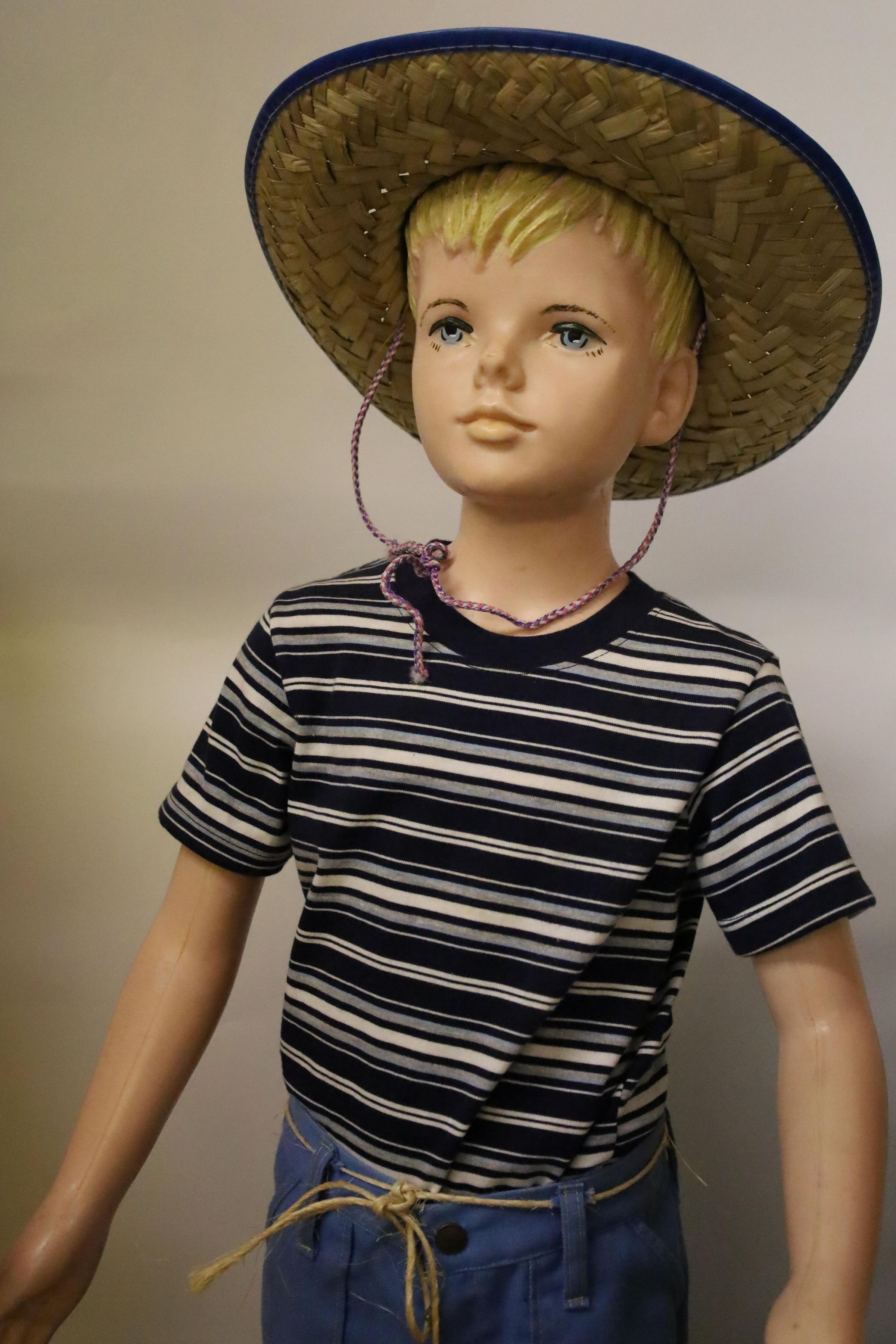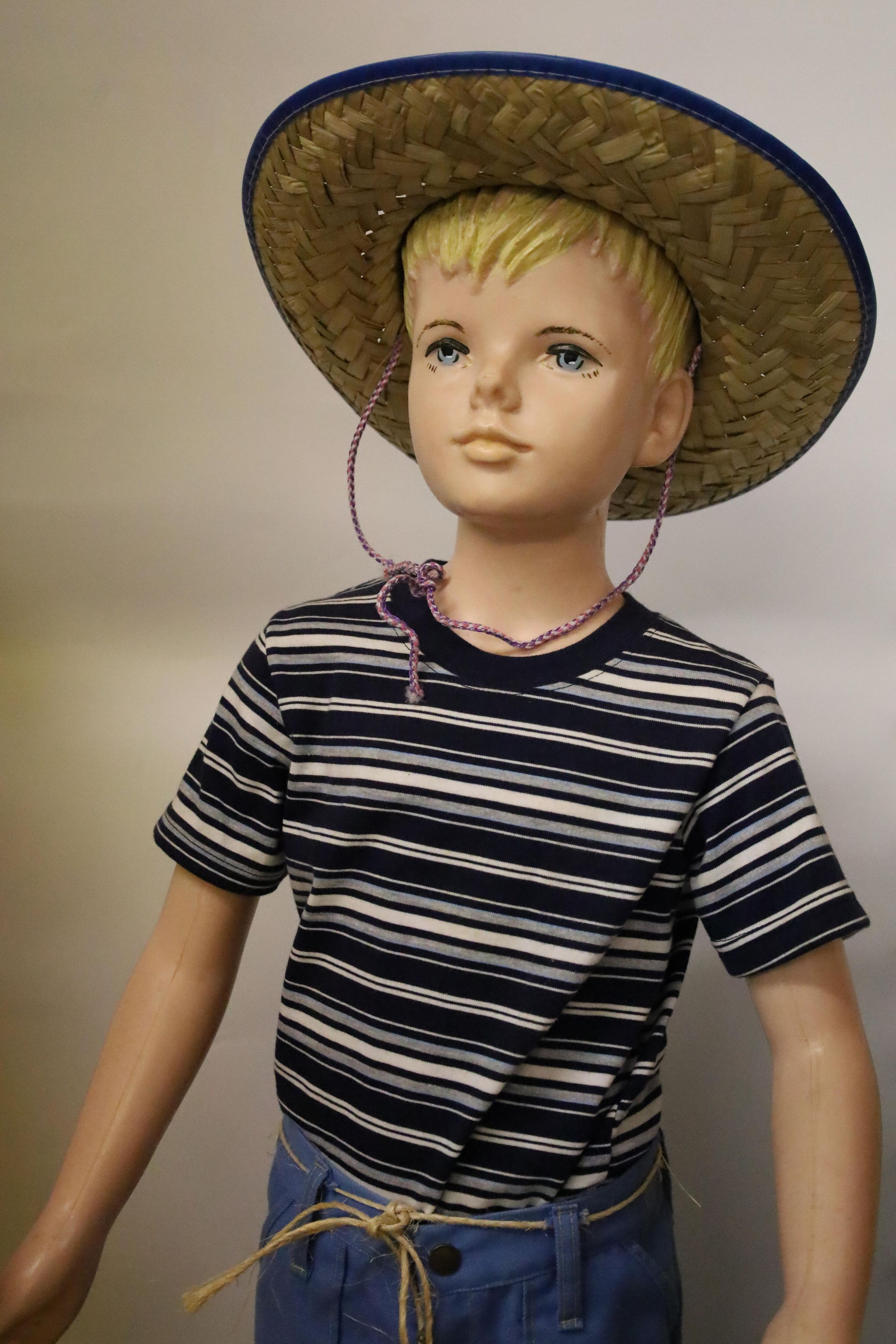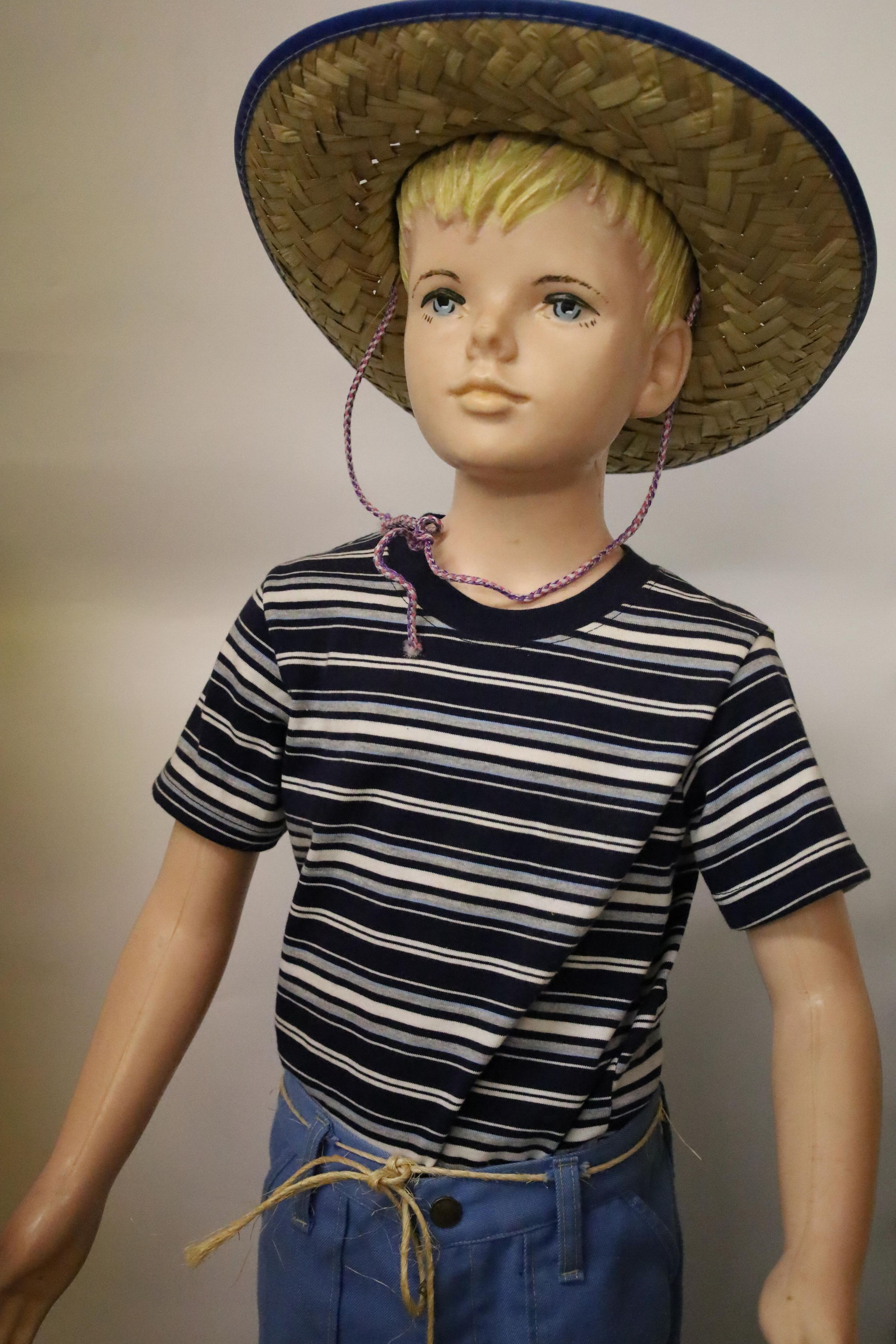 This 1950s boy mannequin was used as a display for Buster Brown Shoes. He is now displayed at the Nature Center at Lake Loramie. He is wearing jeans with a rope belt, a striped tee-shirt and a straw hat.