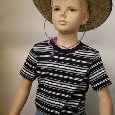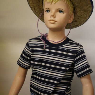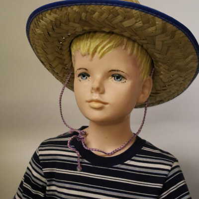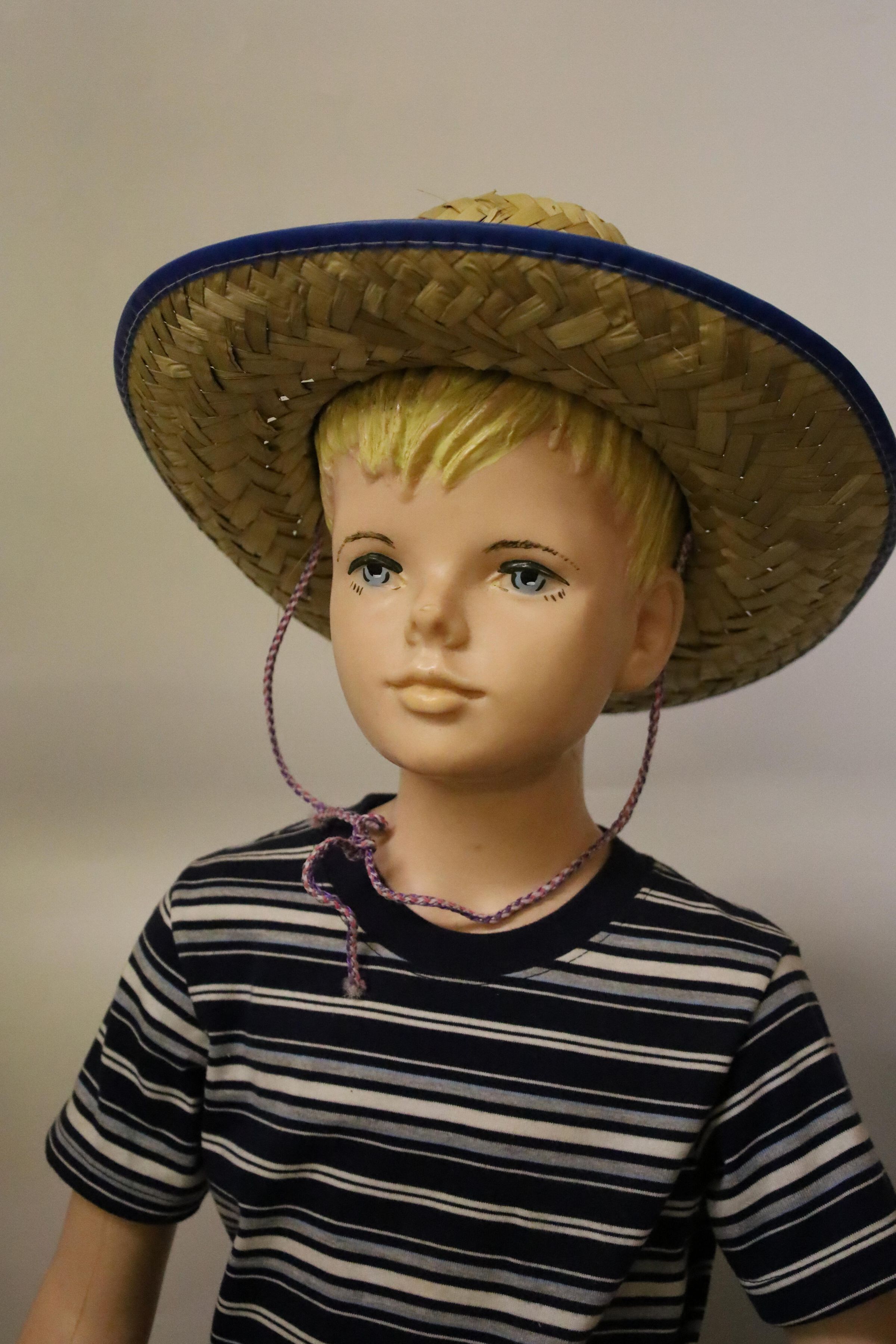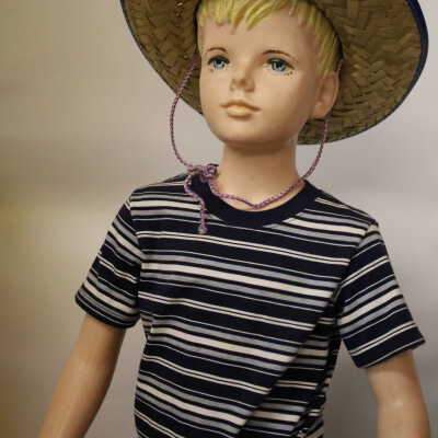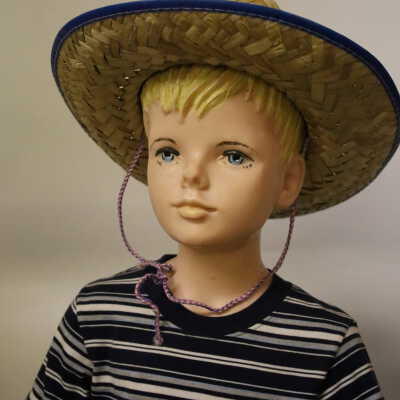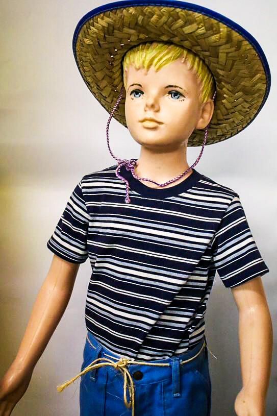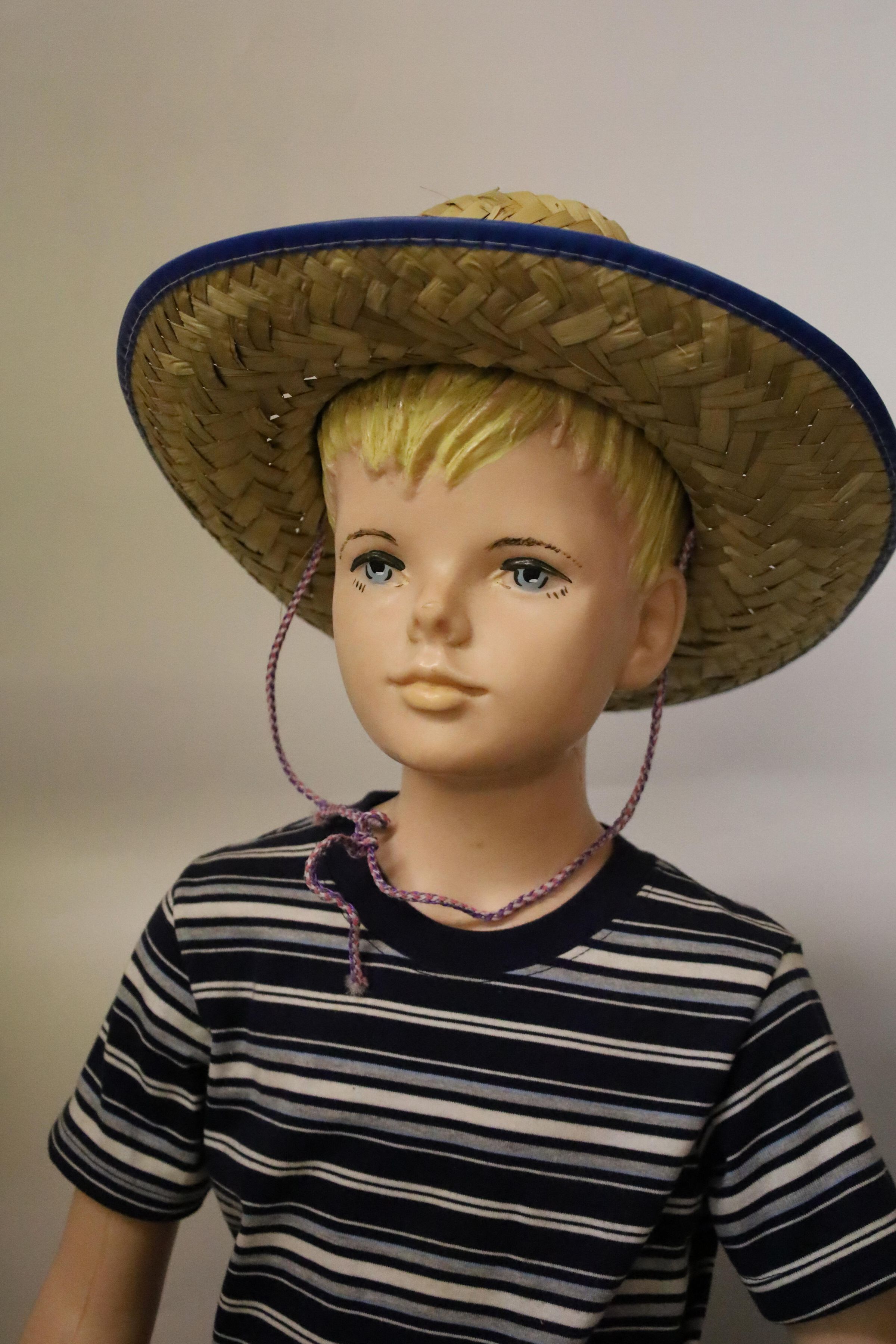This 1950s boy mannequin was used as a display for Buster Brown Shoes. He is now displayed at the Nature Center at Lake Loramie. He is wearing jeans with a rope belt, a striped tee-shirt and a straw hat.