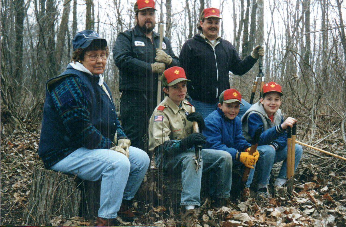 A group of boy scouts, their scout masters, and a state park naturalist take a break on a winter hike to pose for a picture.